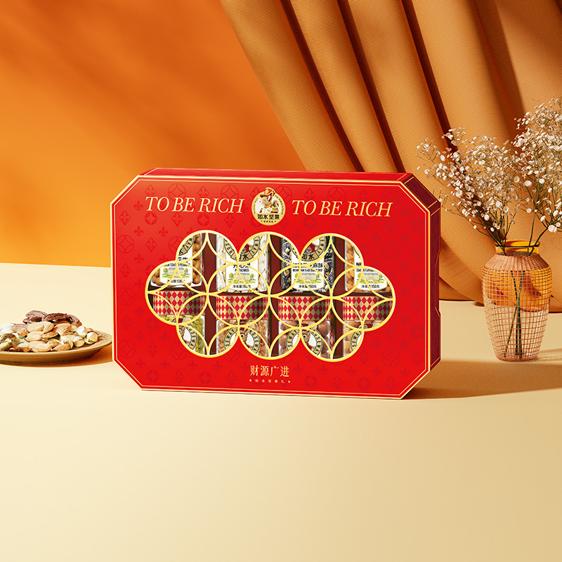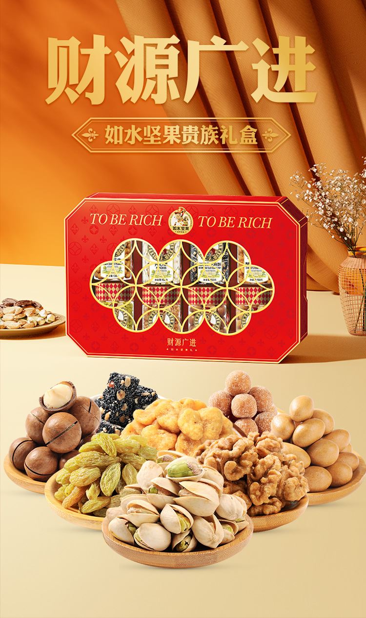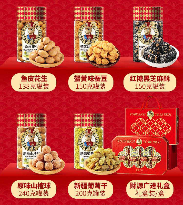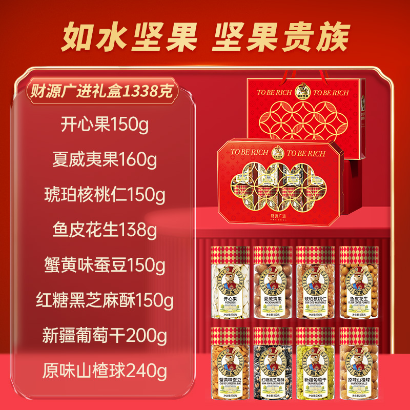 如水财源广进礼盒 净含量:1338g 如水开心果150g 如水夏威夷果160g 如水琥珀核桃仁150g 如水鱼皮花生138g 如水蟹黄味蚕豆150g 如水红糖黑芝麻酥150g 如水新疆葡萄干200g 如水原味山楂球240g
