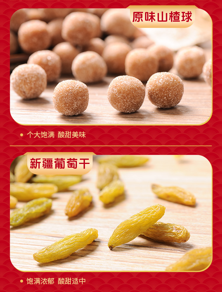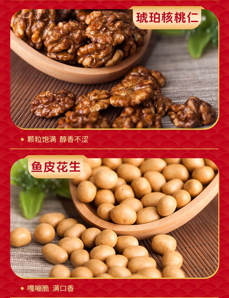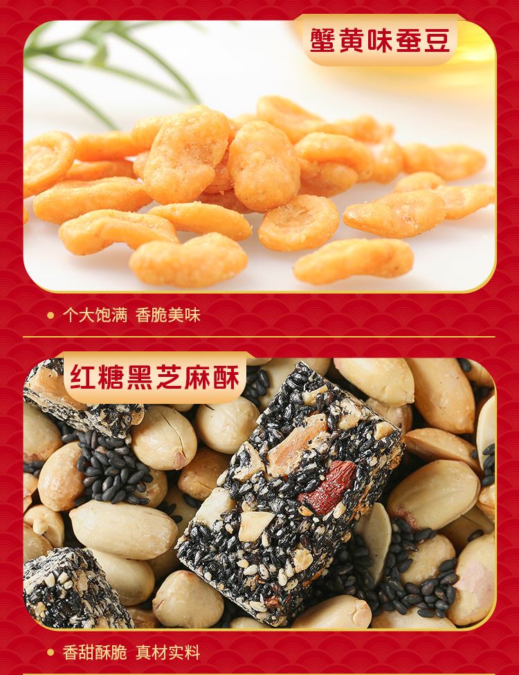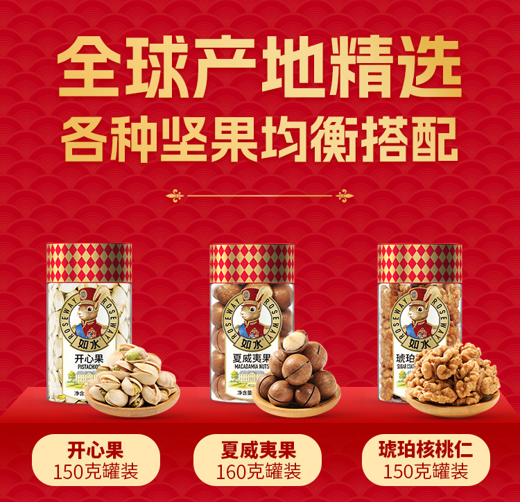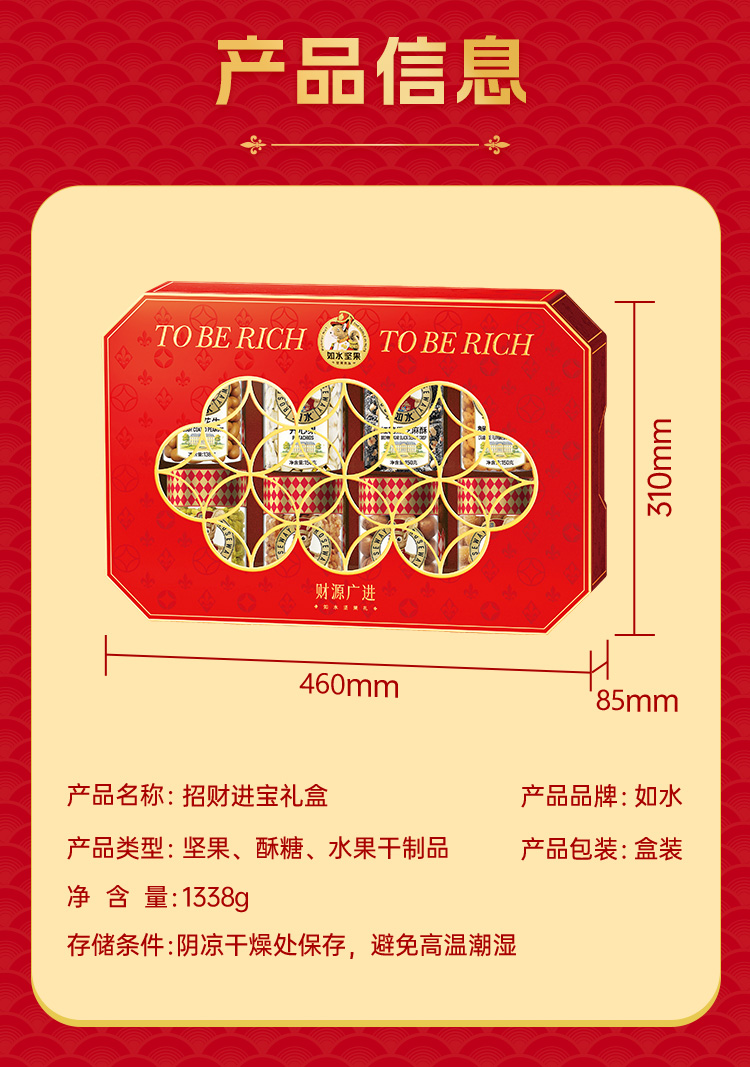 如水财源广进礼盒 净含量:1338g 如水开心果150g 如水夏威夷果160g 如水琥珀核桃仁150g 如水鱼皮花生138g 如水蟹黄味蚕豆150g 如水红糖黑芝麻酥150g 如水新疆葡萄干200g 如水原味山楂球240g