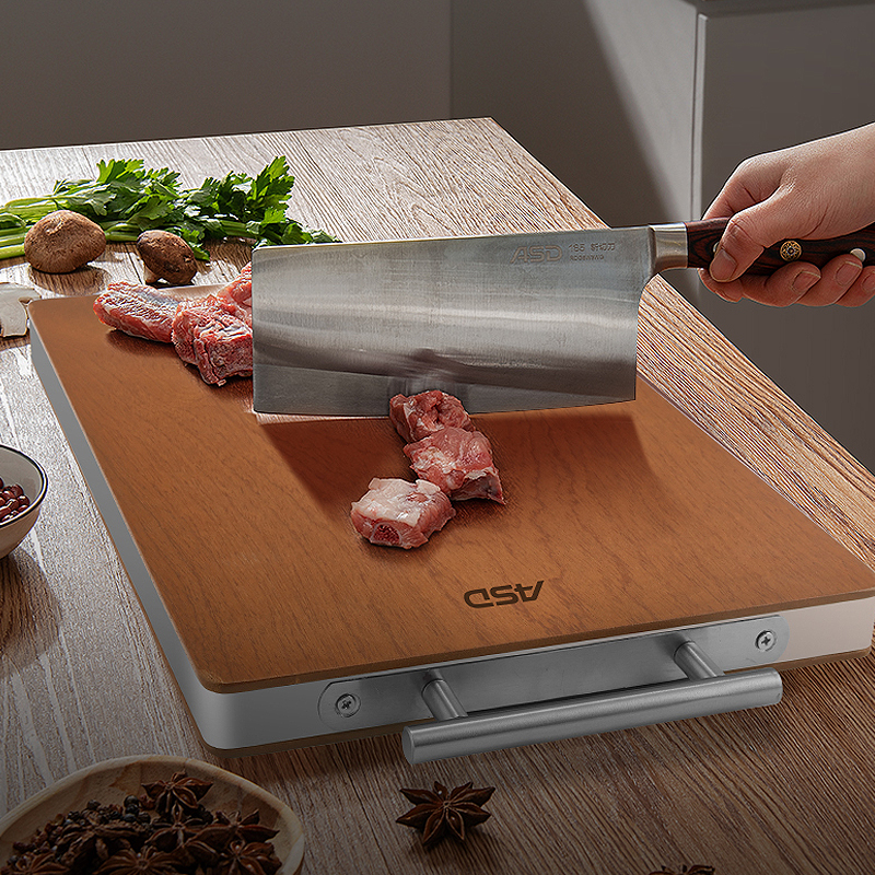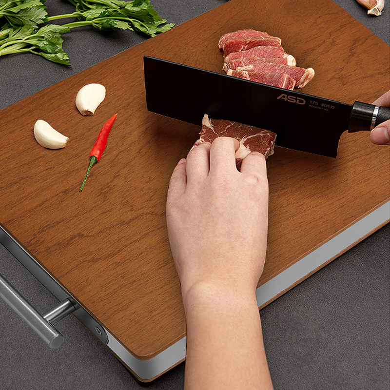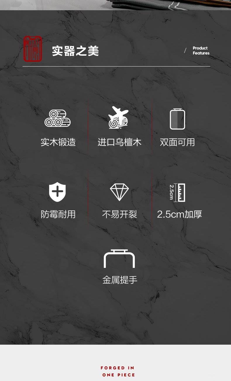 产品型号:RGM30G8Q 产品尺寸:425*270*215 产品净重:1.9kg 1、实木锻造,进口乌檀木,双面可用。 2、防霉耐用,不易开裂,2.5cm加厚。 3、金属提手,圆润适手,圆滑边缘。 4、木质密实,纹理清晰可见,无毛刺,不划手。 5、金属包边,加固结构,经久耐用