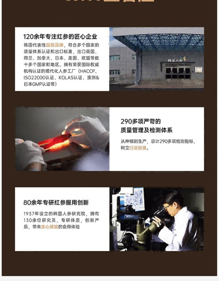 独特的煎煮工艺。以适合红参功效析出的87°,慢煎24小时一次性提取,入口清醇,苦味减少,风味清醇浓厚。