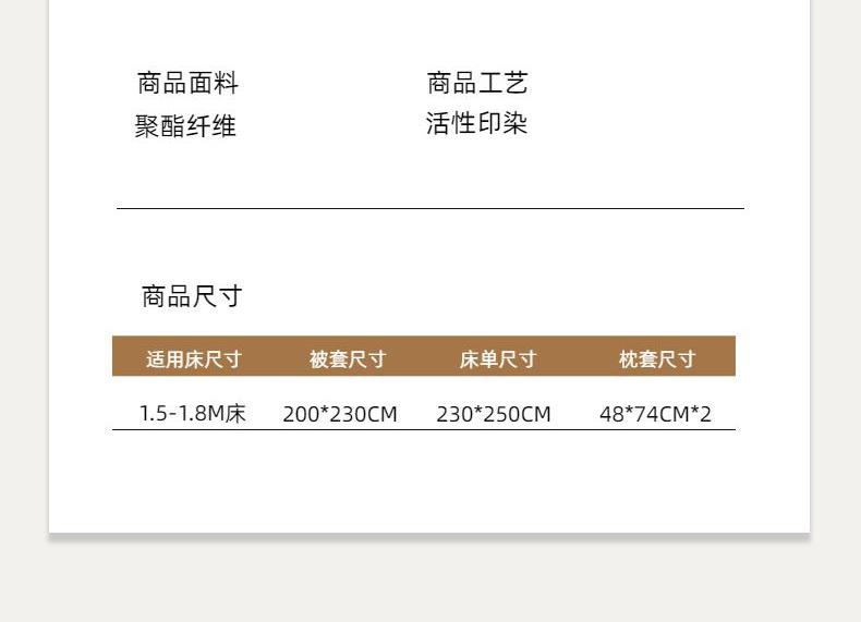 产品规格:被套200*230cm 床单 230*250cm 枕套48*74cm*2 面料材质:聚酯纤维 净 重:2.8kg 礼盒 尺寸:420*320*95mm