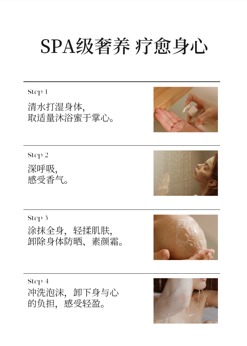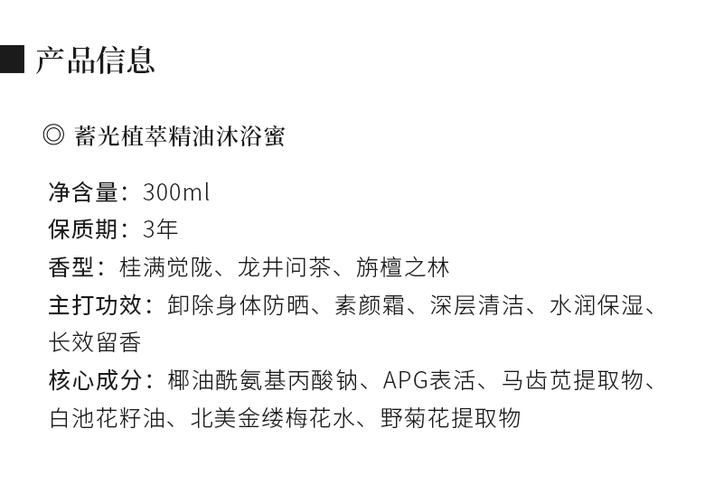 型号:沐浴蜜系列 容量:300ml 功效:滋润肌肤,缓解干燥,以油溶油 储存方法:阴凉干燥处保存