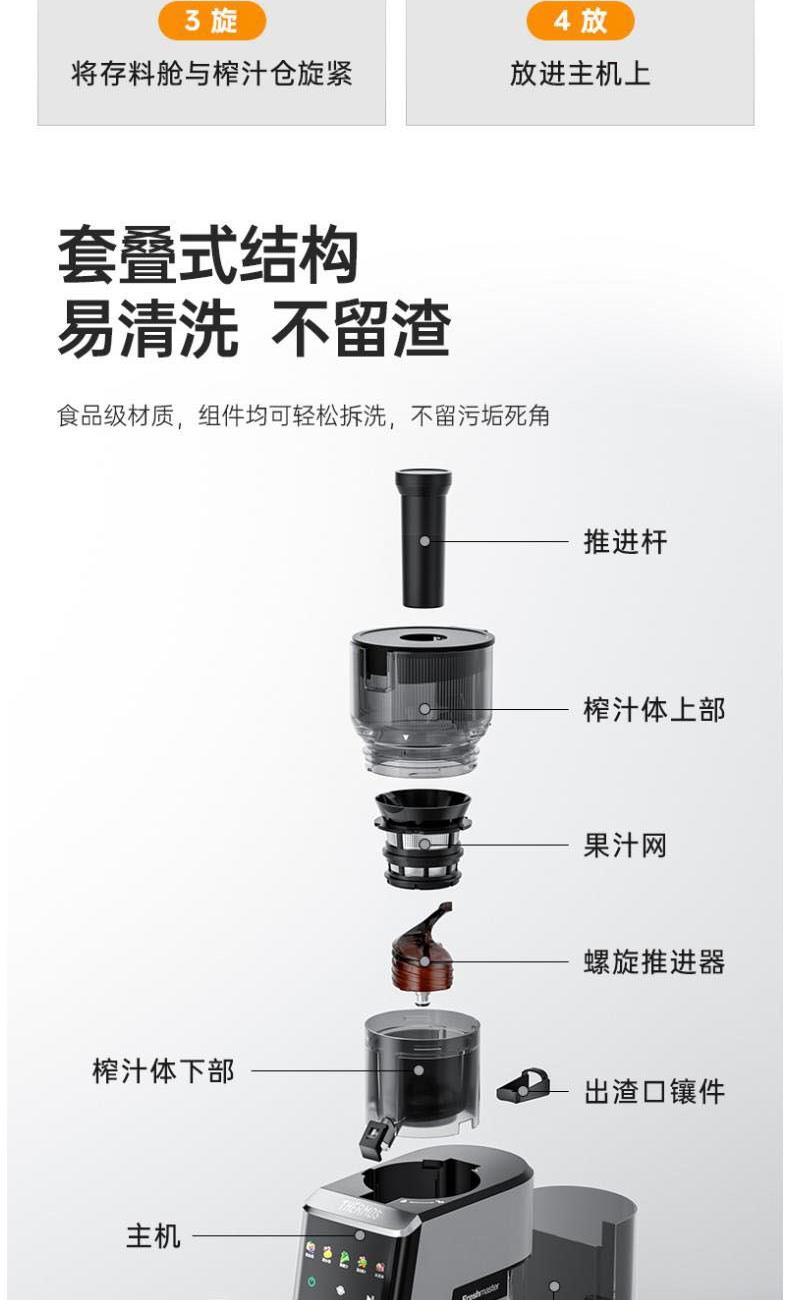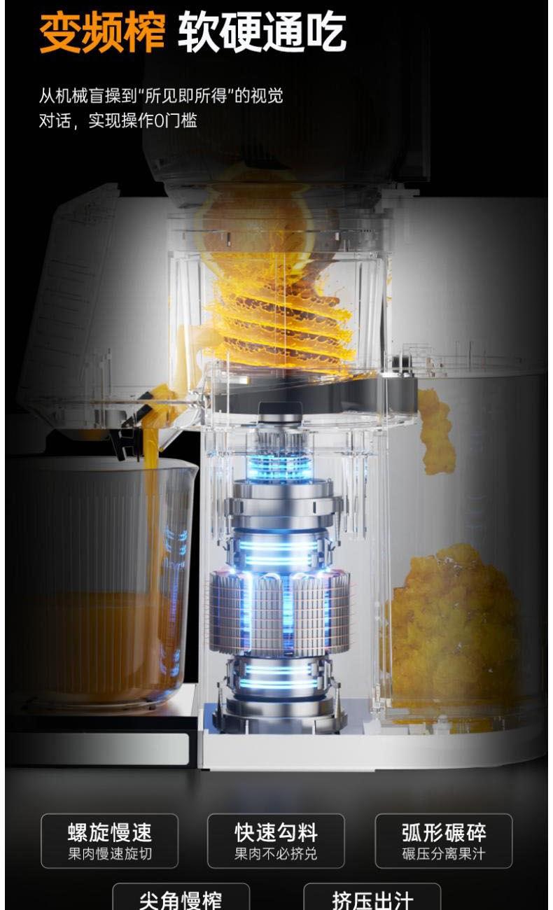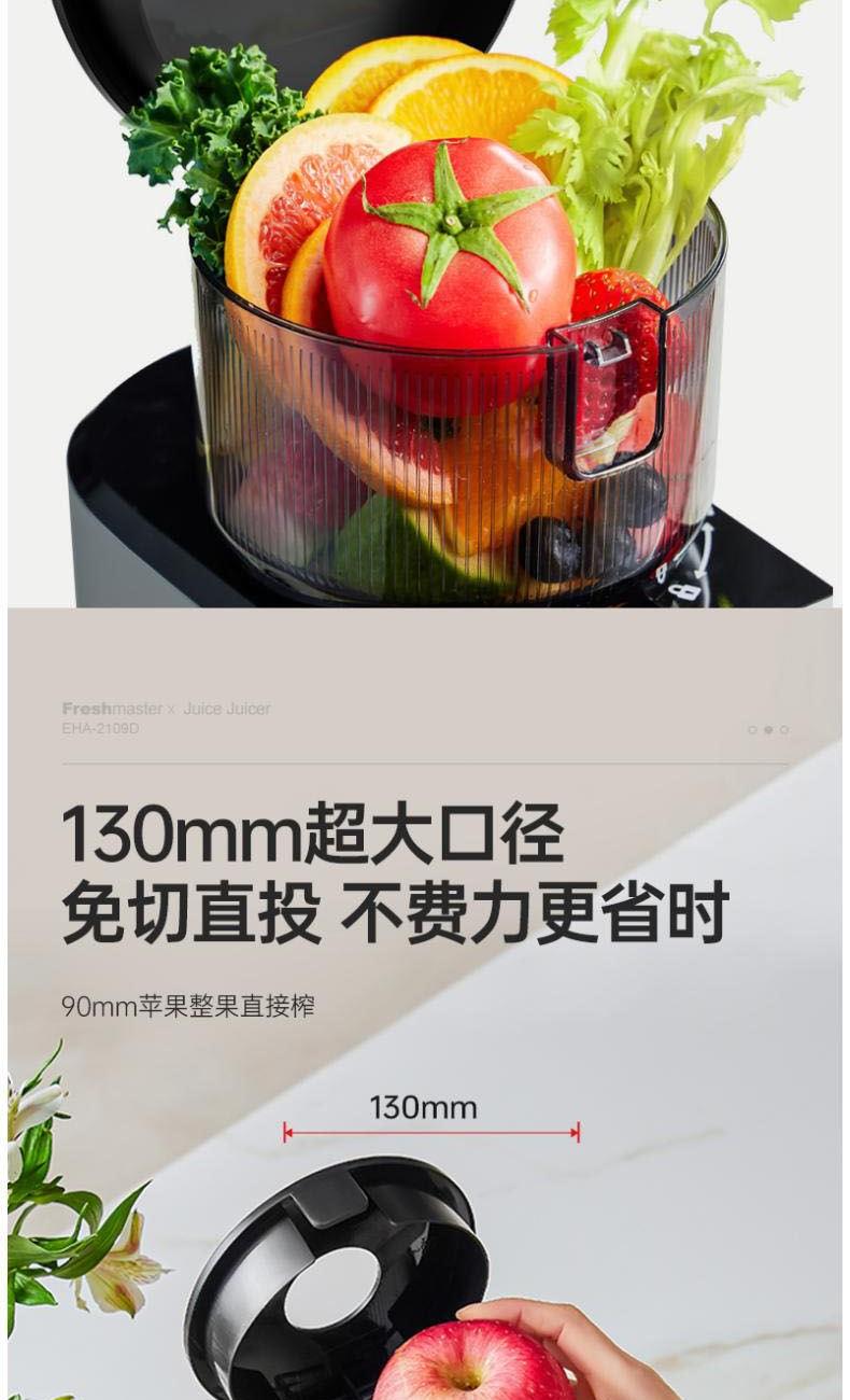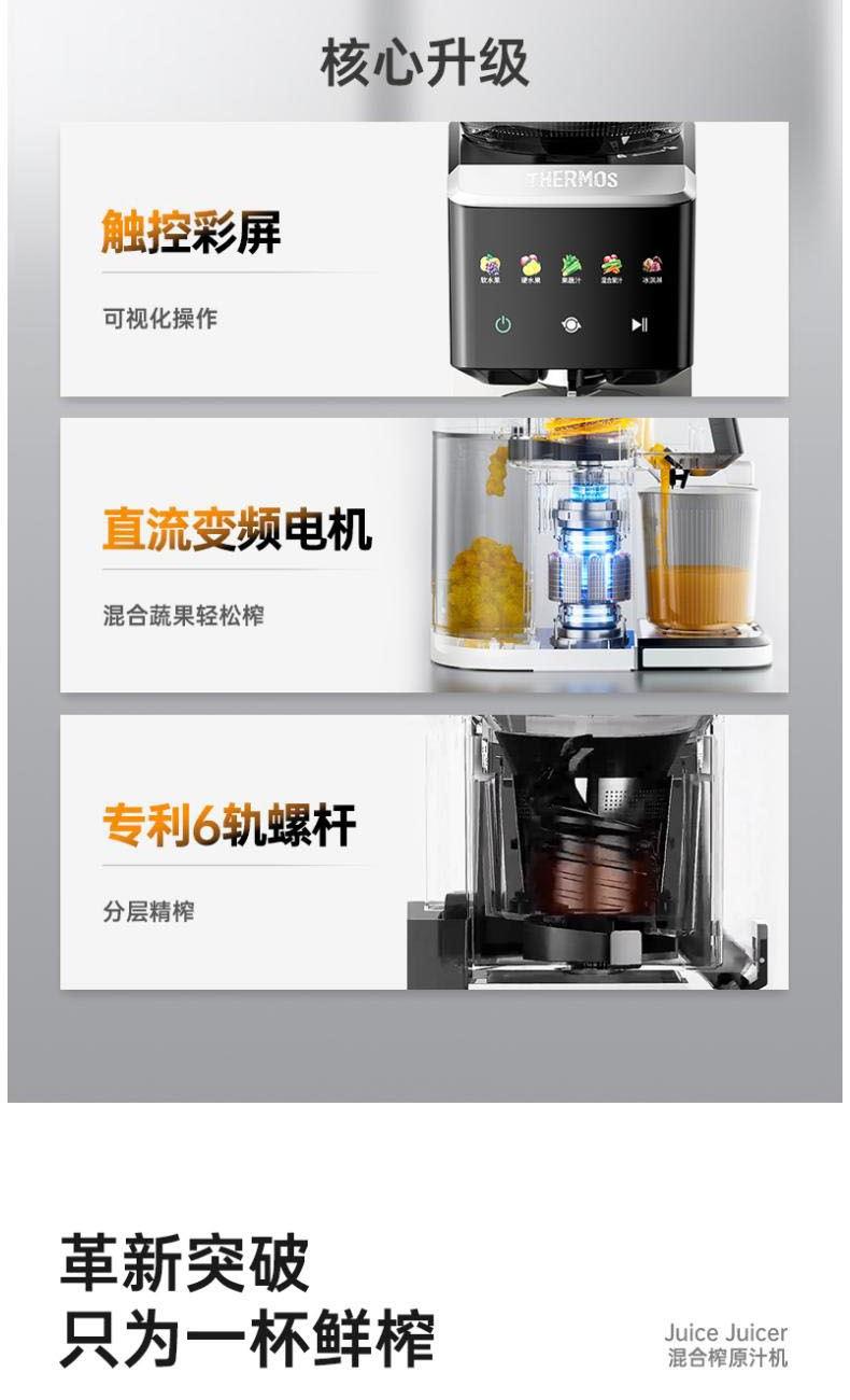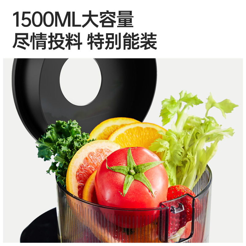 额定电压:220V 电机功率:额定100W,堵转200W 投料口径:130mm 下料口径:90mm 果渣杯容量:900mL 果汁杯容量:600mL 产品尺寸:278*140*383mm 包装尺寸:315*182*415 mm 产品重量:净重3.3kg,毛重4.2kg 电源线:1.2m,可拆式,8字接口 专有Freshmaster智能锁鲜榨技术 (通过独有的可控动力系统与程序,使食材破碎与榨汁的速度可控。以不同的程序匹配不同特性食材,兼顾榨汁流畅性,出汁效率与萃取的新鲜度,全面提升榨汁效果) 独有全面彩色触控屏幕 膳魔师专属钻石纹闪亮金属标 金属机身支架,有效提升机身强度与静音效果 轮盘式金属拨杆,不锈钢托盘面板 独有吧台式设计,和谐融入家居装饰 正面操作,免看护榨汁,享受生活,拒绝“干活”; 130mm超大口径,水果免切直榨; 1.5L大储料仓,免维护即榨即饮; 一体式榨汁模组,干湿分离易清洗; 专/利快拆式下锁螺杆,下料无阻碍,健康不磨粉; 专/利自适应拨杆式出汁开关; 后置隐藏式接渣仓;