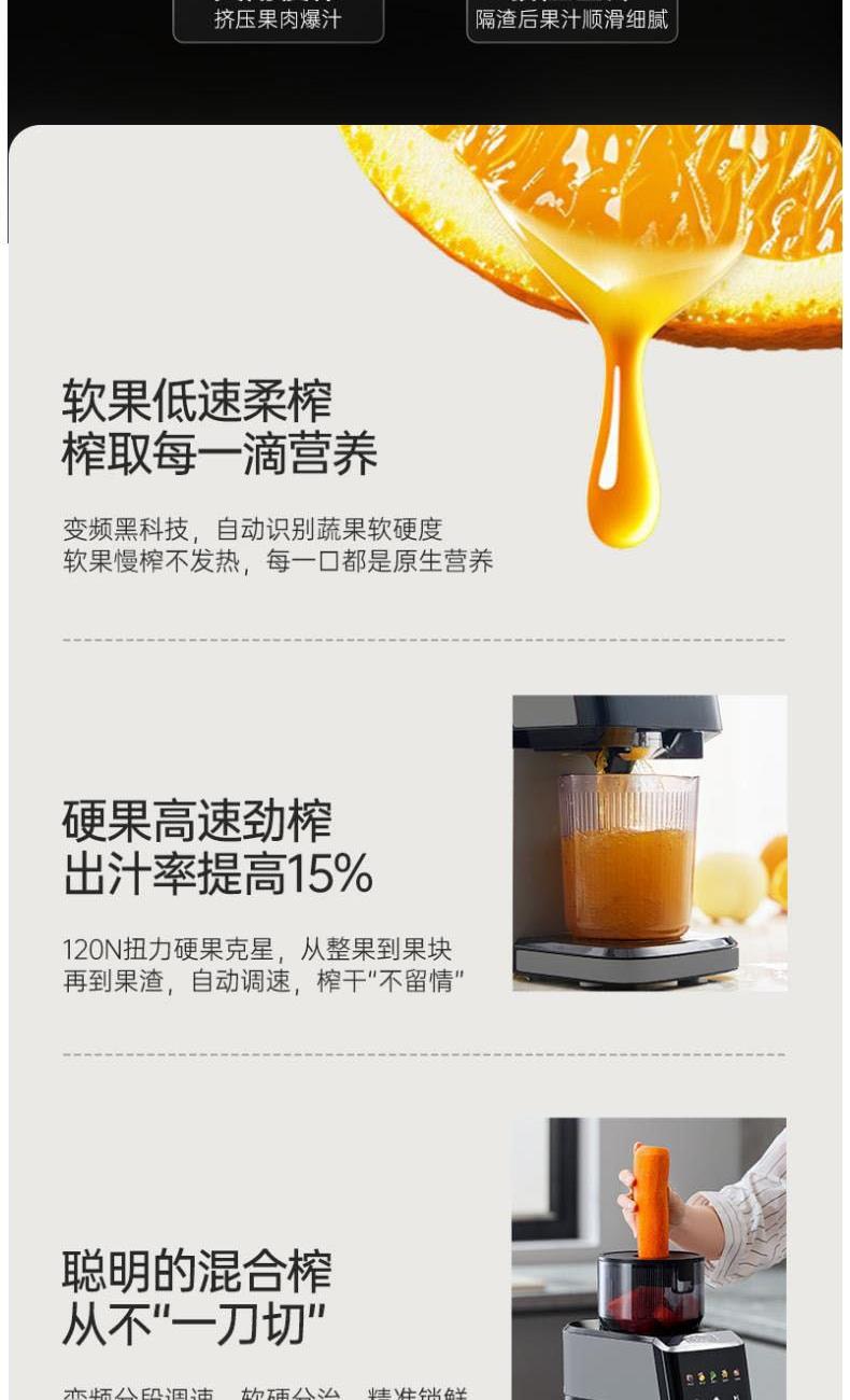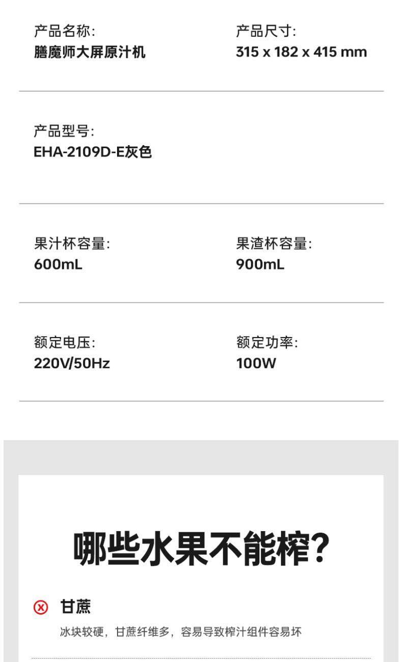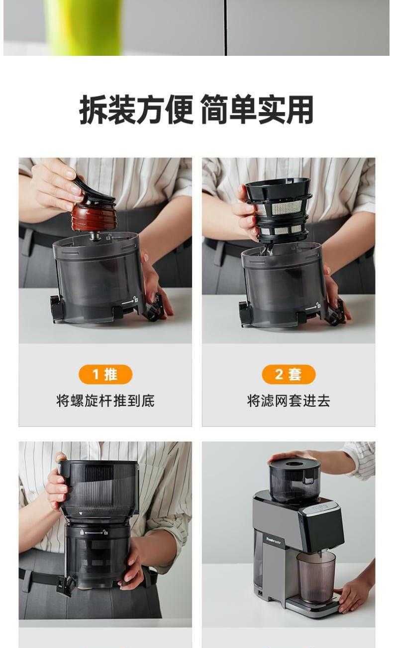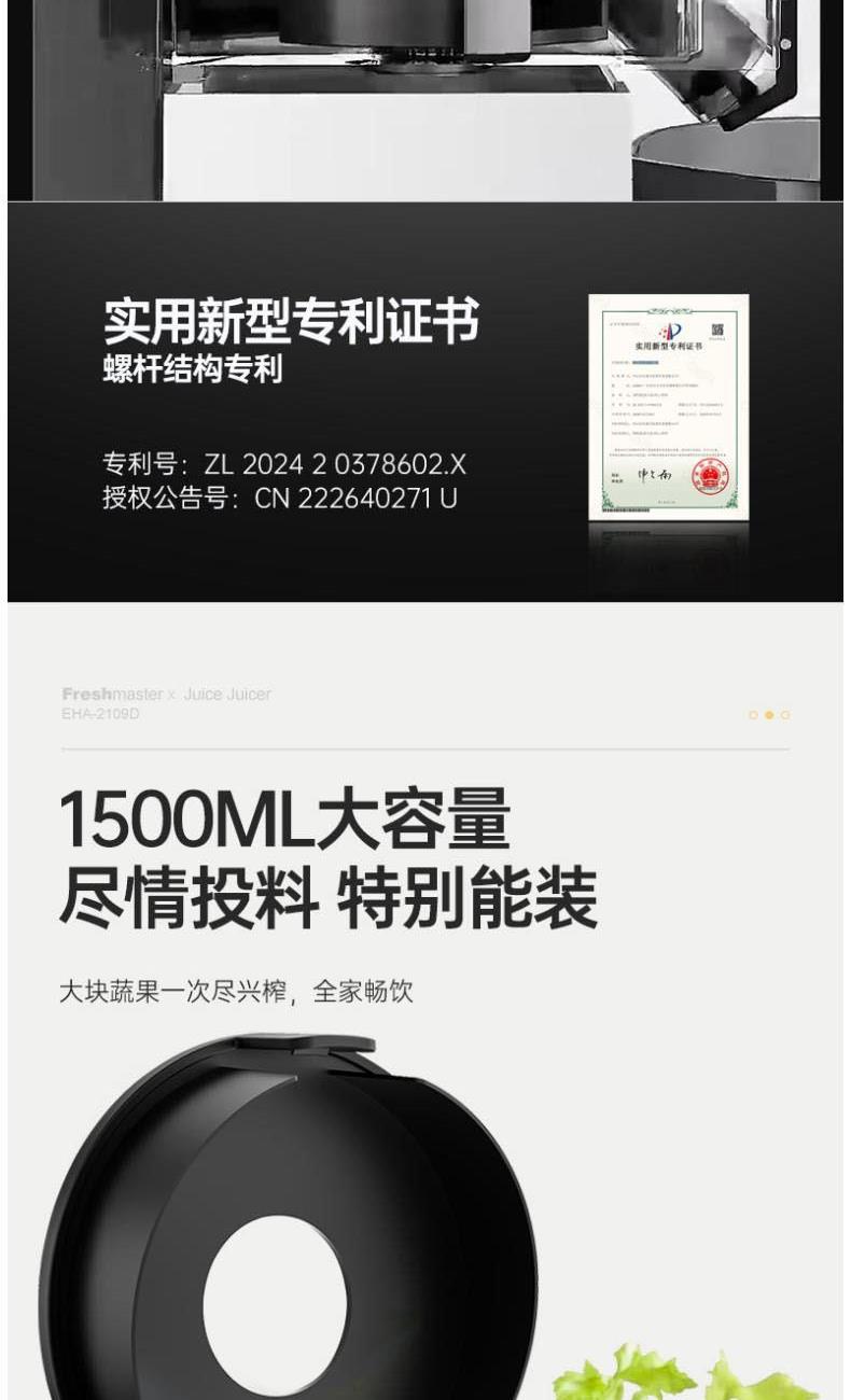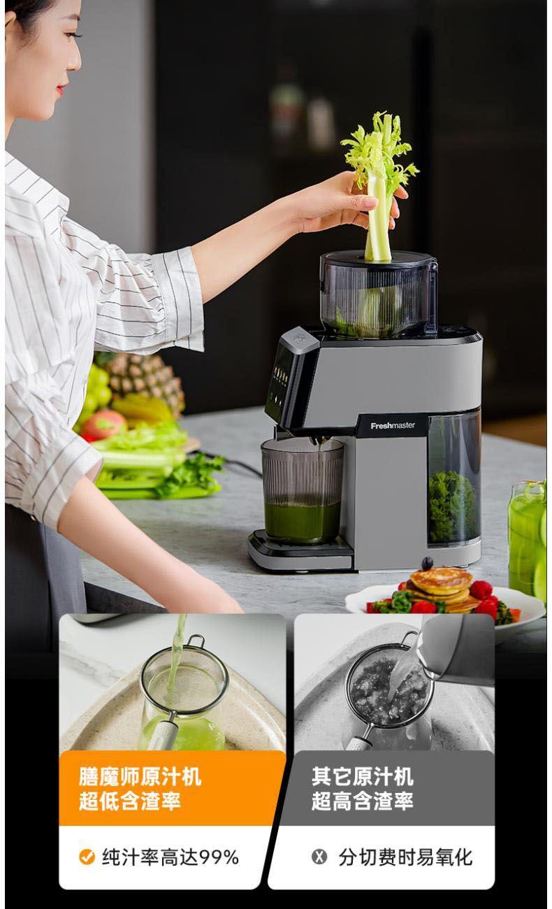 额定电压:220V 电机功率:额定100W,堵转200W 投料口径:130mm 下料口径:90mm 果渣杯容量:900mL 果汁杯容量:600mL 产品尺寸:278*140*383mm 包装尺寸:315*182*415 mm 产品重量:净重3.3kg,毛重4.2kg 电源线:1.2m,可拆式,8字接口 专有Freshmaster智能锁鲜榨技术 (通过独有的可控动力系统与程序,使食材破碎与榨汁的速度可控。以不同的程序匹配不同特性食材,兼顾榨汁流畅性,出汁效率与萃取的新鲜度,全面提升榨汁效果) 独有全面彩色触控屏幕 膳魔师专属钻石纹闪亮金属标 金属机身支架,有效提升机身强度与静音效果 轮盘式金属拨杆,不锈钢托盘面板 独有吧台式设计,和谐融入家居装饰 正面操作,免看护榨汁,享受生活,拒绝“干活”; 130mm超大口径,水果免切直榨; 1.5L大储料仓,免维护即榨即饮; 一体式榨汁模组,干湿分离易清洗; 专/利快拆式下锁螺杆,下料无阻碍,健康不磨粉; 专/利自适应拨杆式出汁开关; 后置隐藏式接渣仓;