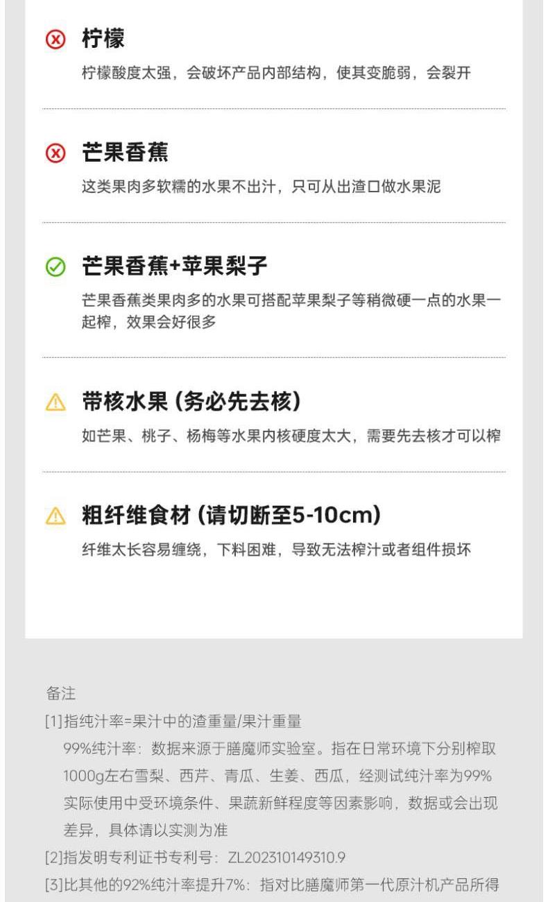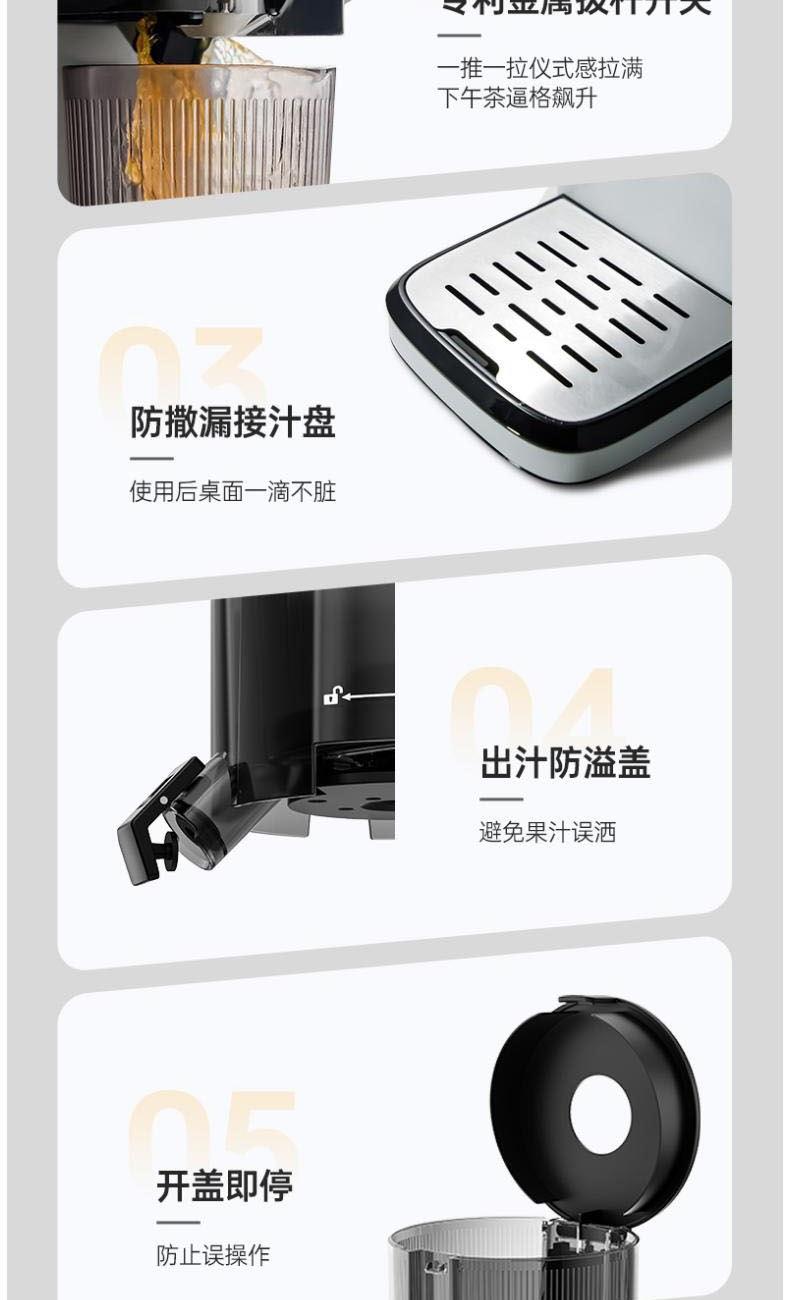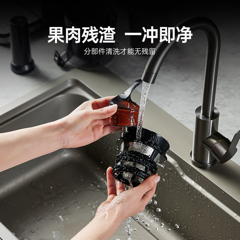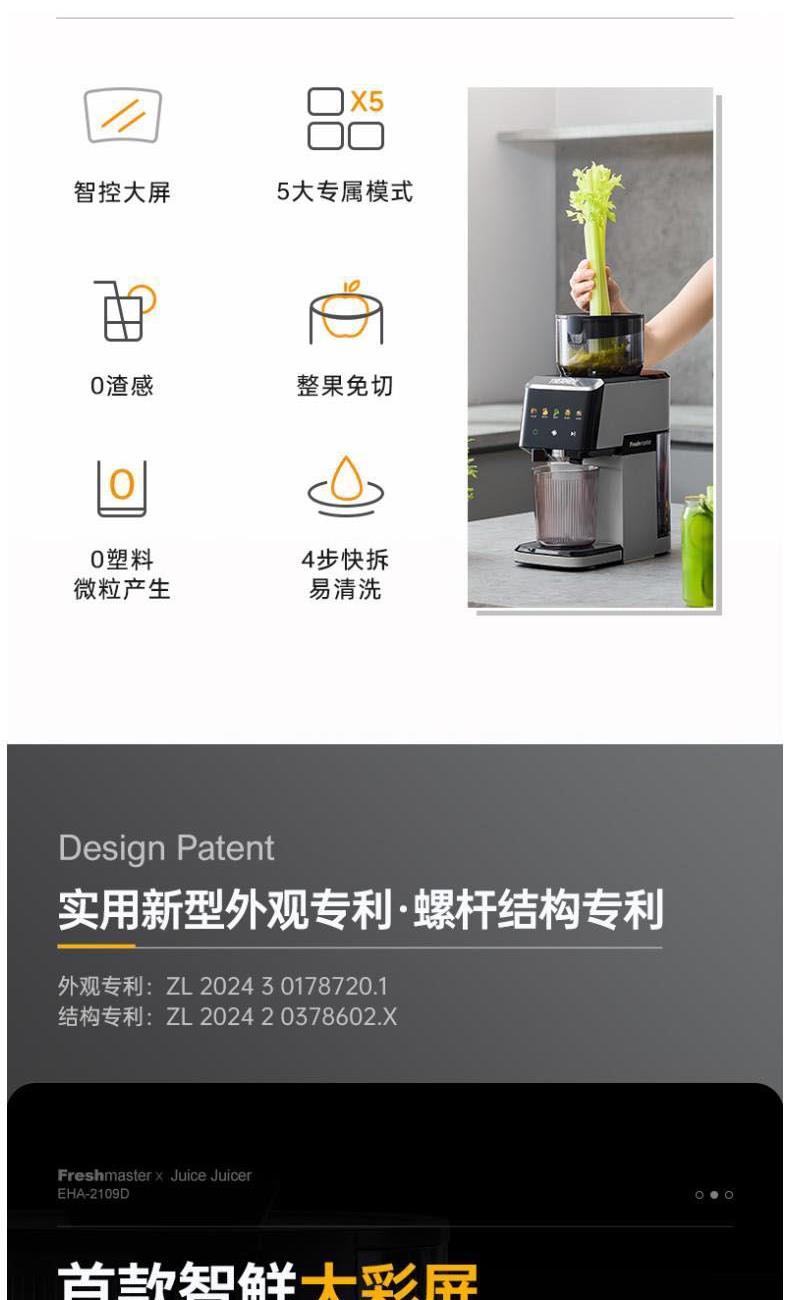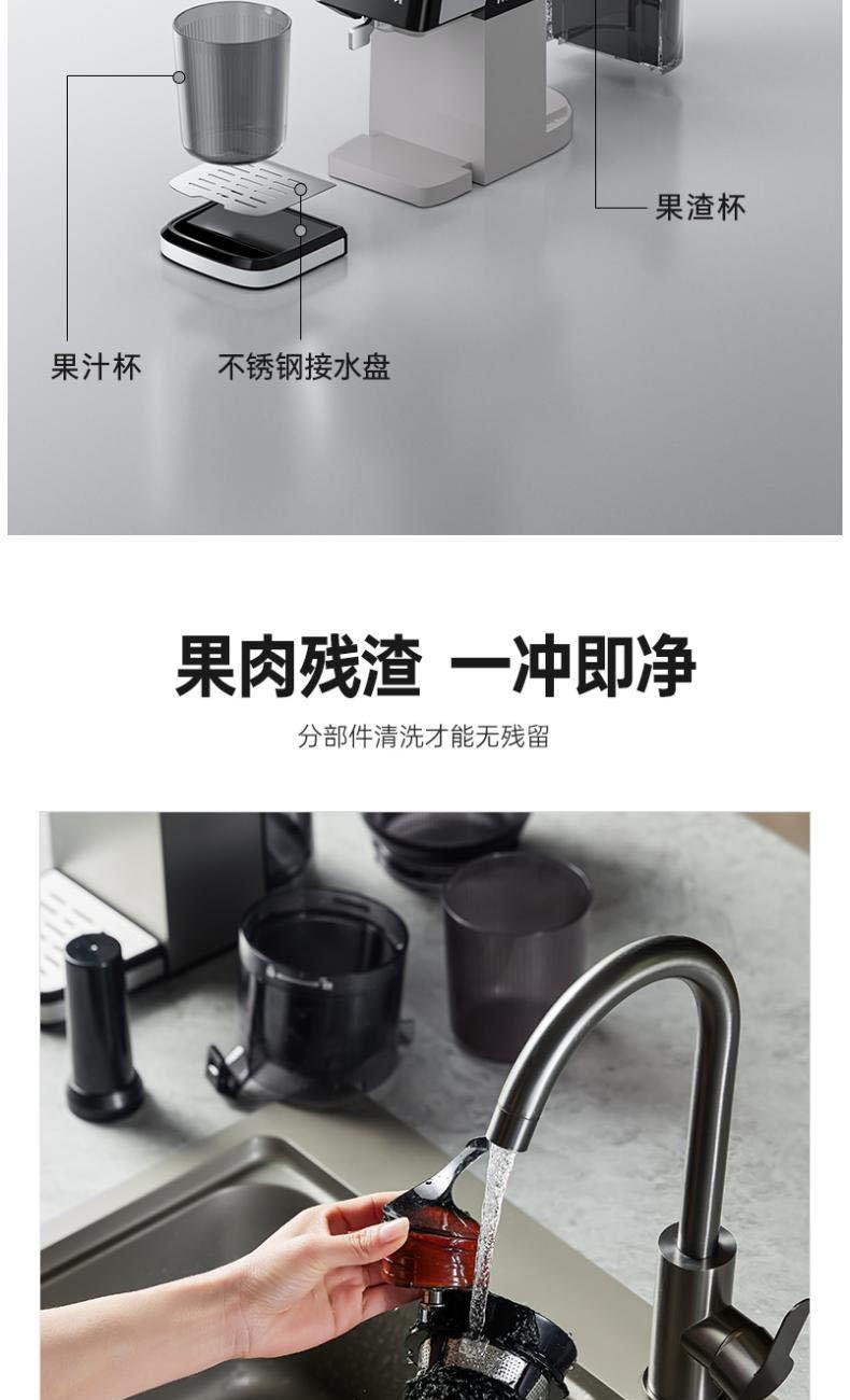 额定电压:220V 电机功率:额定100W,堵转200W 投料口径:130mm 下料口径:90mm 果渣杯容量:900mL 果汁杯容量:600mL 产品尺寸:278*140*383mm 包装尺寸:315*182*415 mm 产品重量:净重3.3kg,毛重4.2kg 电源线:1.2m,可拆式,8字接口 专有Freshmaster智能锁鲜榨技术 (通过独有的可控动力系统与程序,使食材破碎与榨汁的速度可控。以不同的程序匹配不同特性食材,兼顾榨汁流畅性,出汁效率与萃取的新鲜度,全面提升榨汁效果) 独有全面彩色触控屏幕 膳魔师专属钻石纹闪亮金属标 金属机身支架,有效提升机身强度与静音效果 轮盘式金属拨杆,不锈钢托盘面板 独有吧台式设计,和谐融入家居装饰 正面操作,免看护榨汁,享受生活,拒绝“干活”; 130mm超大口径,水果免切直榨; 1.5L大储料仓,免维护即榨即饮; 一体式榨汁模组,干湿分离易清洗; 专/利快拆式下锁螺杆,下料无阻碍,健康不磨粉; 专/利自适应拨杆式出汁开关; 后置隐藏式接渣仓;