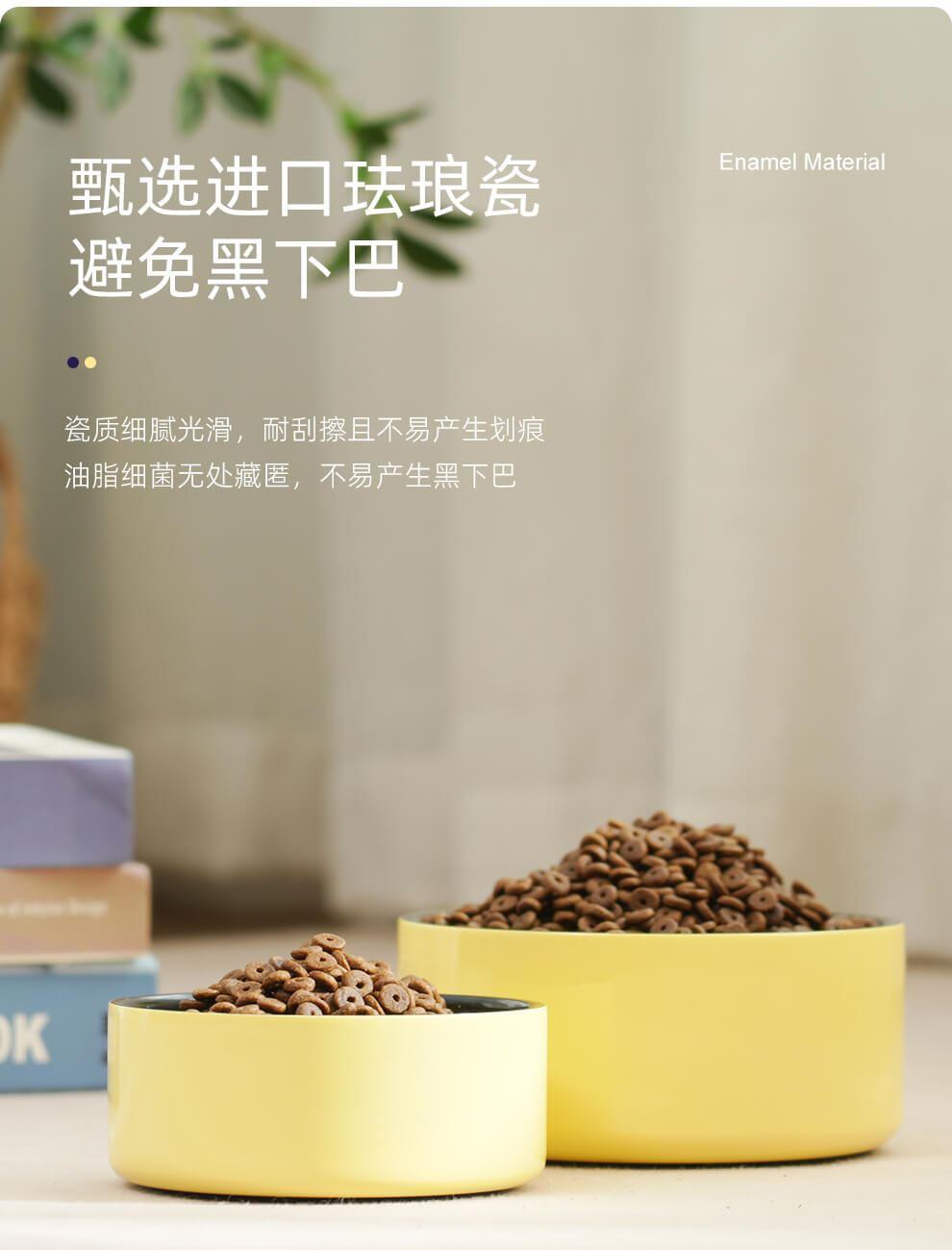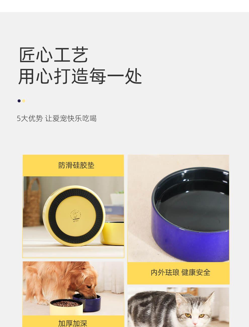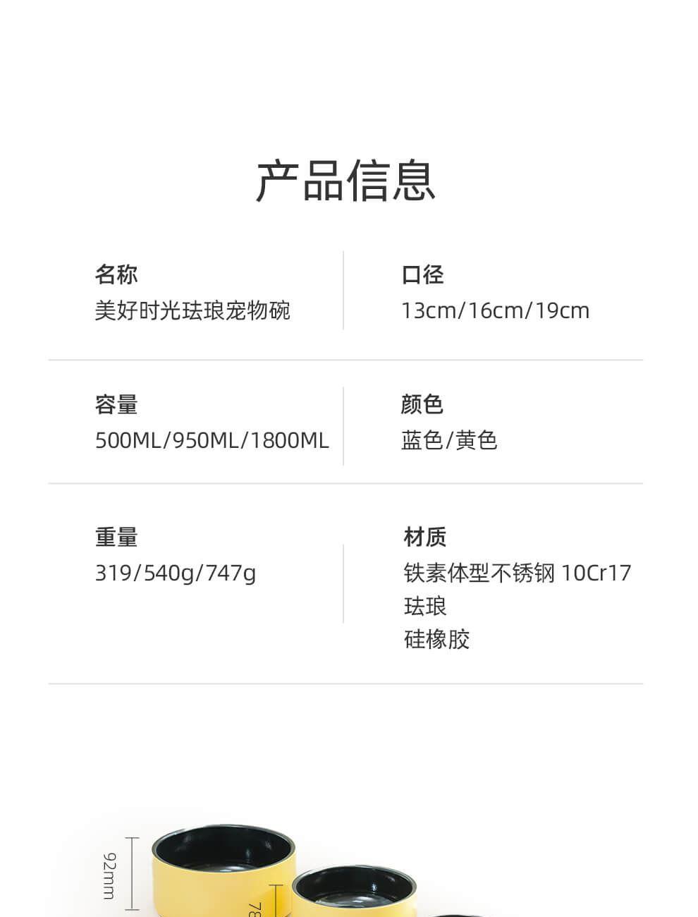 产品尺寸:口径13cm 产品容量:500ML 产品颜色:黄色、蓝色 产品材质:铁素体型不锈钢10Cr17、珐琅、硅橡胶 1、进口珐琅瓷避免黑下巴,耐刮擦油脂细菌无处藏匿; 2、加深加宽满足大饭量,大口径碗口,胡须不触壁 ,进食更轻松碗底加宽 & 硅胶防滑条设计,稳固不移防打翻 ; 3、光滑无毛边,爱宠吃喝不受伤,光滑釉面一冲即净。