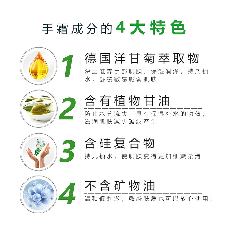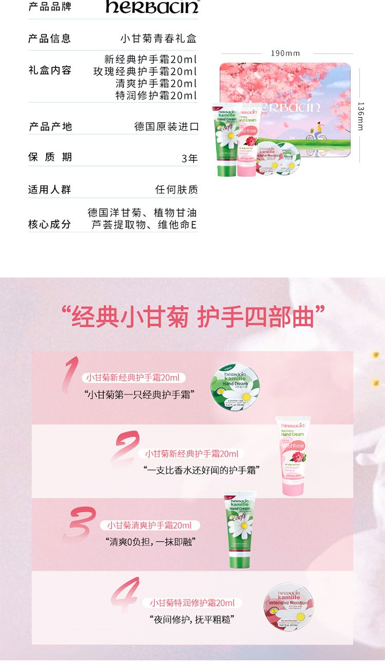 产地:德国 规格:玫瑰护手霜20ml、经典护手霜20ml 特润护手霜20ml、清爽护手霜20ml 功效:滋润手足、抚平粗糙、轻盈舒缓、补水防护、打造细化水嫩肌肤 保质期:4年 适合肤质:所有肌肤 礼盒尺寸:19*13.5*4 cm 条形码: 4013718083650