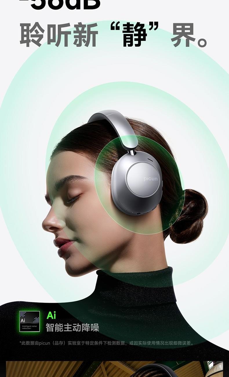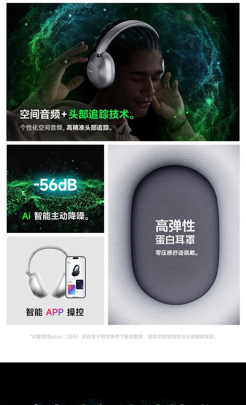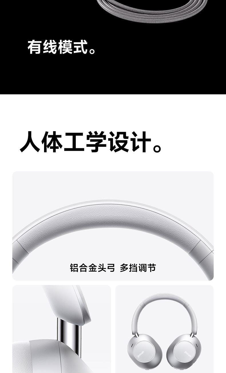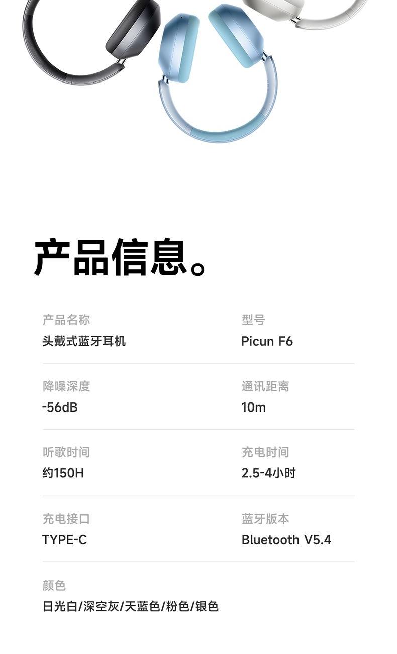 颜色:粉色、天蓝色、深空灰、银色、 连接模式:插音频线、蓝牙 蓝牙方案:JL7018 蓝牙版本:V5.4 电池容量:1200mAh 使用时间(70%音量):120小时, 开启降噪100小时 接受距离:10m 降噪深度:-35dB 频响范围:20HZ-20KHZ 喇叭尺寸:40mm 喇叭灵敏度:105±3dB(1khz) 充电接口:Type-c 1、支持【picun品存】APP智能互联控制 2、4麦阵列先进混馈降噪技术, 降噪深度达38DB 3、千元HIFI无损音质 大师级调教+自定义音效+空间音频 4、1200毫安大容量电池,zui高可支持120小时续航 5、支持头部追踪定位 6、全景声空间音频