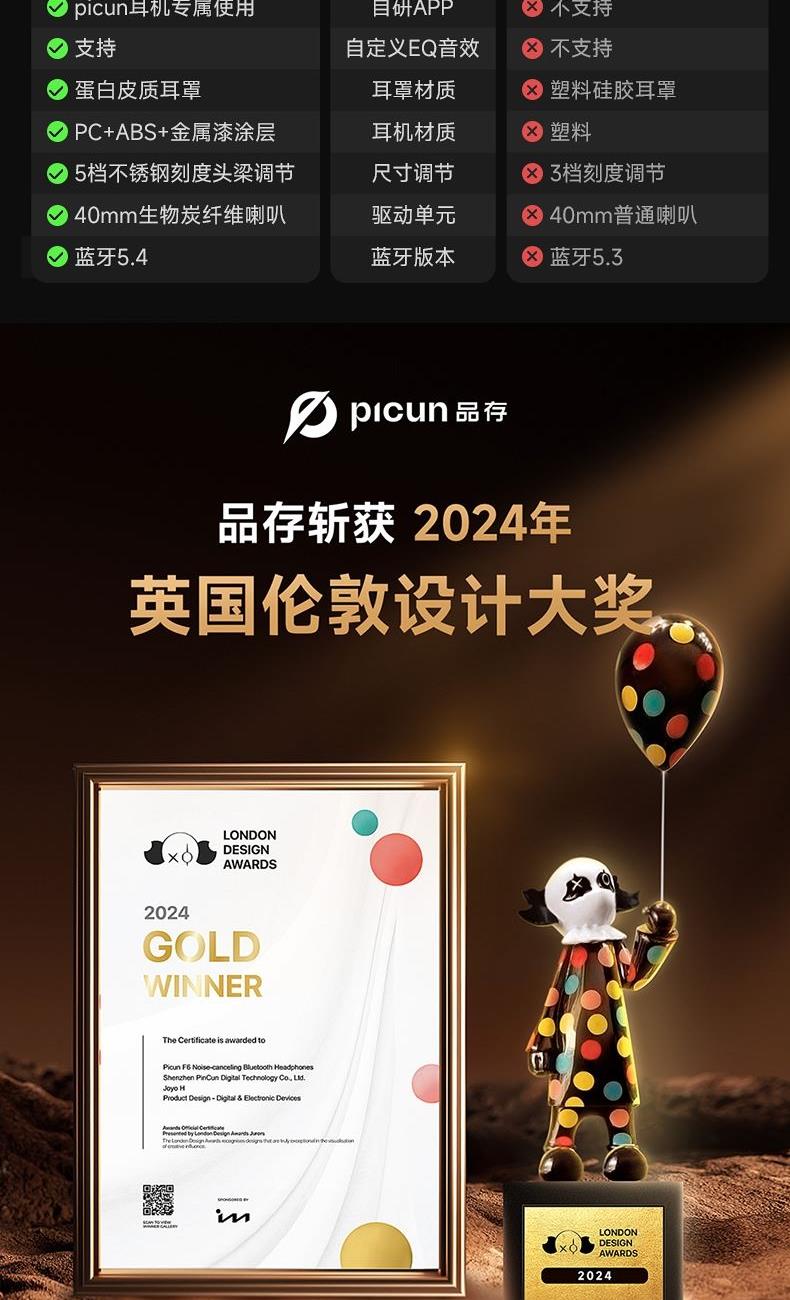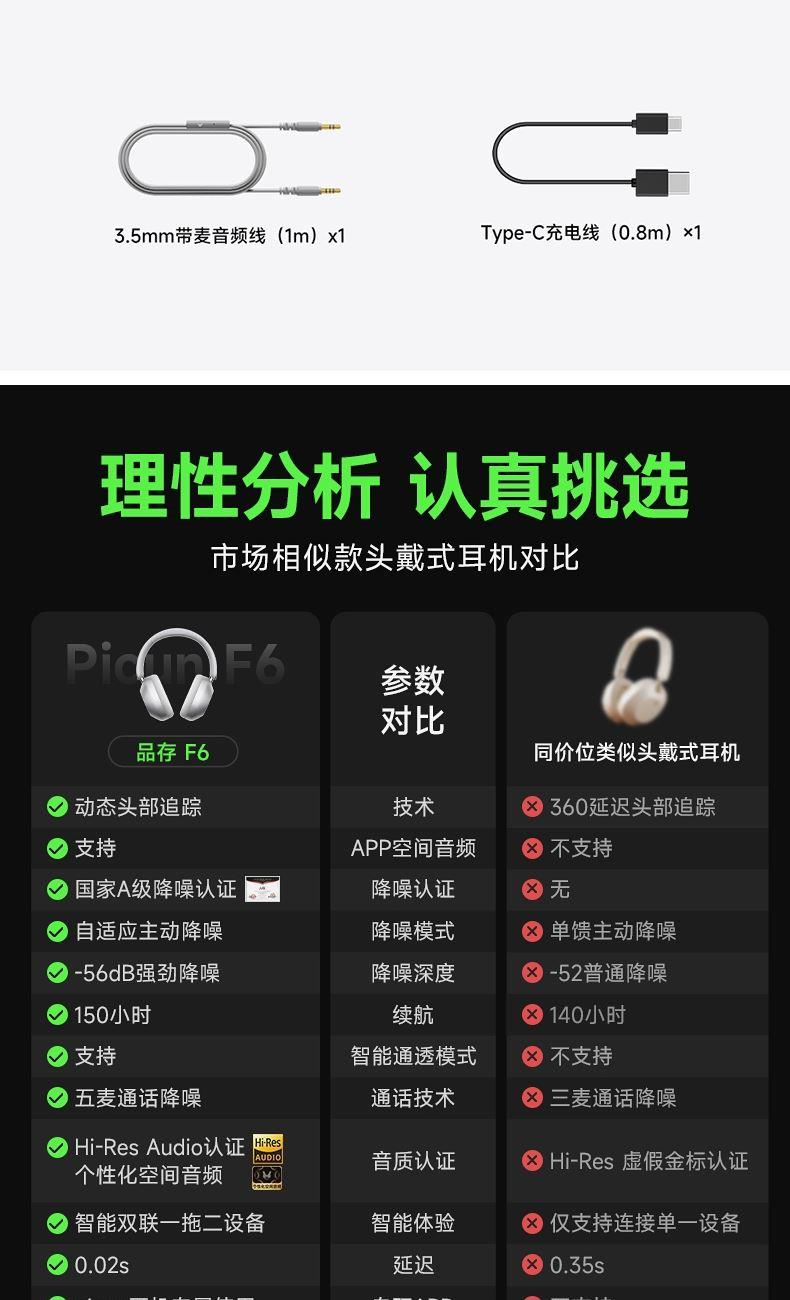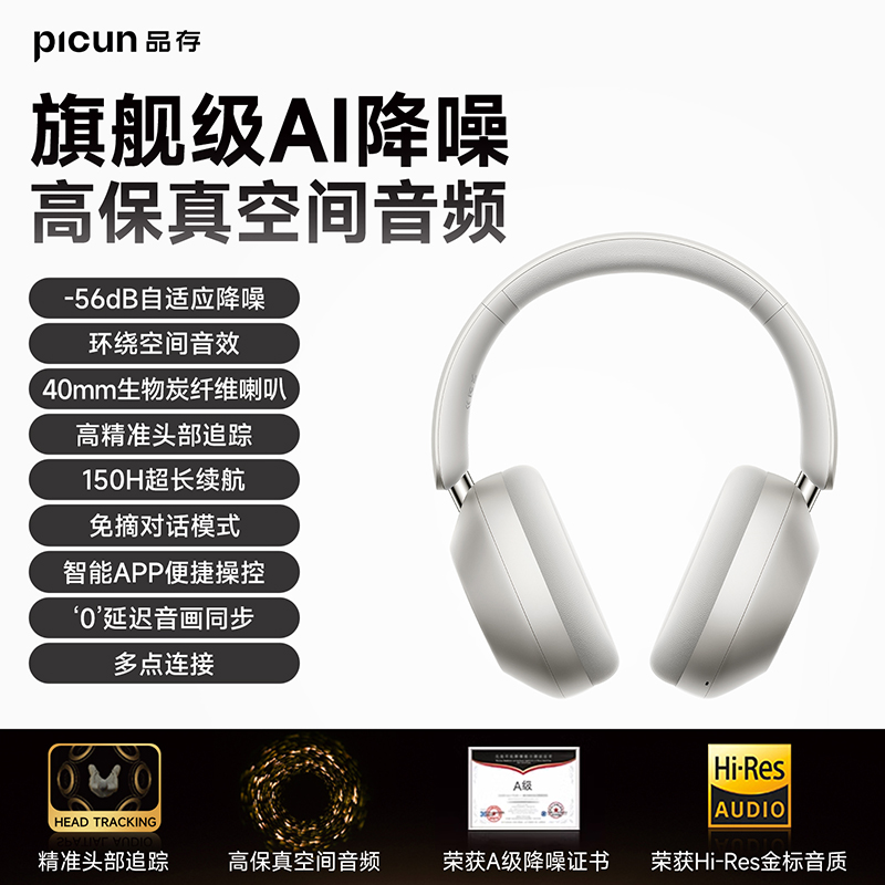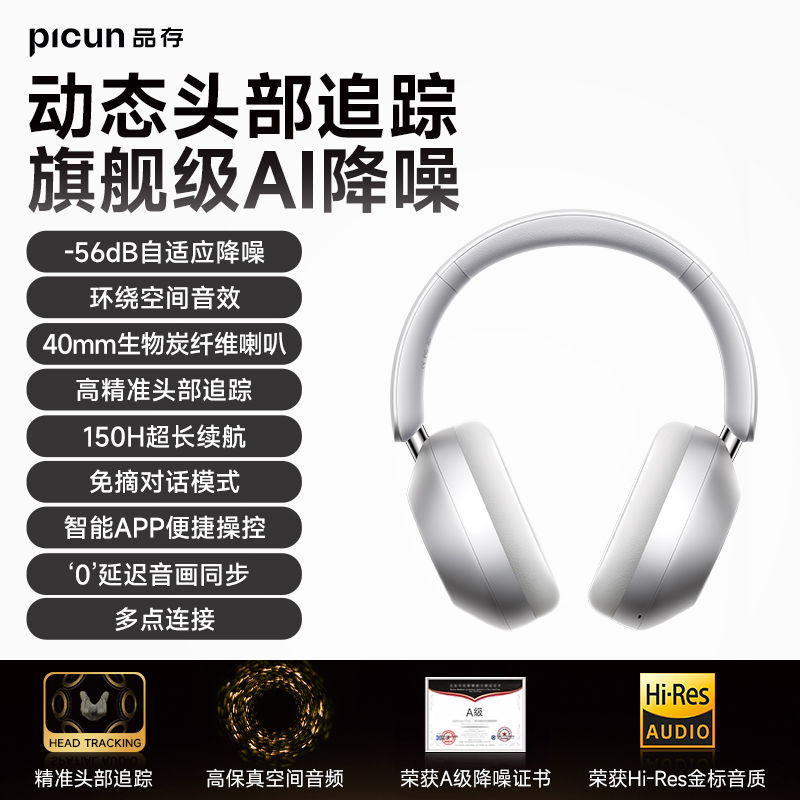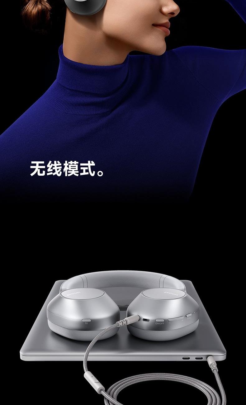 颜色:粉色、天蓝色、深空灰、银色、 连接模式:插音频线、蓝牙 蓝牙方案:JL7018 蓝牙版本:V5.4 电池容量:1200mAh 使用时间(70%音量):120小时, 开启降噪100小时 接受距离:10m 降噪深度:-35dB 频响范围:20HZ-20KHZ 喇叭尺寸:40mm 喇叭灵敏度:105±3dB(1khz) 充电接口:Type-c 1、支持【picun品存】APP智能互联控制 2、4麦阵列先进混馈降噪技术, 降噪深度达38DB 3、千元HIFI无损音质 大师级调教+自定义音效+空间音频 4、1200毫安大容量电池,zui高可支持120小时续航 5、支持头部追踪定位 6、全景声空间音频