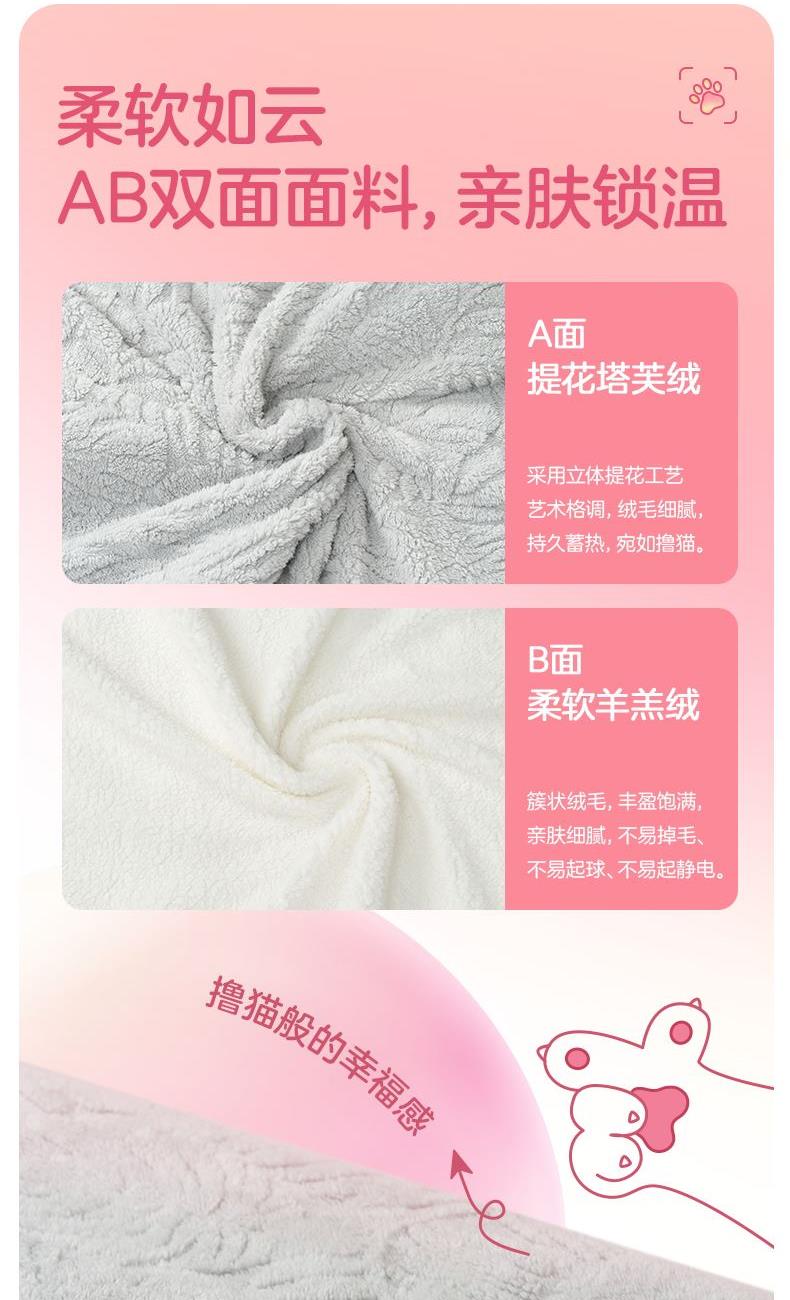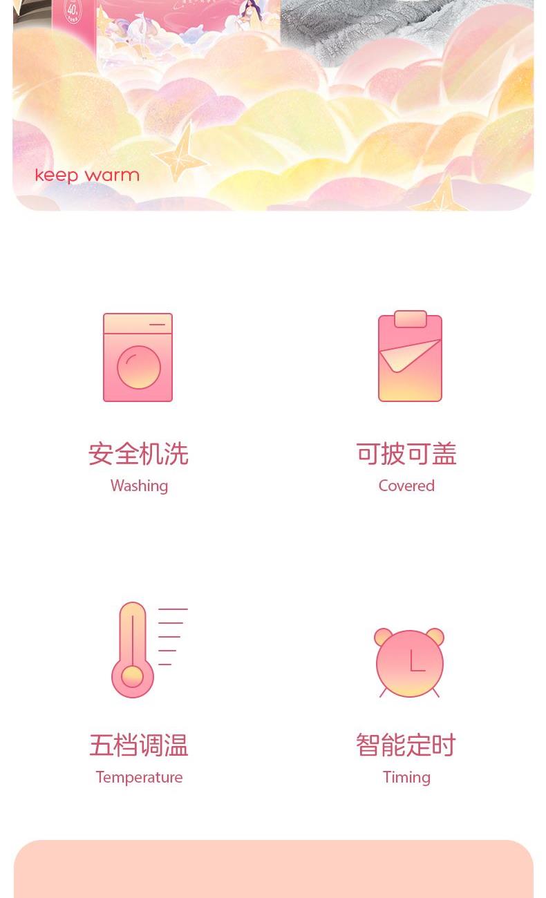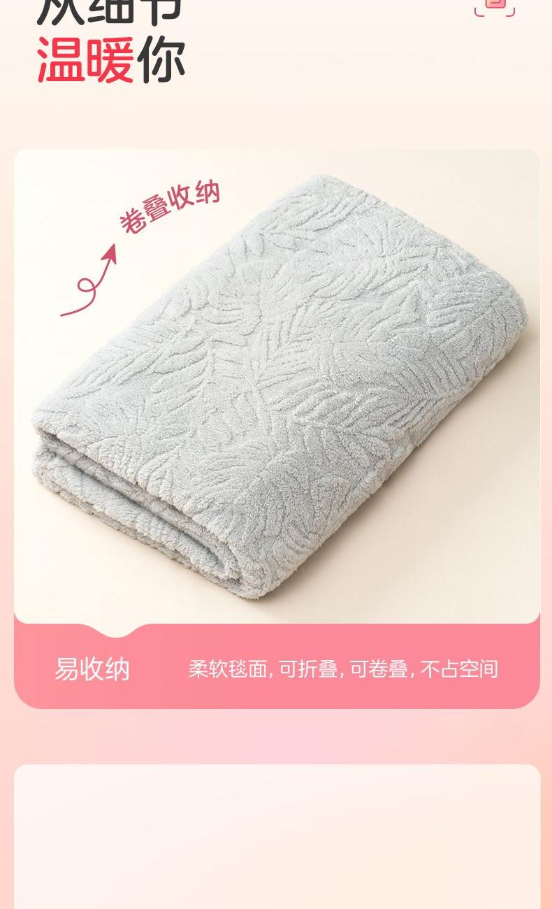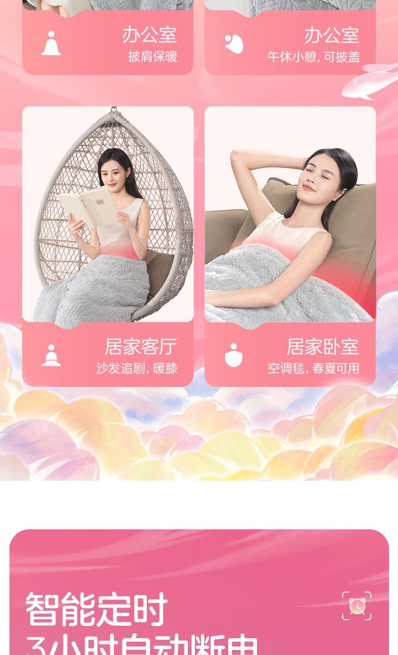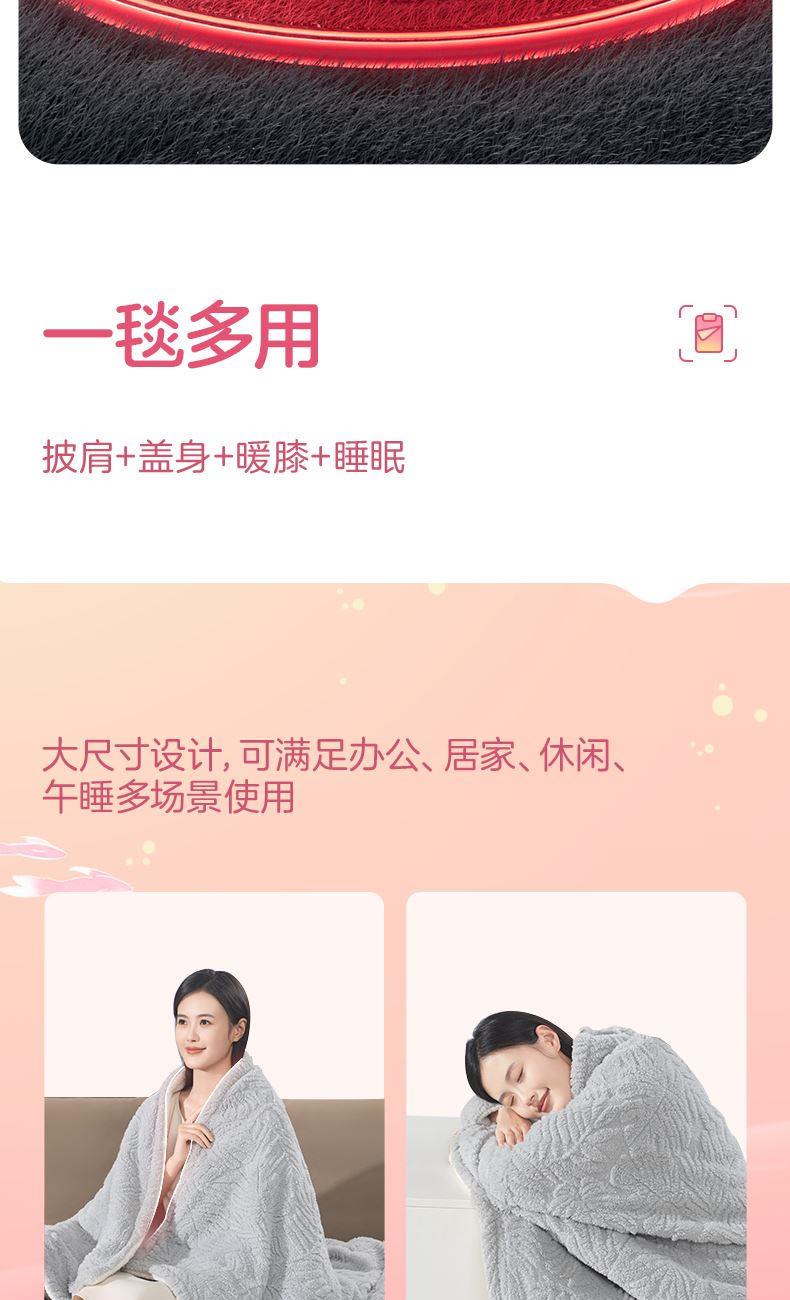 卖点 型号:TT160×130-1S 功率:150W 功能:5档调温,一毯多用,可水洗 开关:定时。 面料:提花塔芙绒+羊羔绒双面面料 包装:彩盒 参数 1、一毯多用:集披肩+盖身+暖腹+暖膝多形式保暖,满足办公、居家、休闲、午睡多场景使用。 2、五档调温,随心调节。 3、智能定时,3小时自动断电。 4、进口双螺旋发热线,多重防护,安全安心 5、提花塔芙绒+羊羔绒双面面料,云绒肤感,亲肤锁温。 6、便捷水洗,洁净无忧。 7、礼品属性,包装精美