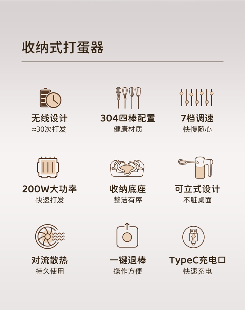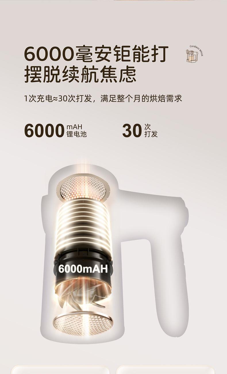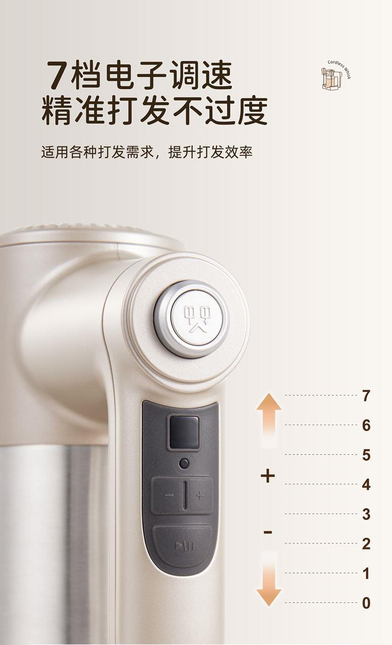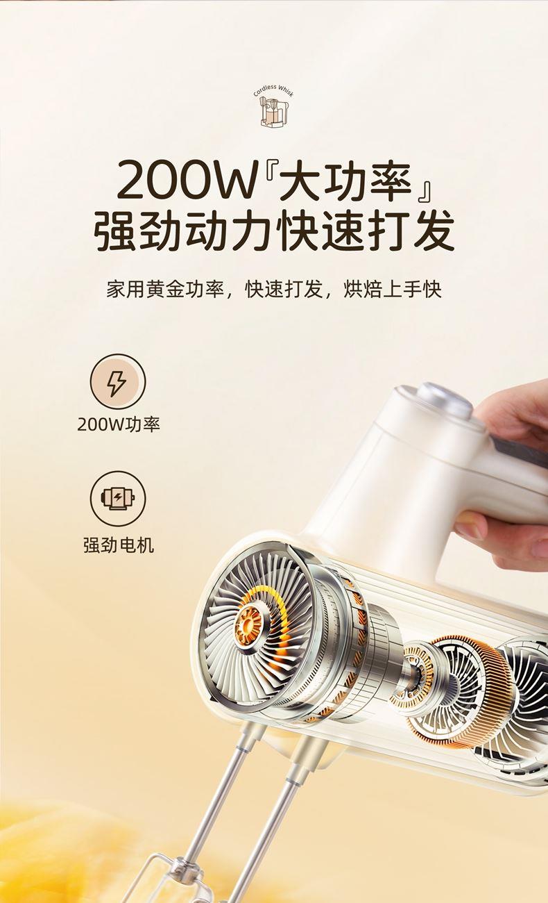 无线摆脱束缚 随拿随用; 7档调速,200w大功率直流电机轻音低噪不扰人; 升级4棒304不锈钢搅拌棒; typec充电,6000毫安充一次电能打发30次; 自带收纳盒 整洁好收纳;