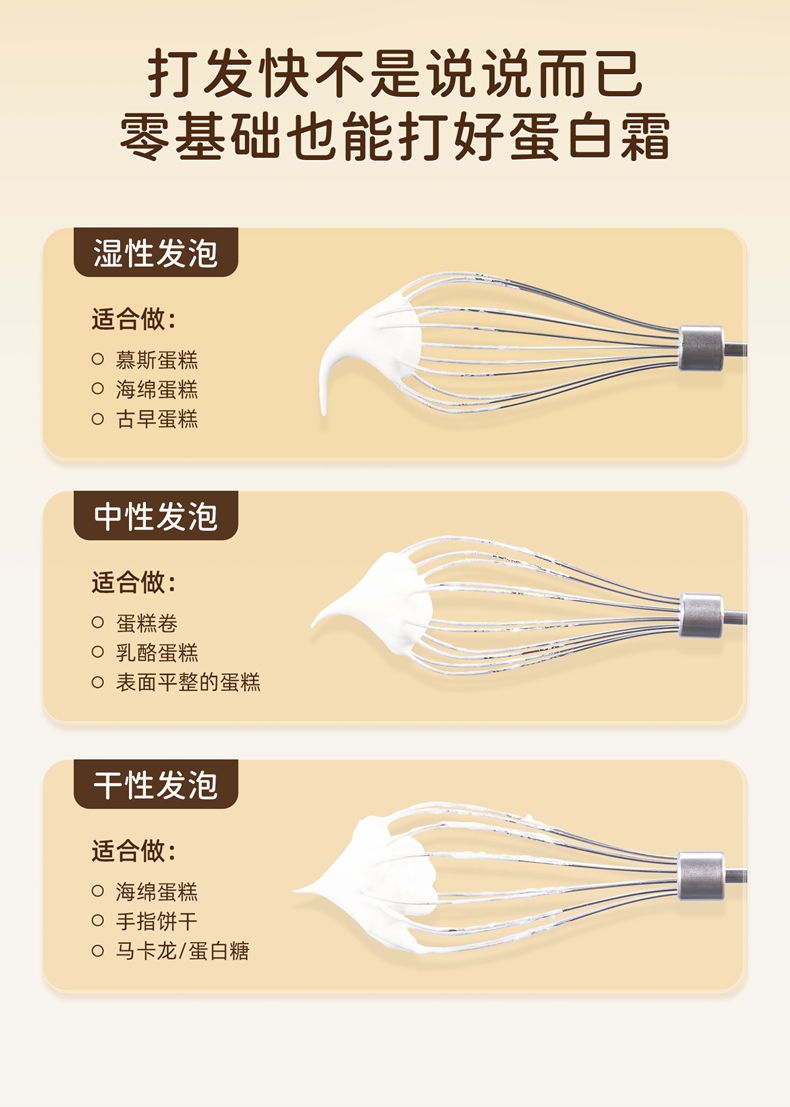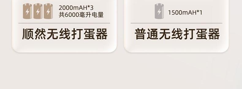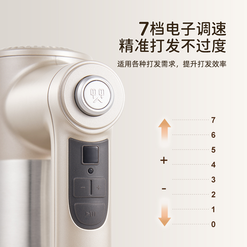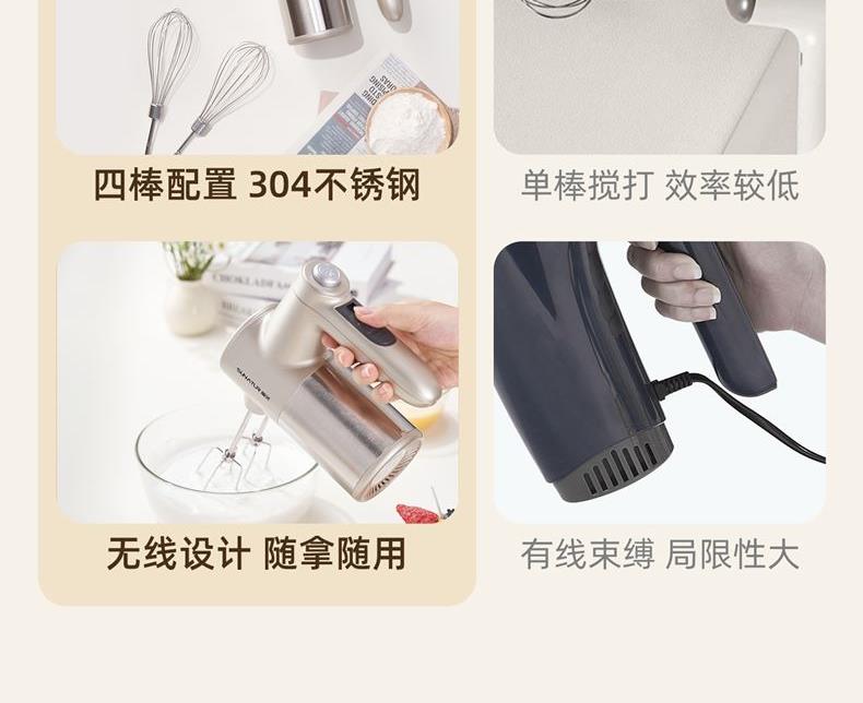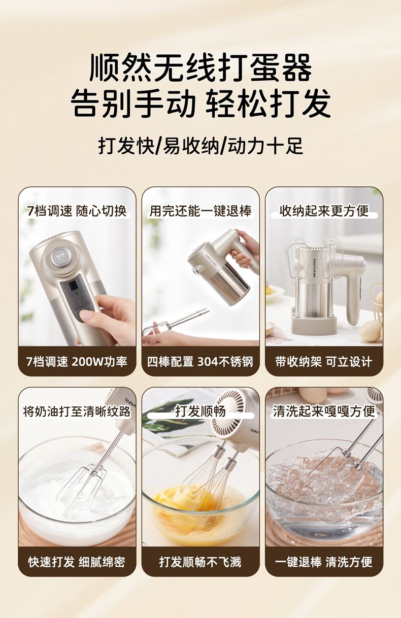 无线摆脱束缚 随拿随用; 7档调速,200w大功率直流电机轻音低噪不扰人; 升级4棒304不锈钢搅拌棒; typec充电,6000毫安充一次电能打发30次; 自带收纳盒 整洁好收纳;