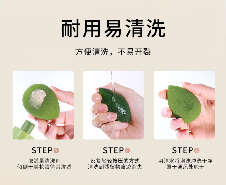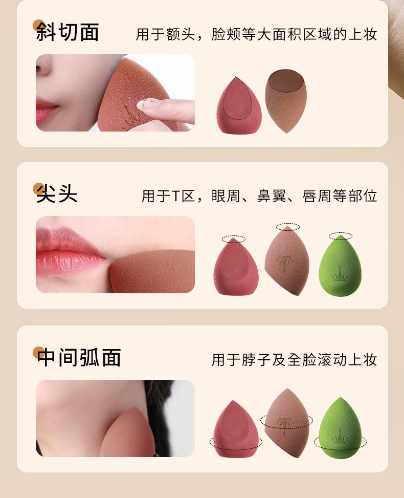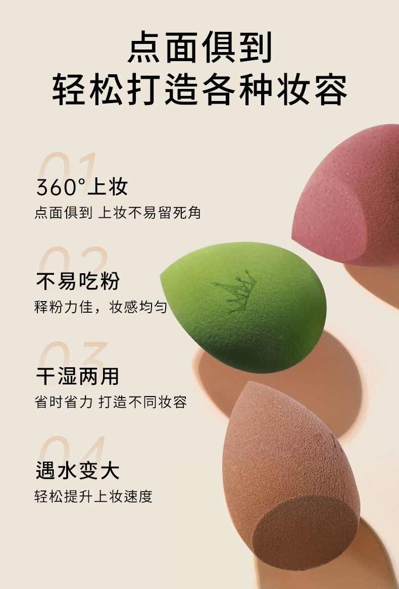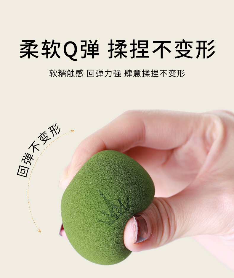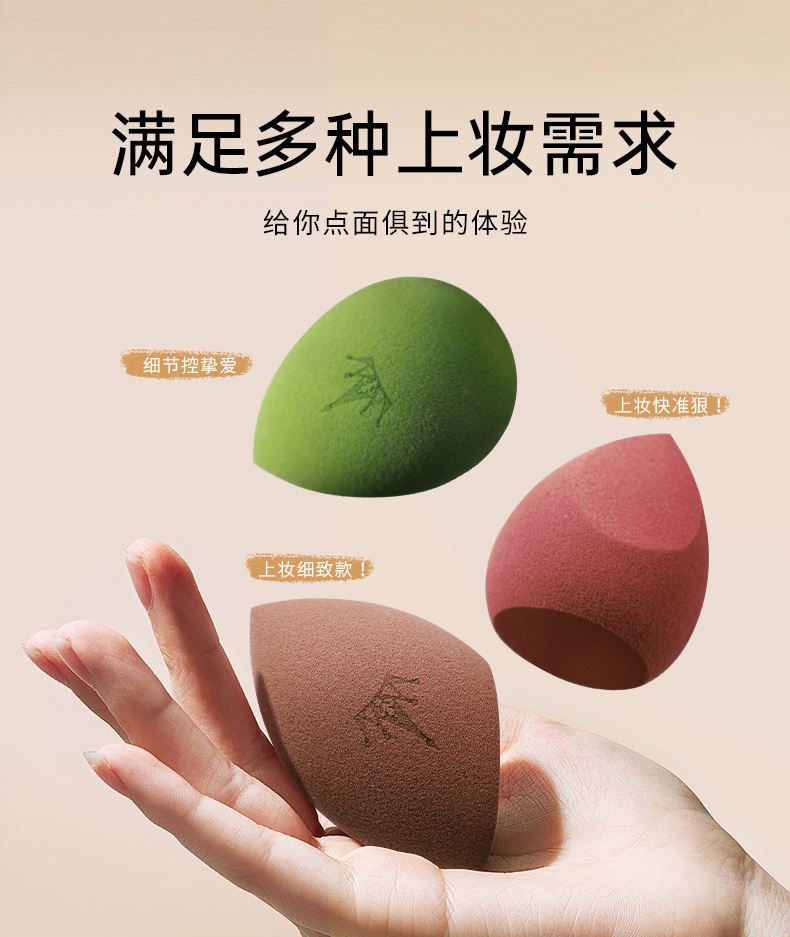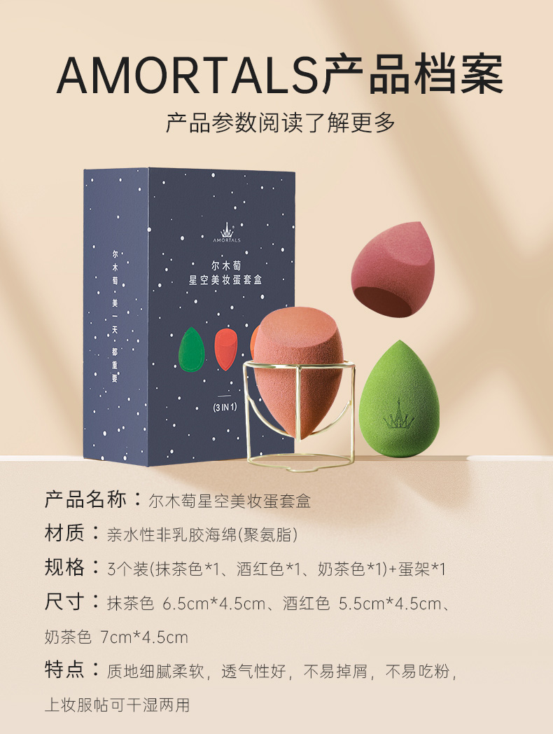 产品 :尔木萄星空美妆蛋套盒 材质:亲水性非乳胶海绵(聚氨脂) 规格 :3个装(抹茶色*1、酒红色*1、奶茶色*1)+蛋架*1尺寸:抹茶色 6.5cm*4.5cm、酒红色 5.5cm*4.5cm、 奶茶色 7cm*4.5cm 特点:质地细腻柔软,透气性好,不易掉屑,不易吃粉 上妆服帖可干湿两用 干湿两用设计‌:湿用可膨胀1.5倍,提升遮瑕力;干用弹性佳,适合定妆‌ ‌食品级亲肤材质‌:通过欧盟SGS认证,敏感肌适用,触感如婴儿肌肤‌ ‌防吃粉技术‌:表面气孔<0.1mm,释粉力强,可节省约50%粉底液 ‌多形态适配‌:水滴形/葫芦形等设计,贴合鼻翼、眼角等细节部位‌ 高性价比‌:单颗20-50元,套装50-120元,学生党的福利 ‌易清洗‌:温水搓洗即可恢复如新,延长使用寿命‌ ‌多功能使用‌:一颗=气垫粉扑+散粉扑+化妆刷