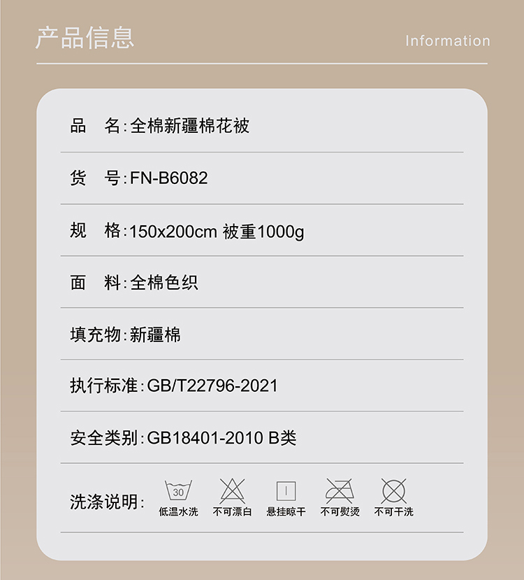 芳恩FN-B6082全棉新疆棉花被150x200cm