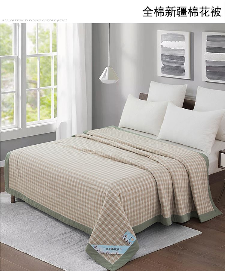 尺寸:150x200cm 被重:1000g 【面 料】全棉色织 【填充物】新疆棉 产品特点: 1.精选全棉水洗色织面料,亲肤舒适,吸湿透气; 2.甄选优质新疆棉花填充物,环保,贴身舒适,促进睡眠; 3.AB版设计,双面可以用,搭配美观,让家居更富活力色彩; 4.可水洗,易清洁,好打理。