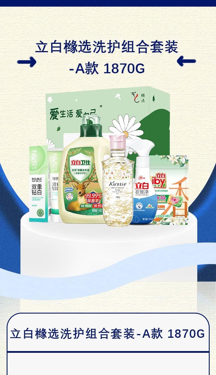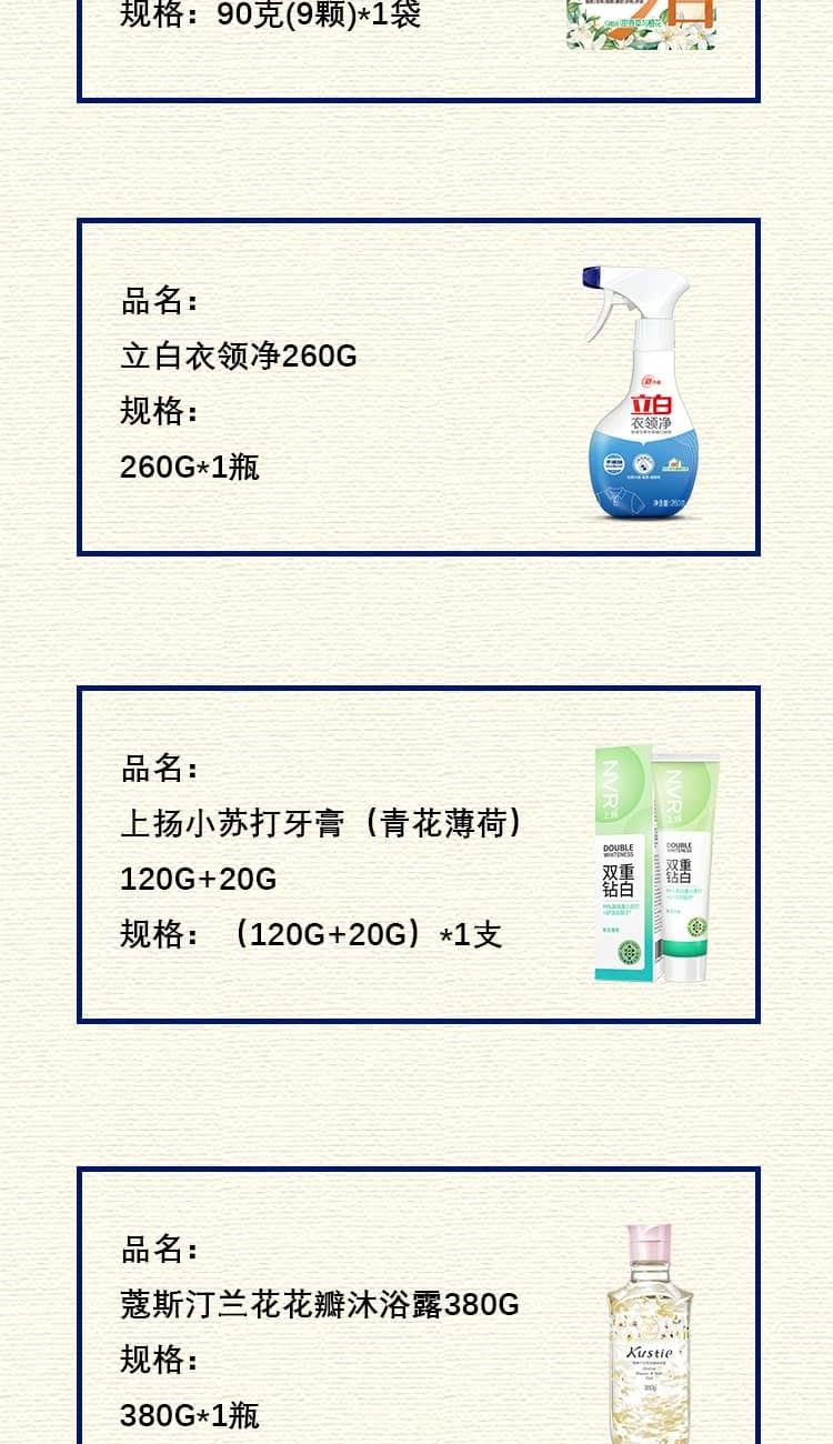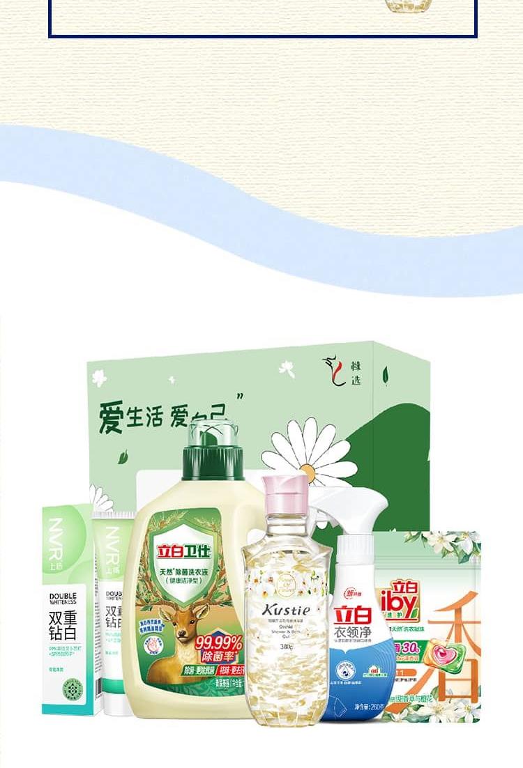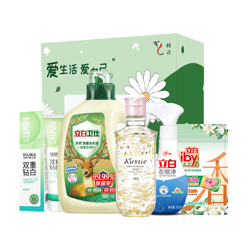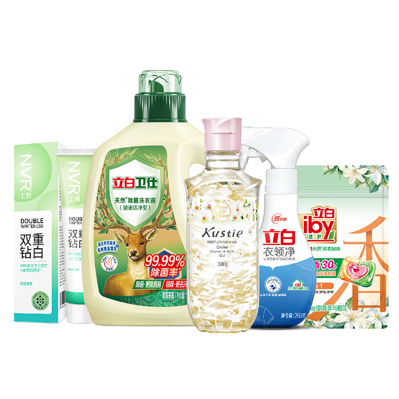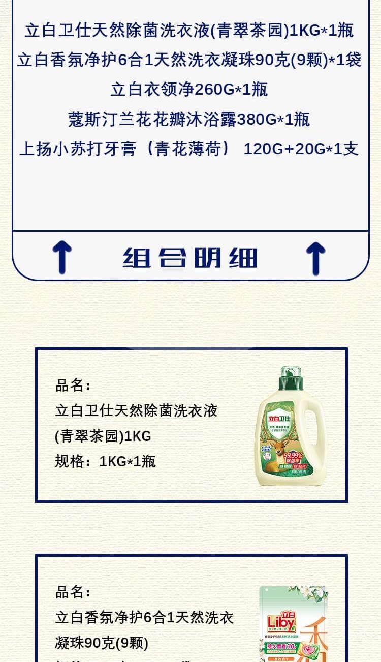 配置: 立白卫仕天然除 菌洗衣液(青翠茶园)1kg*1瓶 立白香氛净护6合1天然洗衣凝珠90克(9颗)*1袋 立白衣领净260g*1瓶 蔻斯汀兰花花瓣沐浴露380g*1瓶 上扬小苏打牙膏(青花薄荷) 120g+20g*1支 核心卖点: 立白:中国名 牌产品,洗涤用品领域的天然洗护领 导品 牌,是中国万千城市家庭家居清洁的主要选择。 蔻斯汀:真鲜花护理品 牌,全球首款花瓣沐浴露,实现鲜花绽放在瓶子里的奇迹。