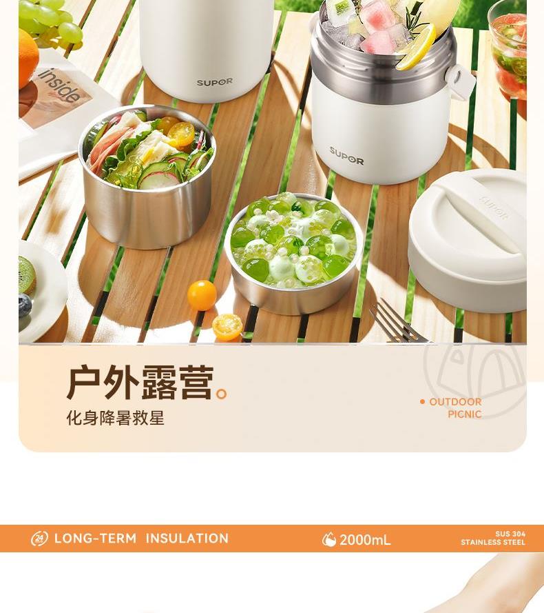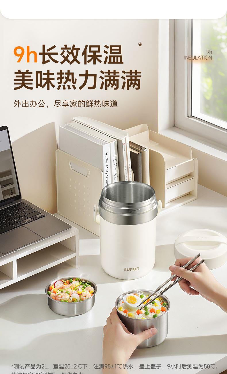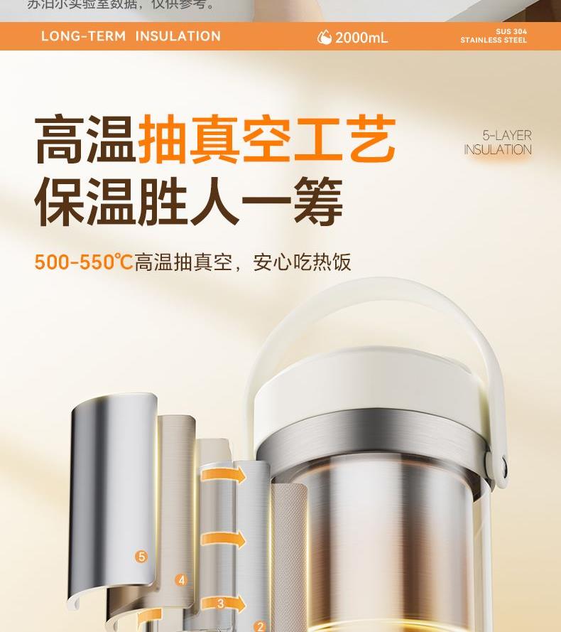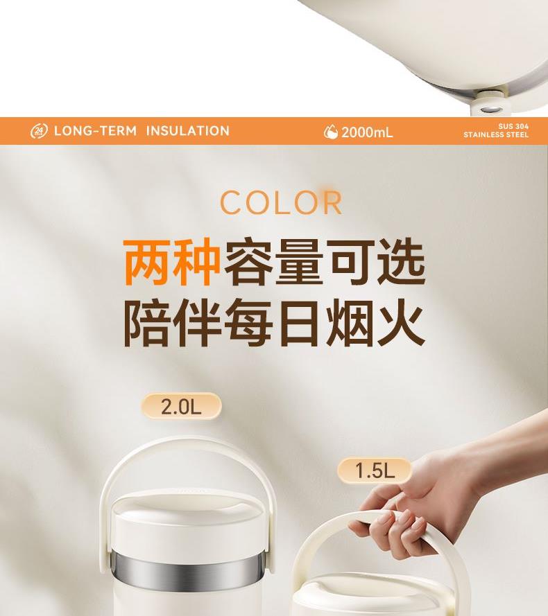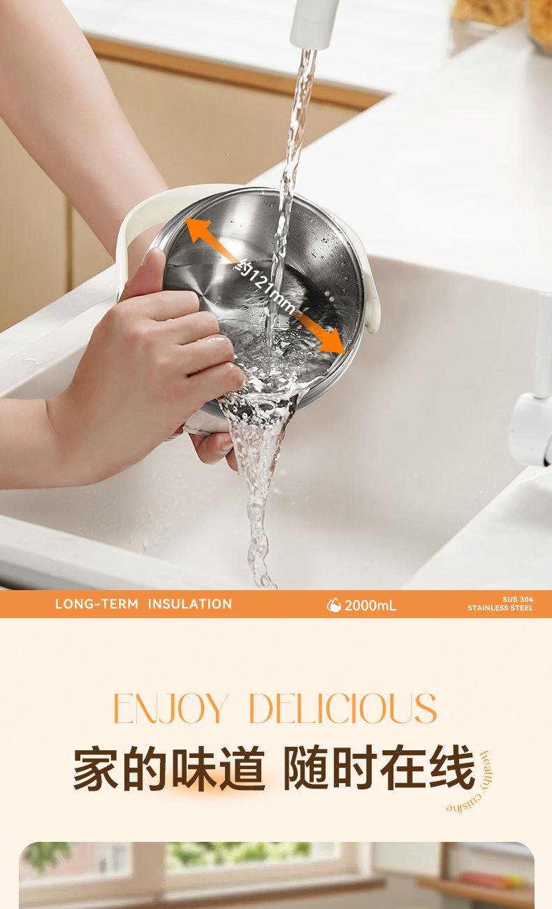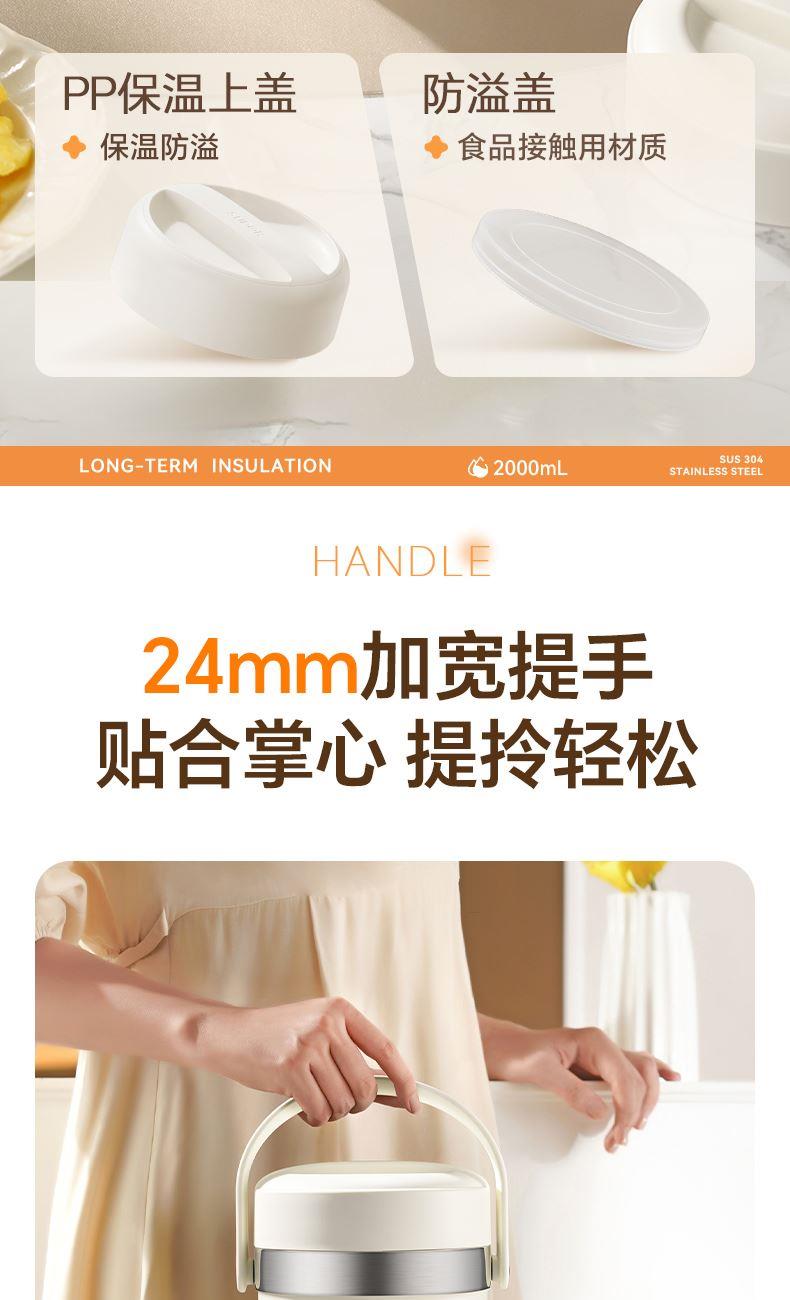 容量:2000ml 材质:304不锈钢 卖点: 1.9h长效保温美味热力满满 2.全身304不锈钢母婴餐食放心装 耐腐蚀 耐高温 无异味 3.9项重金属未检出权威检测 安心保障 4. 24mm加宽提手贴合掌心提拎轻松