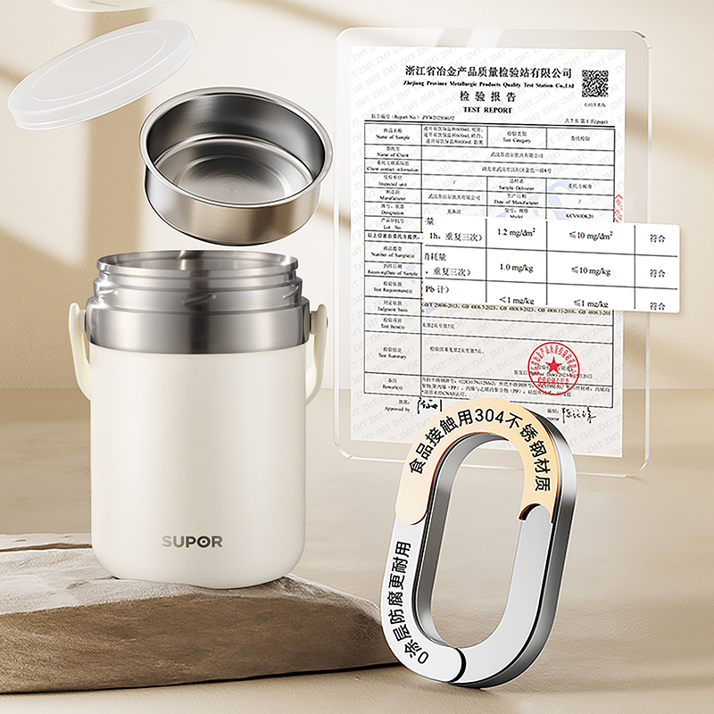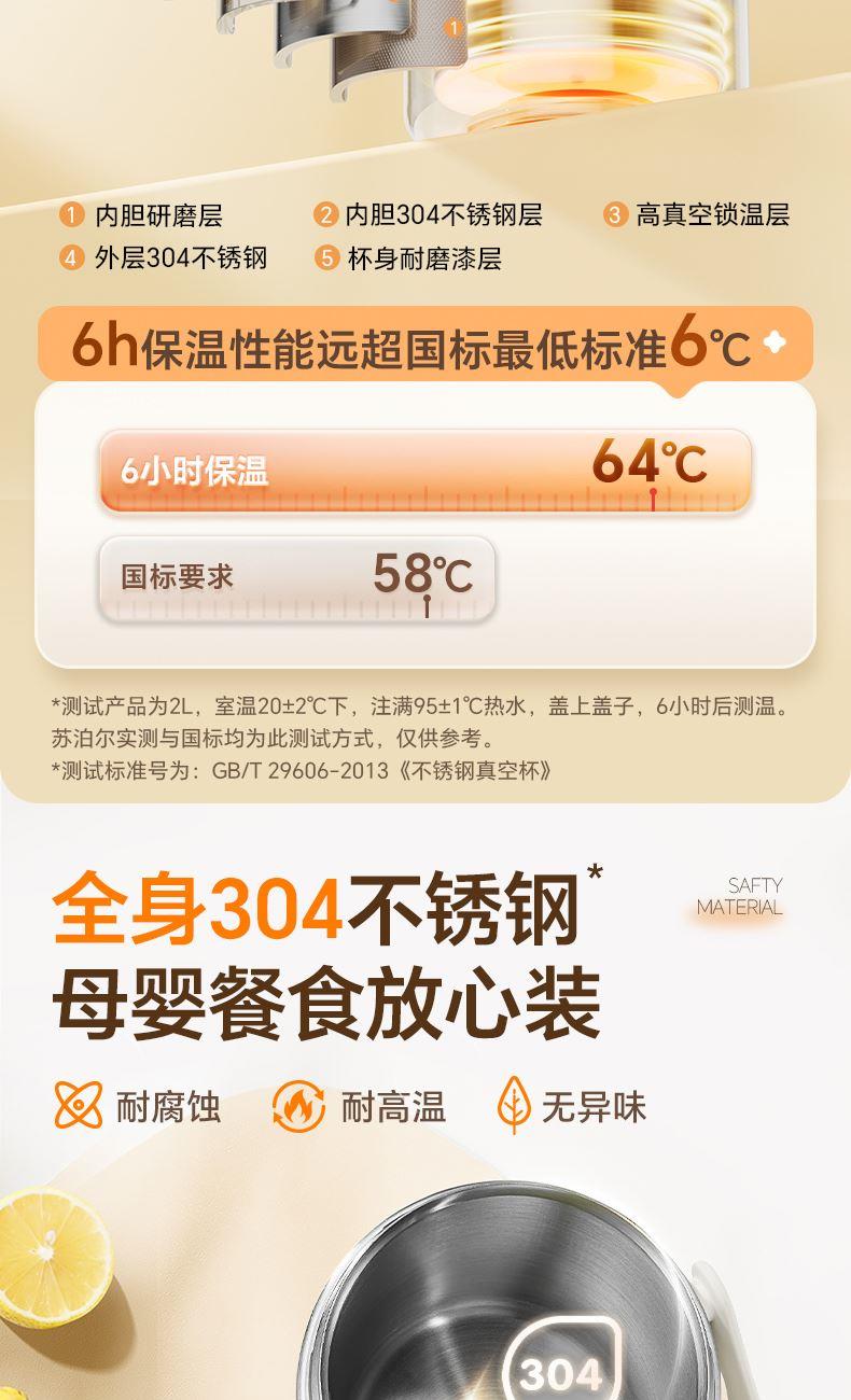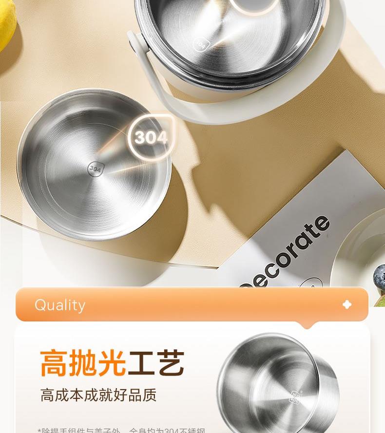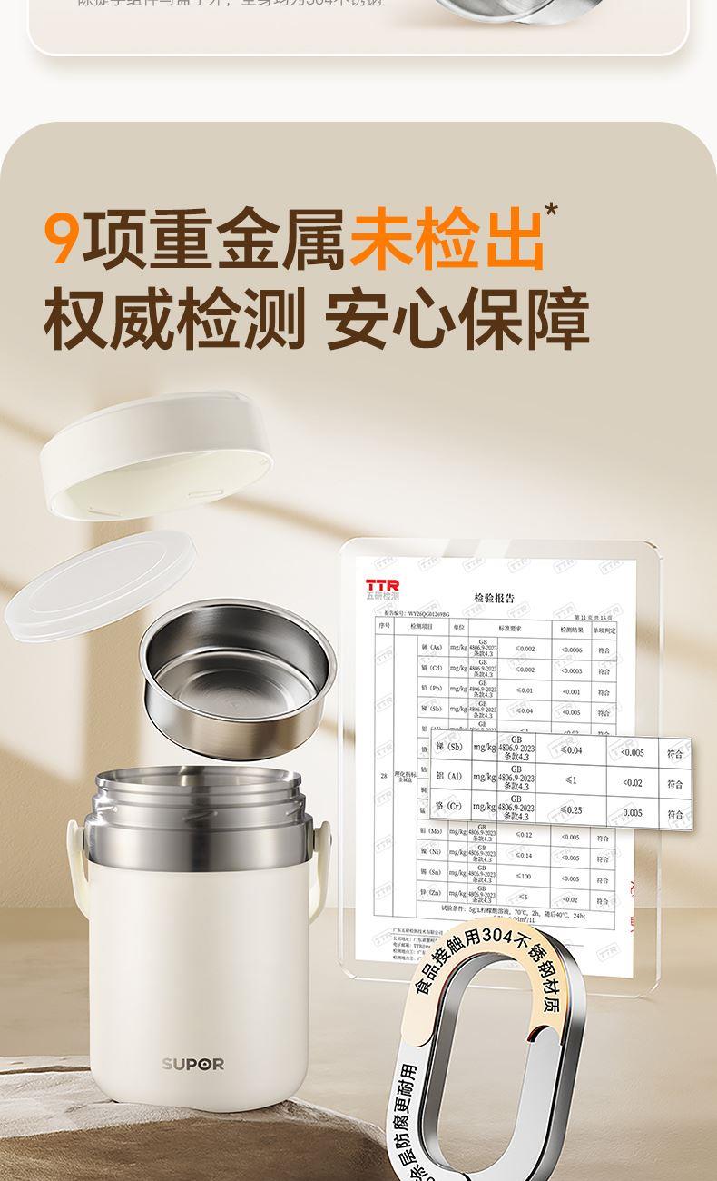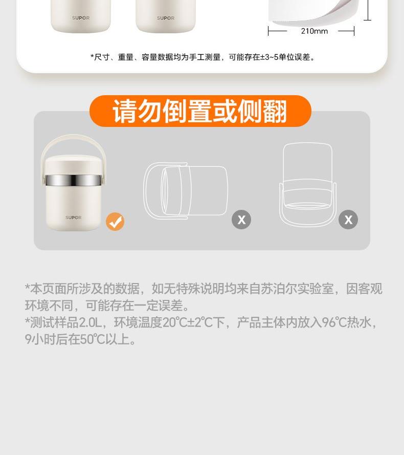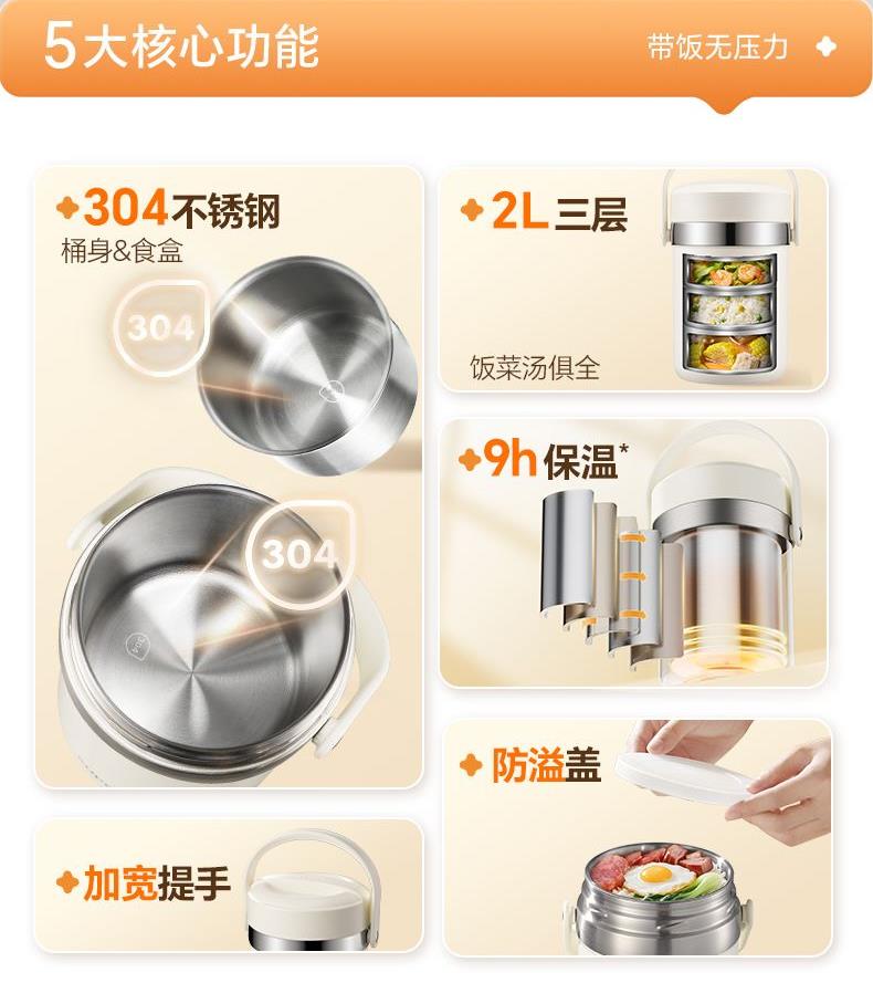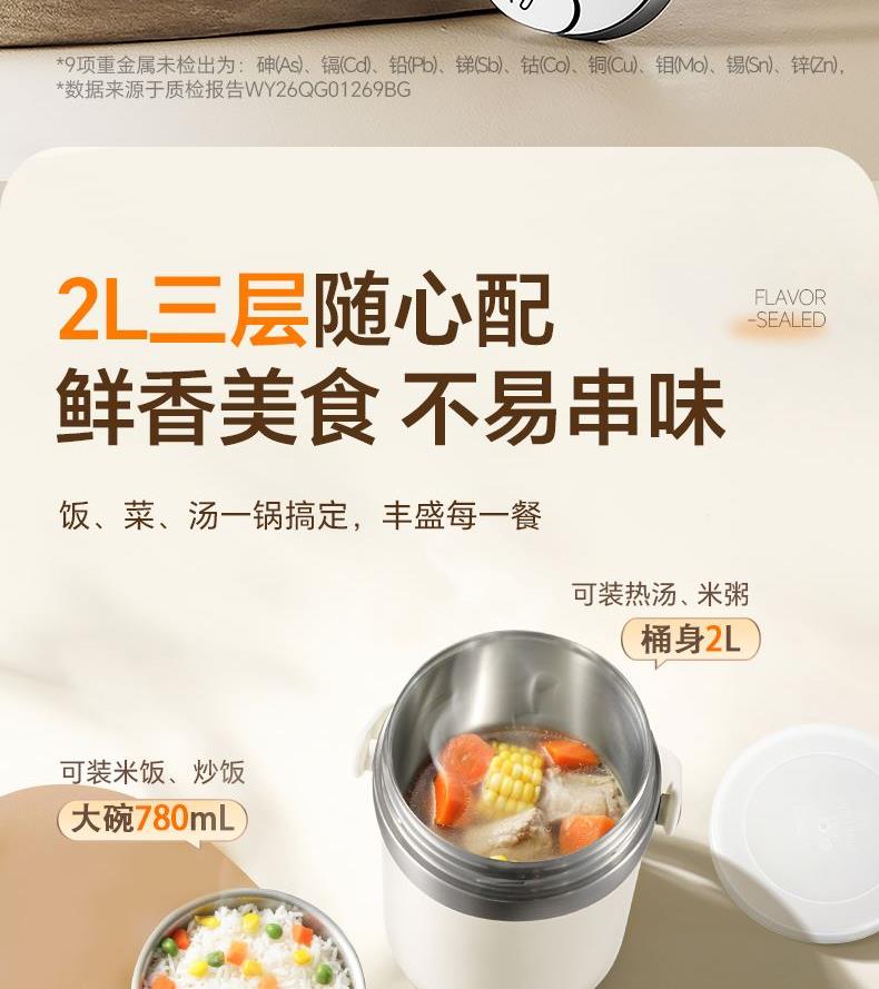 容量:2000ml 材质:304不锈钢 卖点: 1.9h长效保温美味热力满满 2.全身304不锈钢母婴餐食放心装 耐腐蚀 耐高温 无异味 3.9项重金属未检出权威检测 安心保障 4. 24mm加宽提手贴合掌心提拎轻松