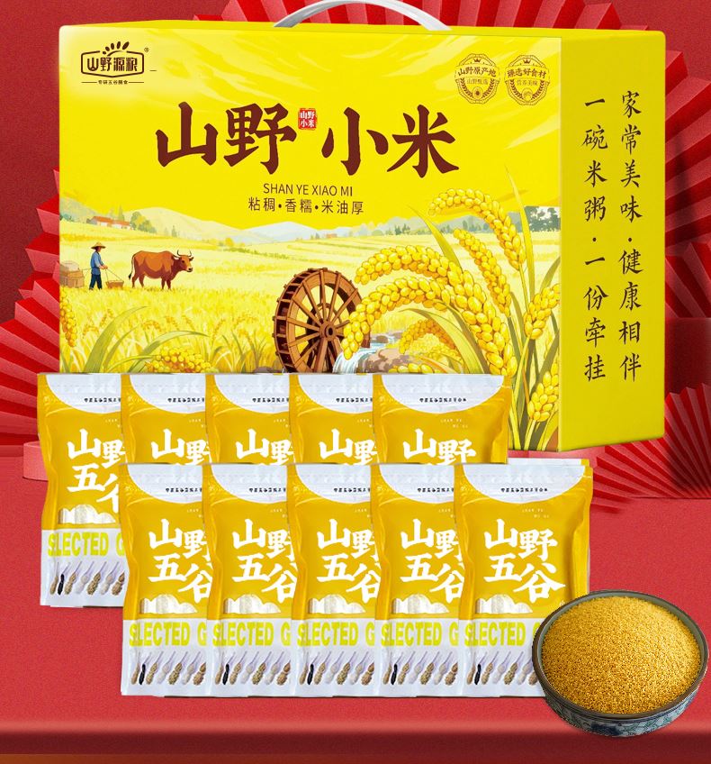 净含量:2500g 礼盒:山野小米 条码:6972761600017 产品规格配置:黄小米(250gx10袋) 盒尺寸:42*28.5*9.5cm 箱重量:18.5kg 箱体积:0.077方 箱尺寸:59.5*43*30