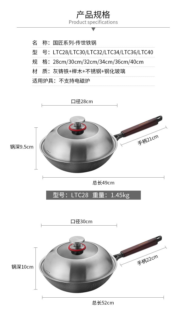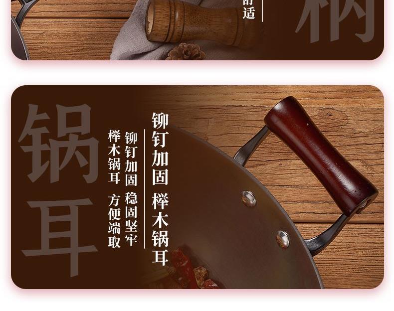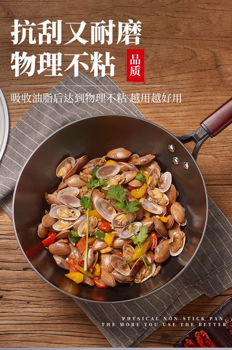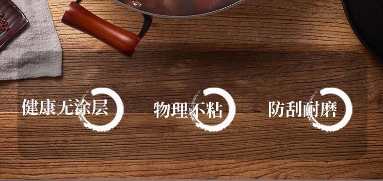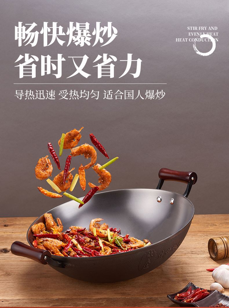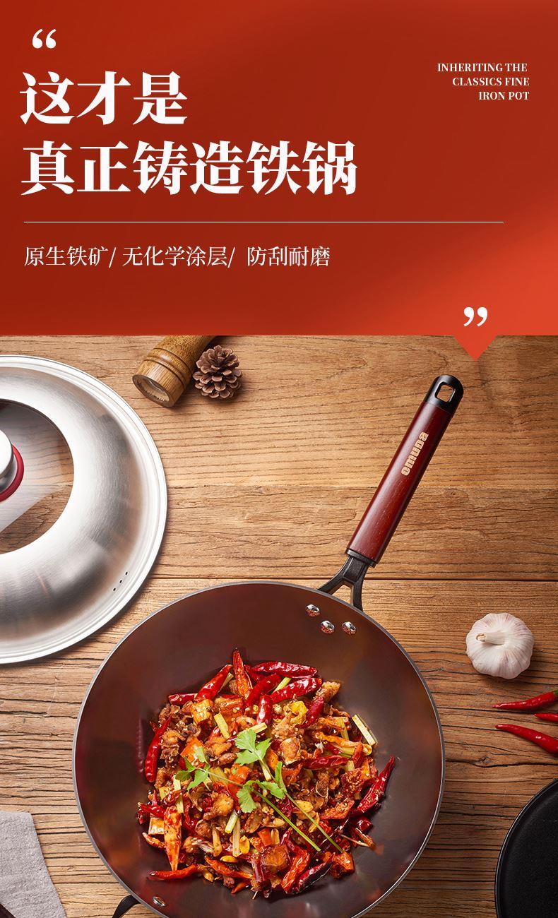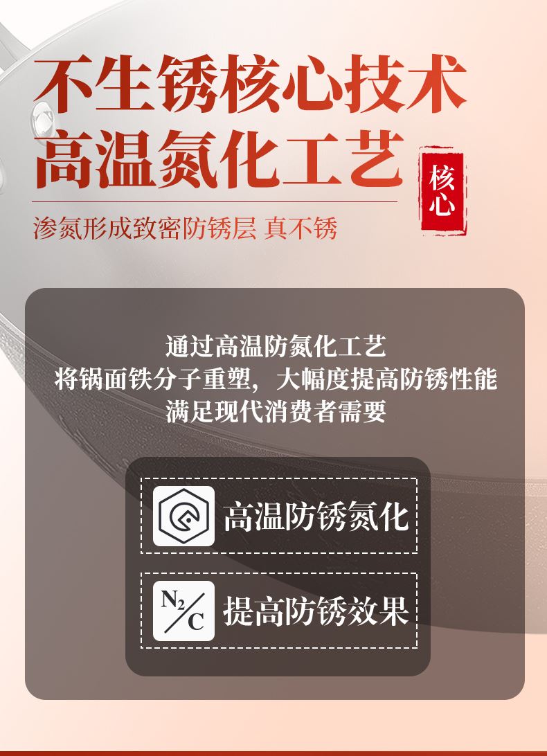 材质:灰生铁(铸铁) 功能:① 原生态生铁锅,锅体采用深矿原生铁材质,经高温提炼、浇铸、切口、修边、抛光、氮化等多道工序匠心制作而成。 ② 锅体自然发色,表面经高科技氮化防锈工艺处理,抗腐蚀防锈能力远高于行业标准。 ③铁材质导受热高,导热快速,旺火爆炒,让食材脆嫩爽口,口齿留香。 ④圆底设计,保留传统铁锅锅形,翻炒更顺心,底厚壁薄,储热性能强,传热快速均匀,不易焦糊,不含有对人体有害的重金属元素,健康安全。
