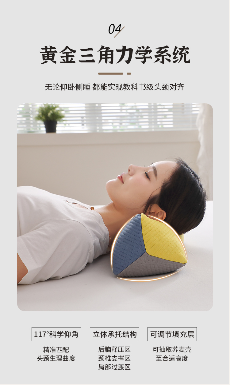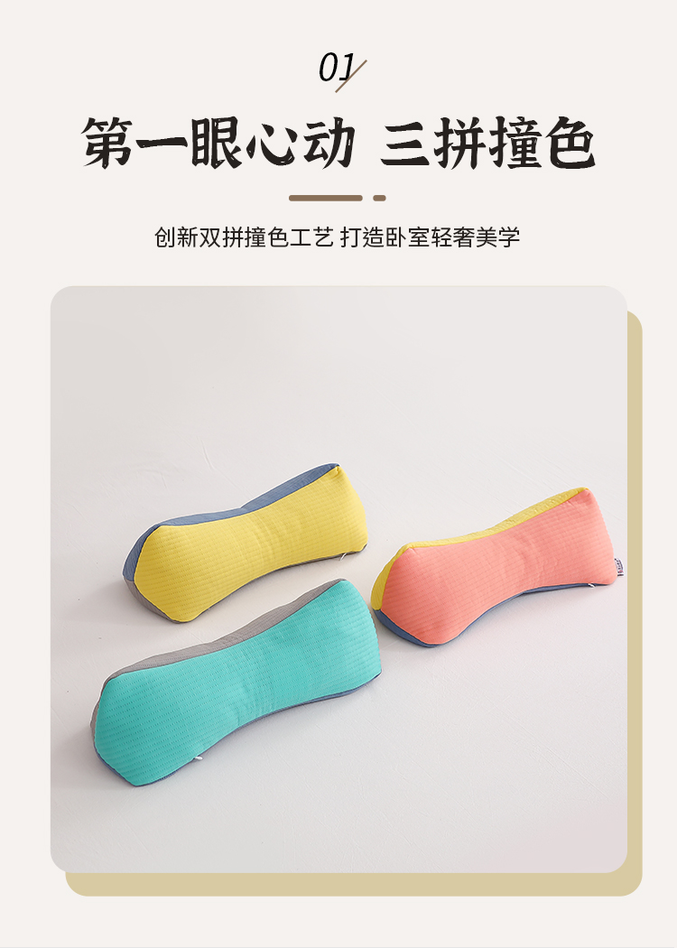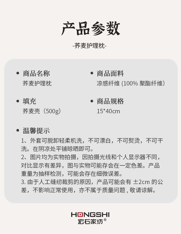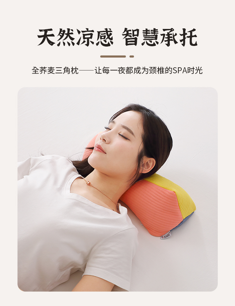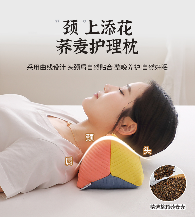品 名: “颈”上添花荞麦护理枕 型 号: HS-Z-QM25201 面 料: 凉感纤维(聚酯纤维) 填 充: 甜荞壳 500克 规 格: 15*40cm 产品说明: “七节颈椎全打开,健康颈椎躺出来” 。 三 角立体造型科学贴合头颈曲线 ,搭配苦荞壳 自然空腔动态支撑 ,天然透气结构使颈椎保 持舒爽。 荞麦壳含有多种对人体有益的微量 元素 ,对身体大有益处。 枕面三色双拼 ,撞 色设计适配不同家居风格 ,轻便易携适配差 旅、办公午休等需求 ,传递贴心问候 ,是商 务赠礼、 员工福利及健康生活倡导的匠心之 选。
