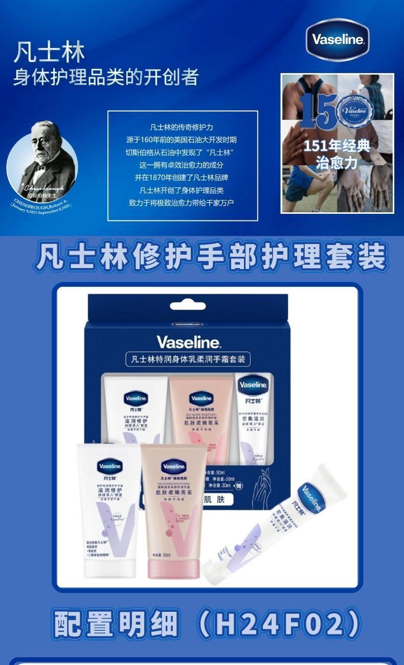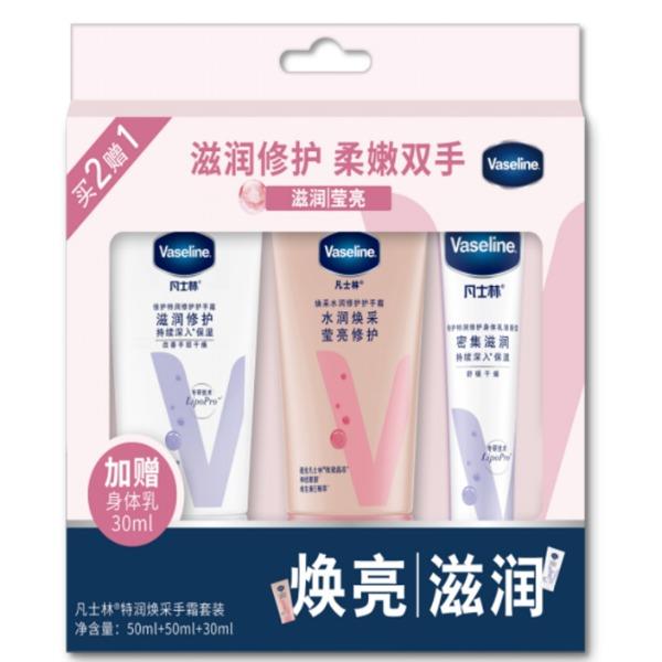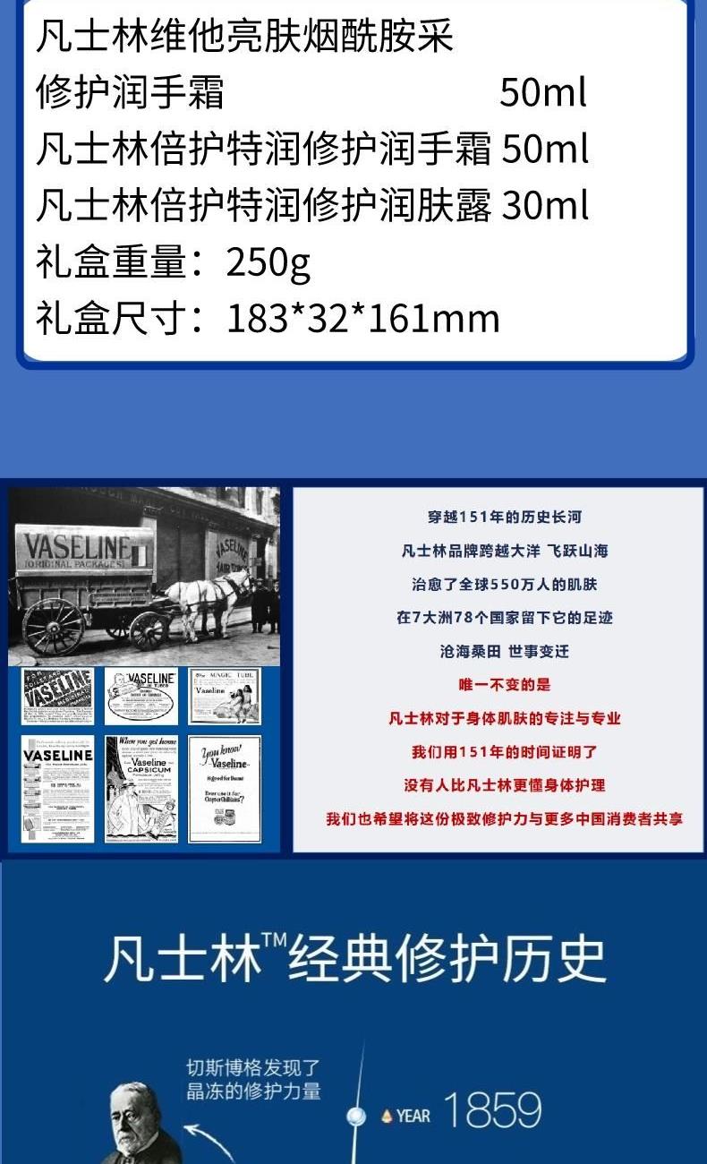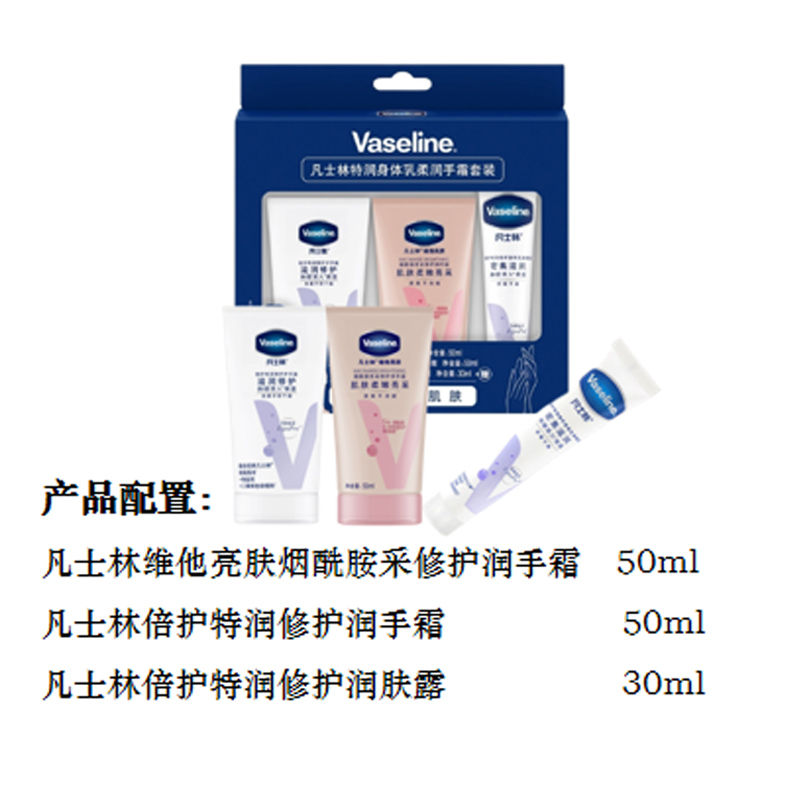 凡士林维他亮肤烟酰胺采修护润手霜 50ml 凡士林倍护特润修护润手霜 50ml 凡士林倍护特润修护身体乳清香型 30ml 包 装 :彩盒 重 量 :218g 礼盒尺寸:183*161*32mm