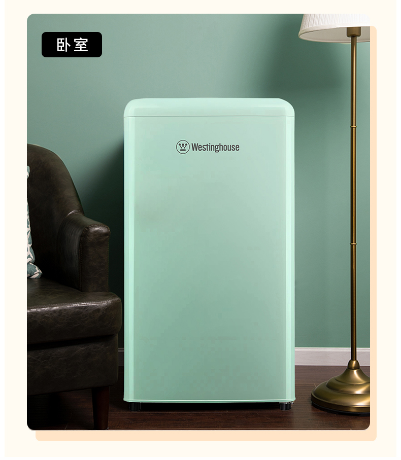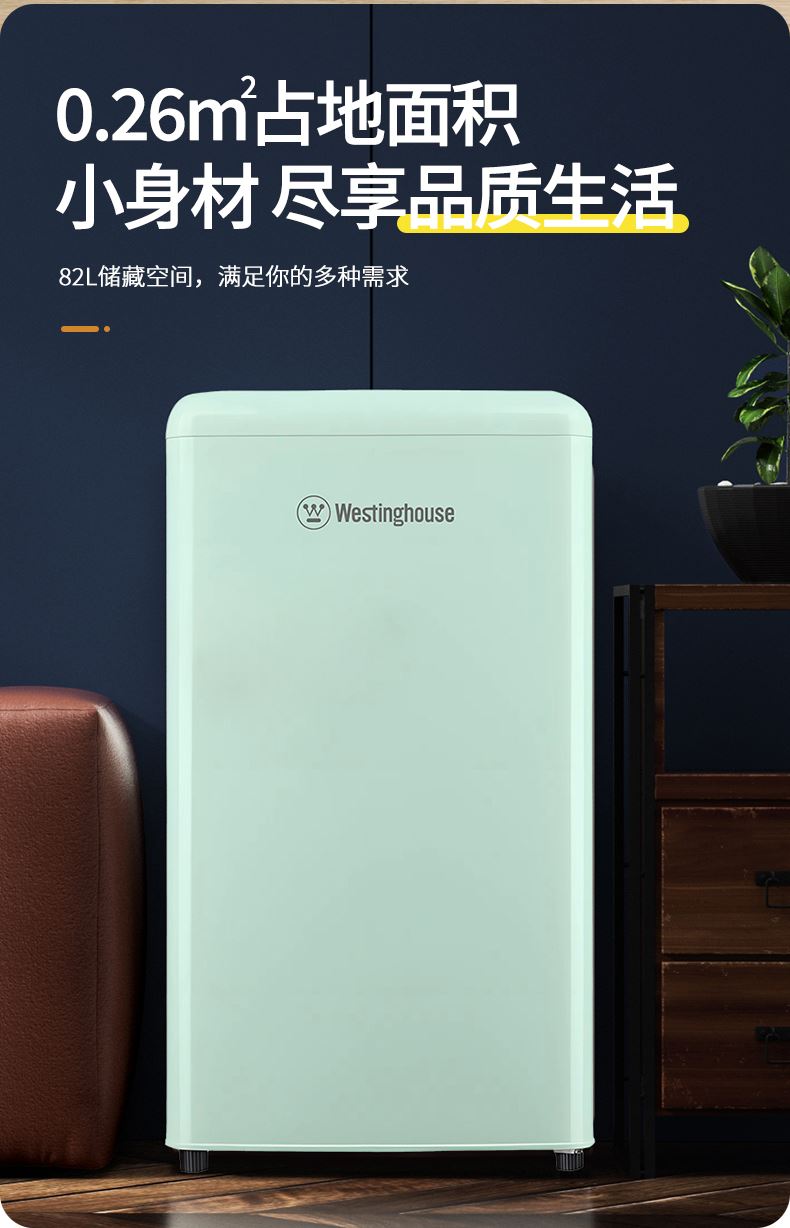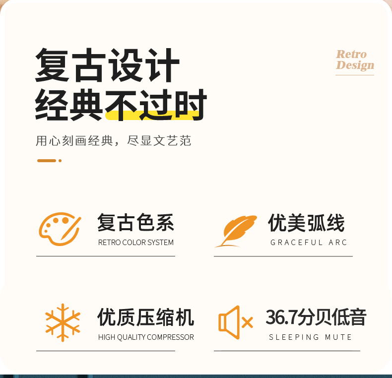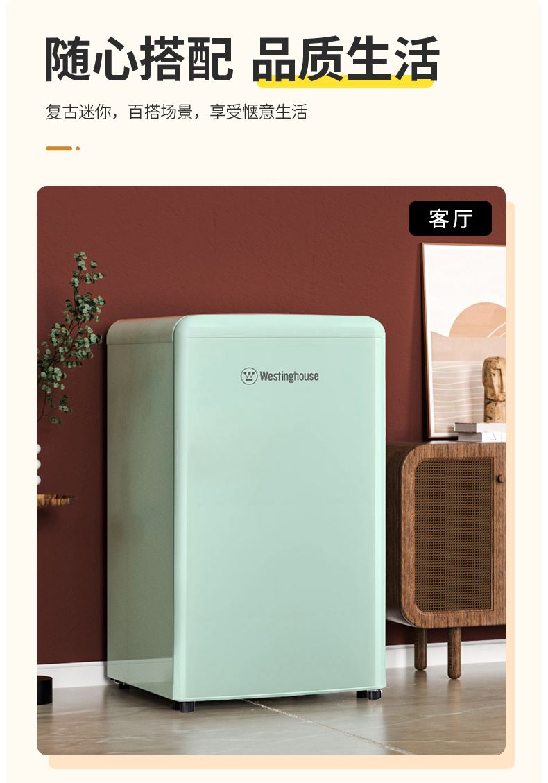 复古外观设计、单门双温 PCM彩钢门、优美弧线 低噪节能(优质压缩机、38分贝低音) 0.26㎡占地面积,小身材