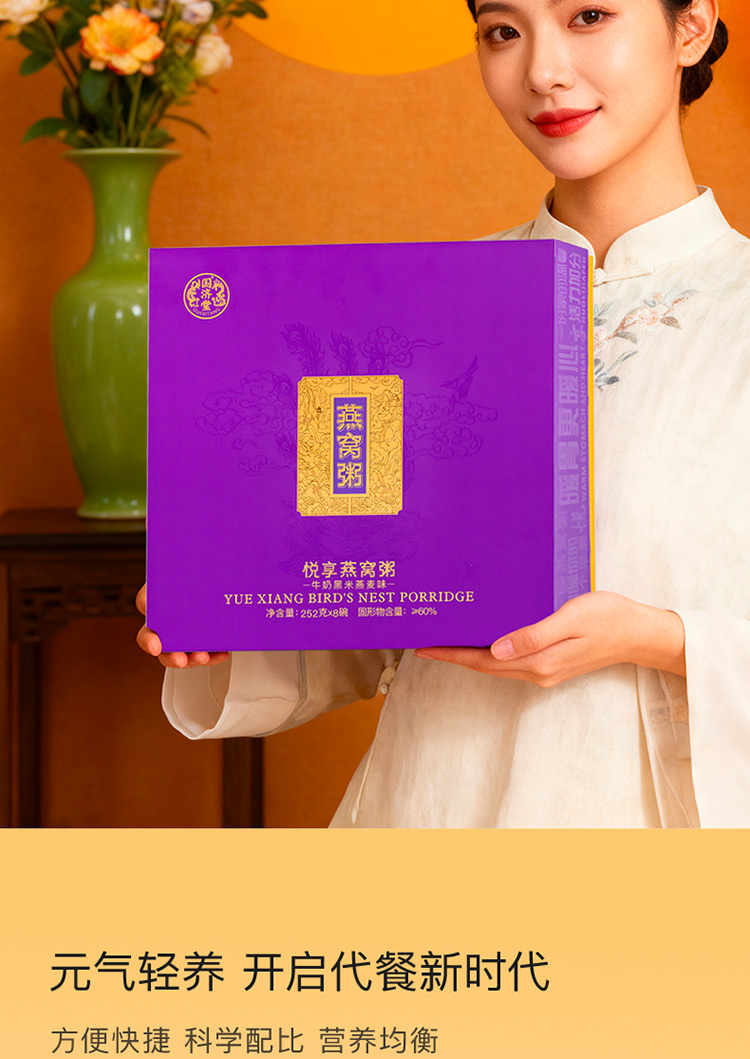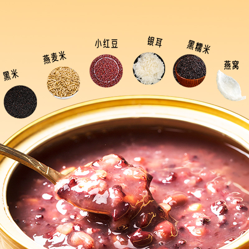 配置:252g*8碗 +勺子*8 /盒 固形物含量≥60% 配料表:纯净水、纯牛奶、冰糖、黑米、燕麦米、红小豆、黑糯米、银耳、燕窝 食用方法:开盖即食 净含量:2016克/盒 保质期:12个月 储存方法:存放于通风干燥处