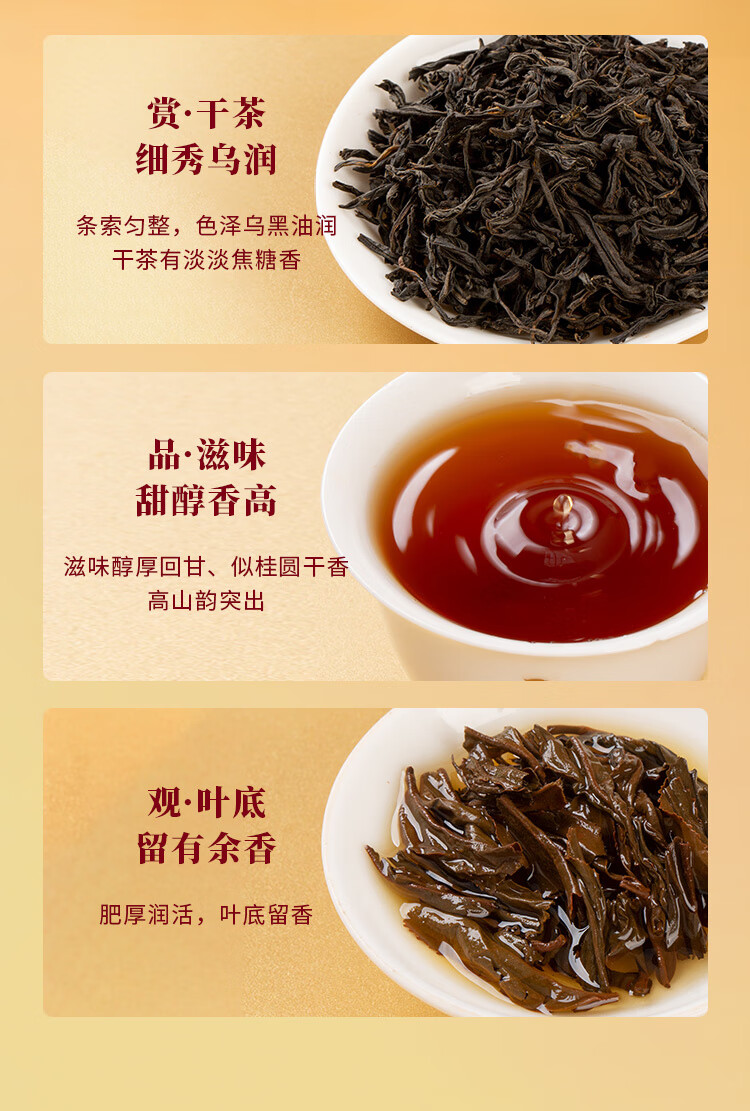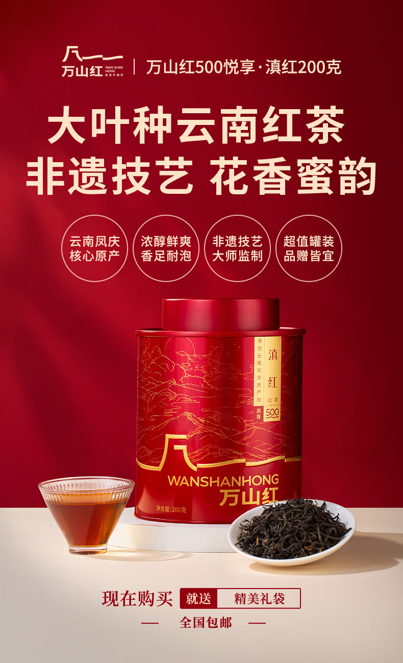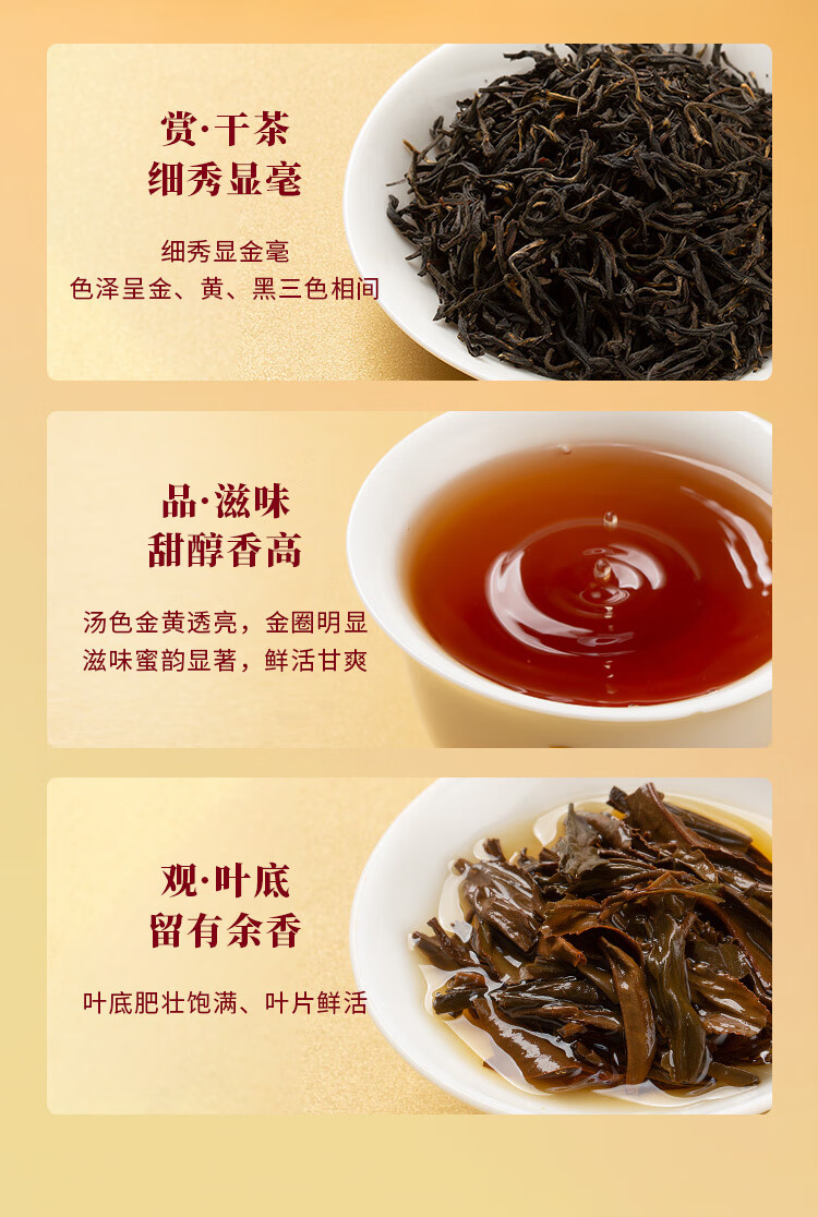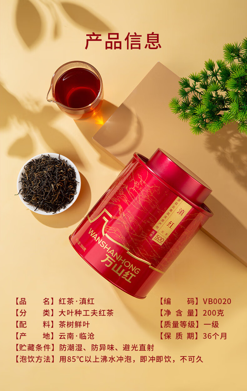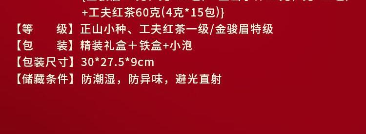 【产地】福建·武夷山/福建·泉州 【净 含 量】180克 【保质期】36个月 组合方式: 金骏眉60克(4克*15包) 正山小种60克(4克*15包) 工夫红茶60克(4克*15包)【等级】正山小种、工夫红茶一级/金骏眉特级 【包装】精装礼盒+铁盒+小泡 【包装尺寸】30*27.5*9cm 【储藏条件】防潮湿,防异味,避光直射 滇红200克