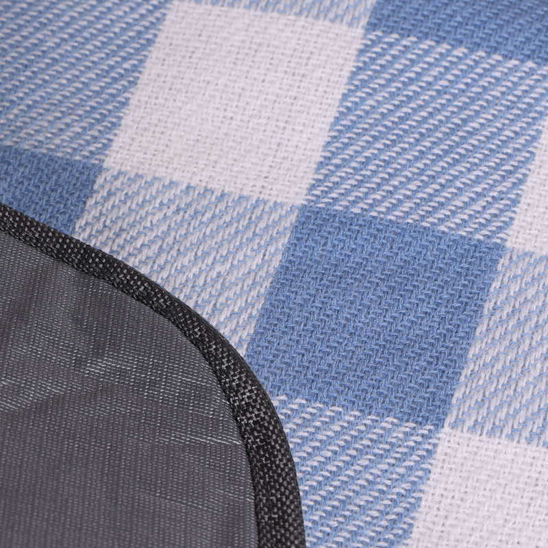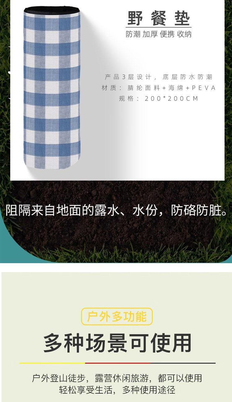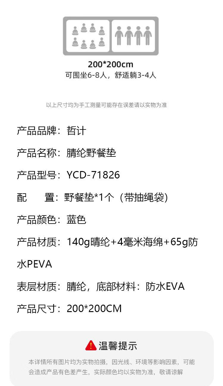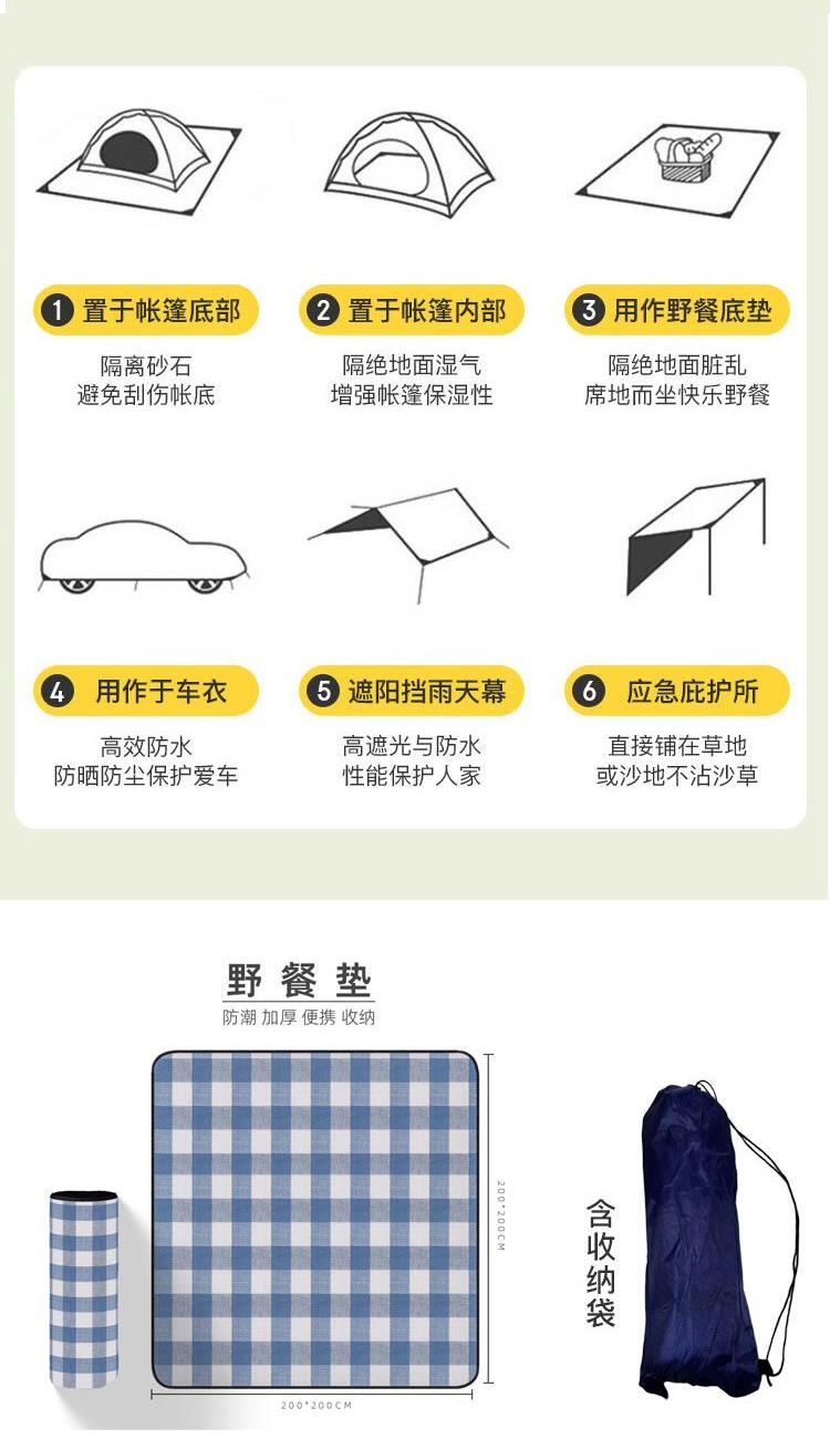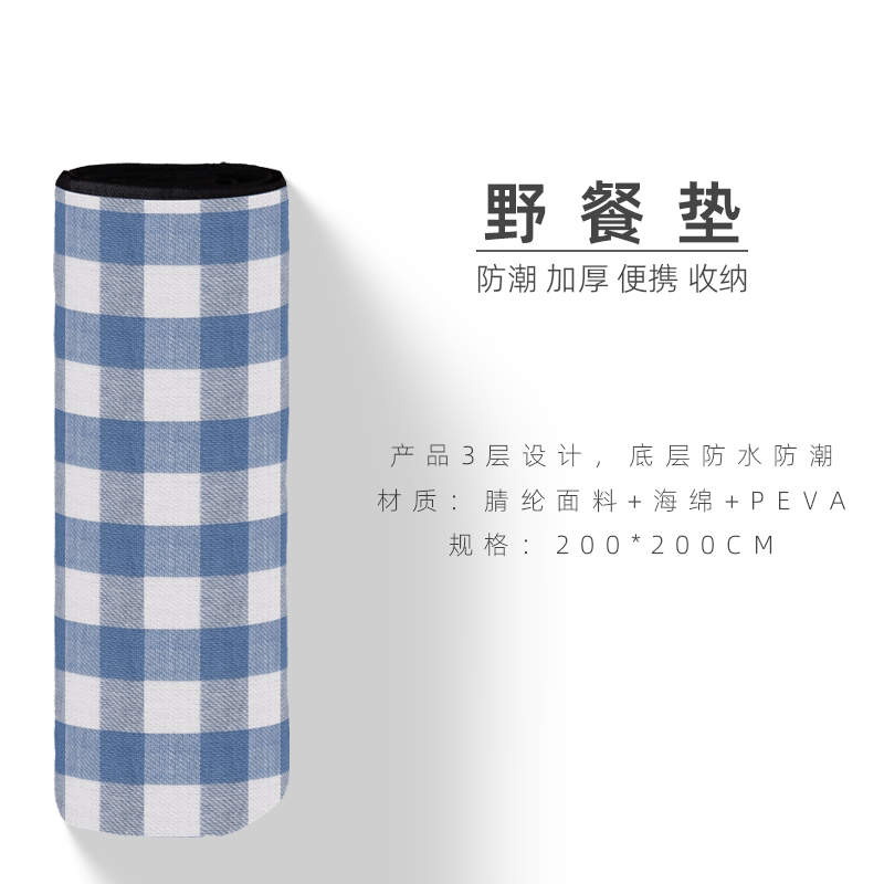 配 置:野餐垫*1个(带抽绳袋) 产品颜色:蓝色 产品材质:140g晴纶+4毫米海绵+65g防水PEVA 表层材质:腈纶,底部材料:防水EVA 产品尺寸:200*200CM 产品卖点: 1、EVA防水面料,防潮隔垫 2、防水防潮隔热不粘沙草