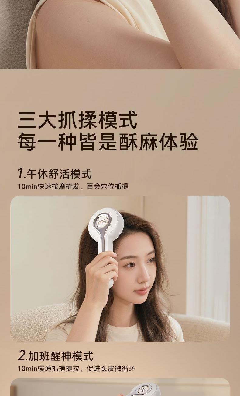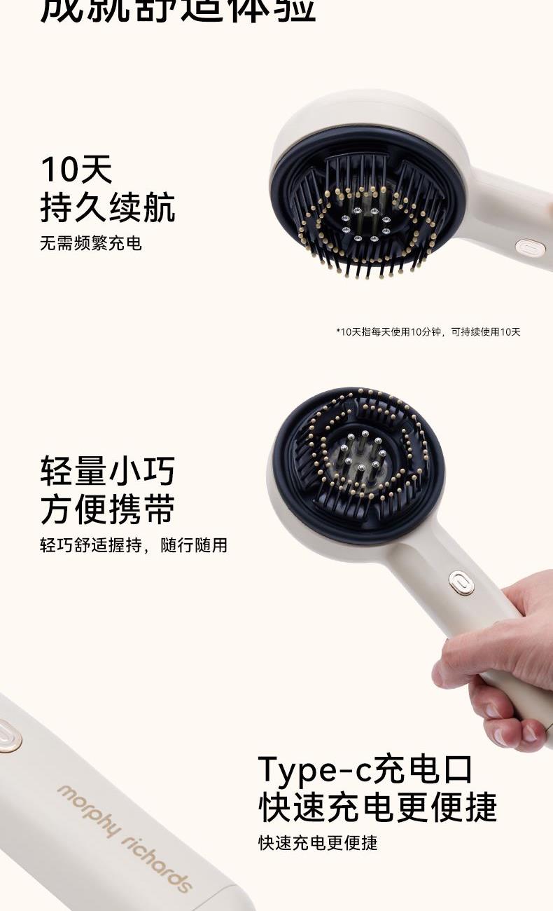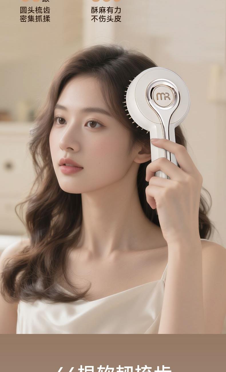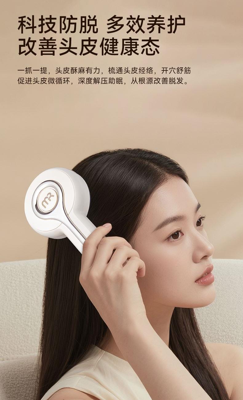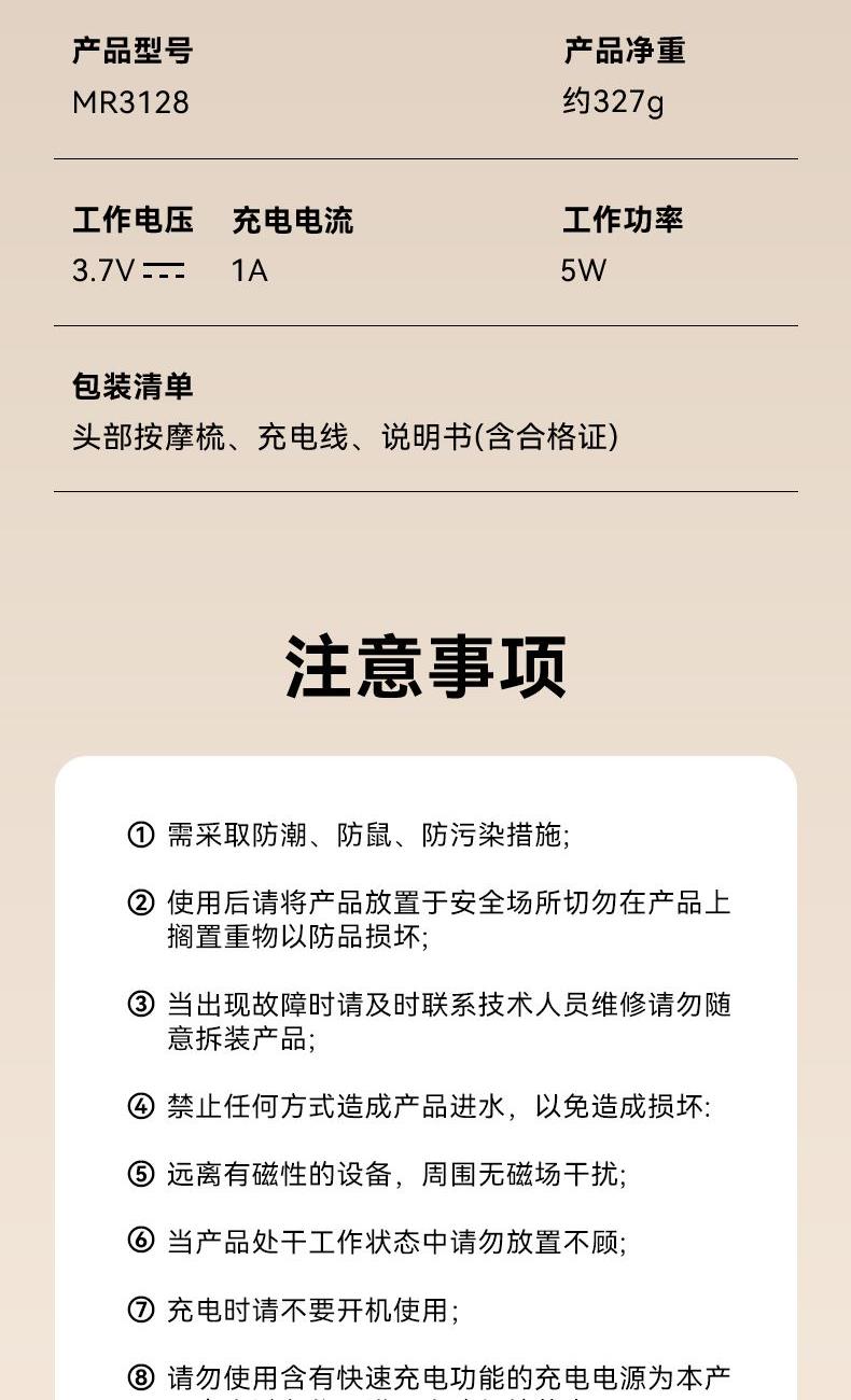 69码 6975660321281 型号 MR3128 产地 浙江温州 净重 250g 毛重 480g 包装尺寸 24X11.7X6.3cm(彩盒) 大箱尺寸 51.5×40×52.5cm 续航:约10天(每天使用2次) 充电时间:3小时±0.5小时 充电电压:5V/1A 工作功率:10W 充电接口:Type-C 电池容量:1400毫安 配件:主机,充电线,收纳袋,说明书 执行标准:GB4706.1-2005/GB4706.10-2008 卖点: “真抓揉”开穴舒筋,解压助眠 红光光波理疗,呵护头皮 圆润梳齿,按摩不伤头皮,蓬松顺发 边梳边导液,营养直达头皮,高效吸收 大容量长续航,可使用约10天 流线型握把,轻巧易握,小巧收纳