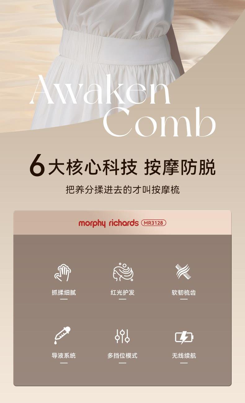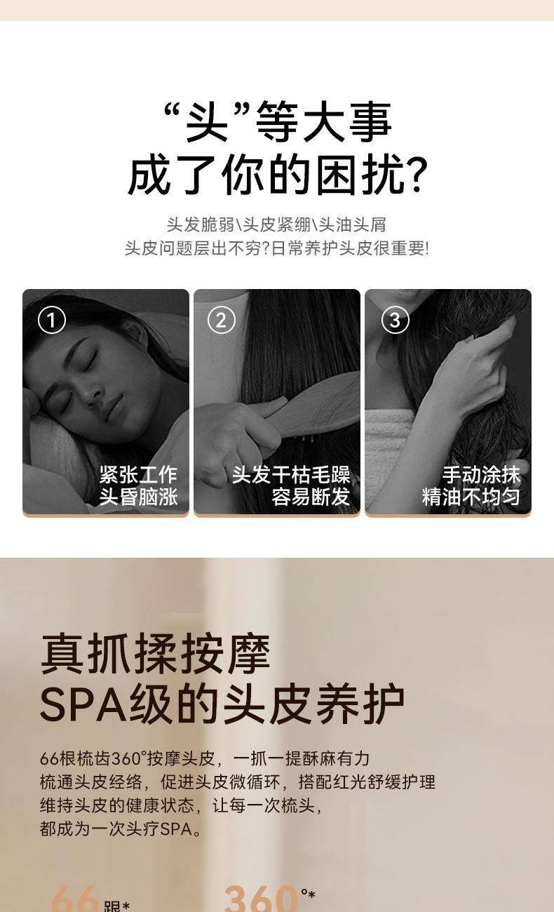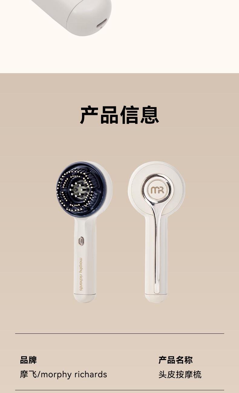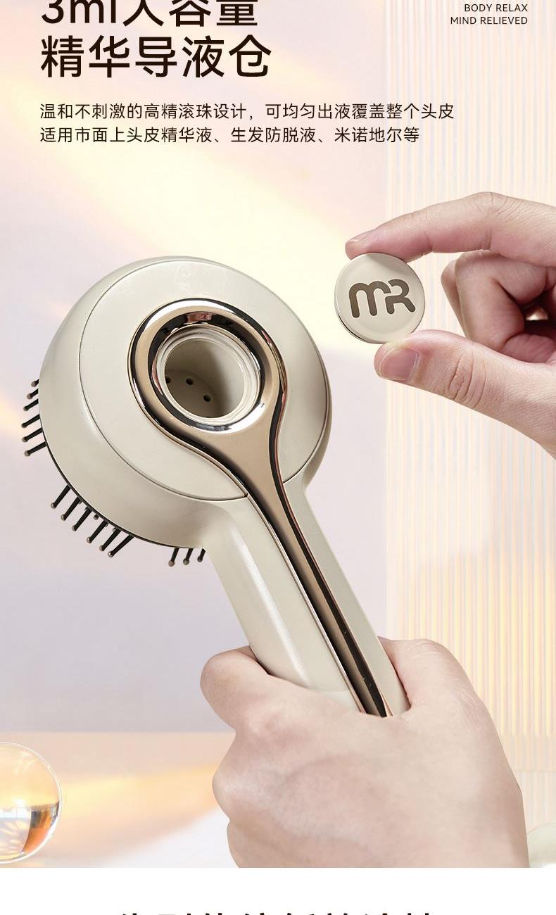 69码 6975660321281 型号 MR3128 产地 浙江温州 净重 250g 毛重 480g 包装尺寸 24X11.7X6.3cm(彩盒) 大箱尺寸 51.5×40×52.5cm 续航:约10天(每天使用2次) 充电时间:3小时±0.5小时 充电电压:5V/1A 工作功率:10W 充电接口:Type-C 电池容量:1400毫安 配件:主机,充电线,收纳袋,说明书 执行标准:GB4706.1-2005/GB4706.10-2008 卖点: “真抓揉”开穴舒筋,解压助眠 红光光波理疗,呵护头皮 圆润梳齿,按摩不伤头皮,蓬松顺发 边梳边导液,营养直达头皮,高效吸收 大容量长续航,可使用约10天 流线型握把,轻巧易握,小巧收纳