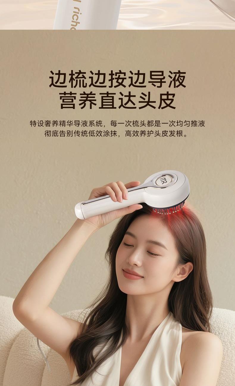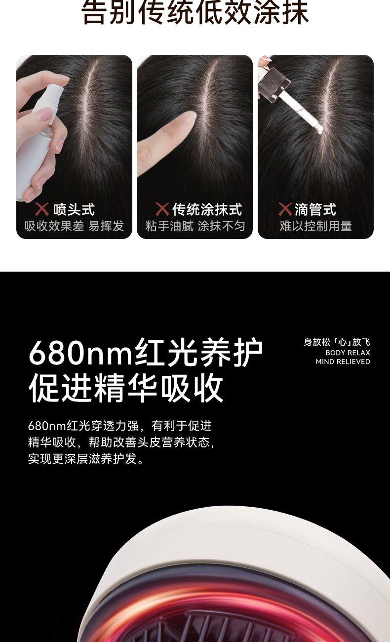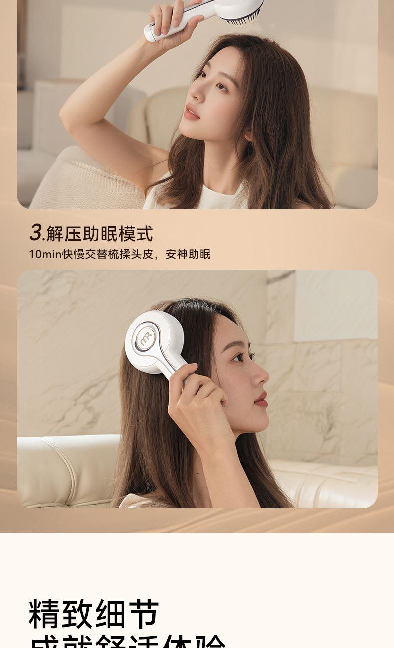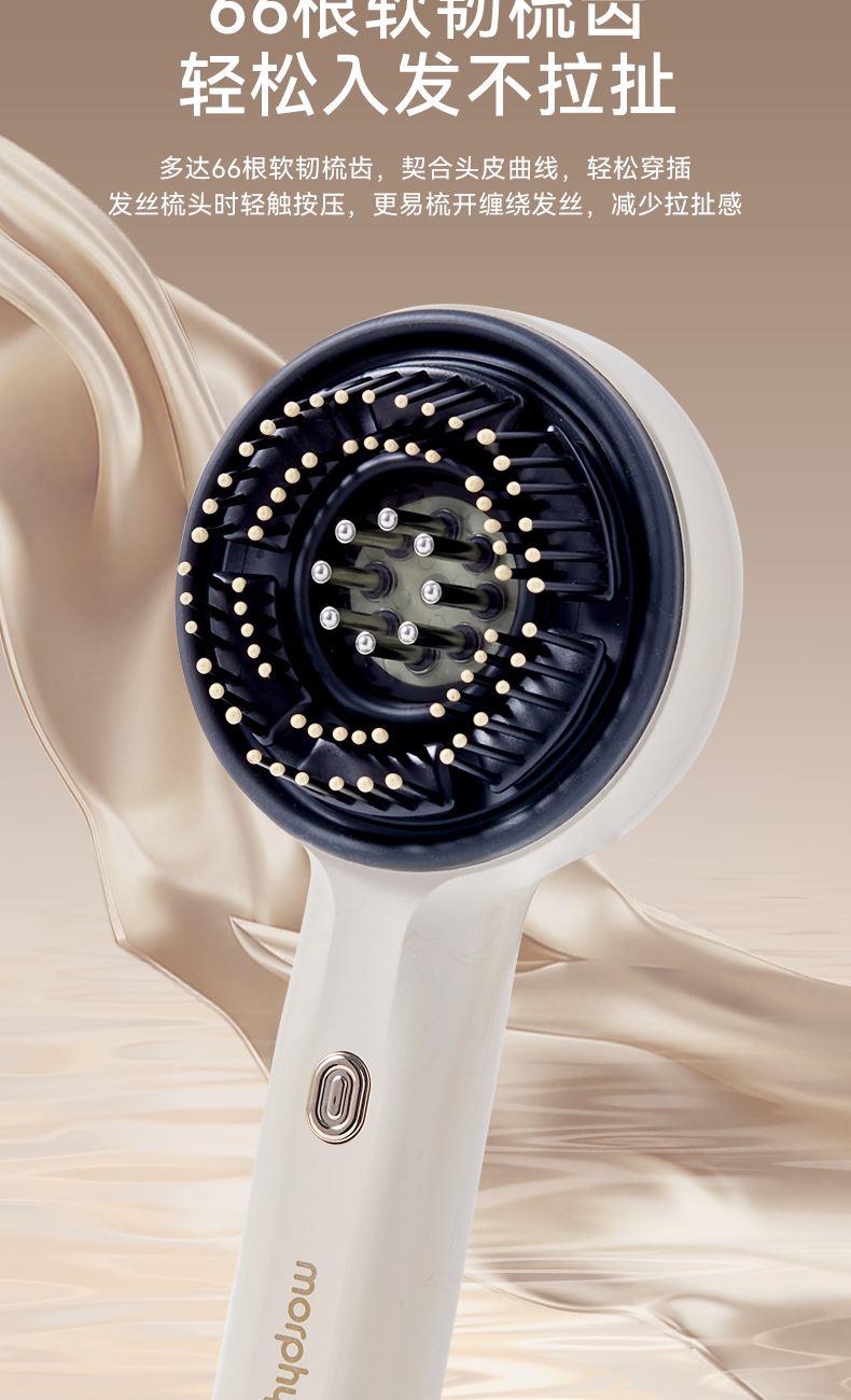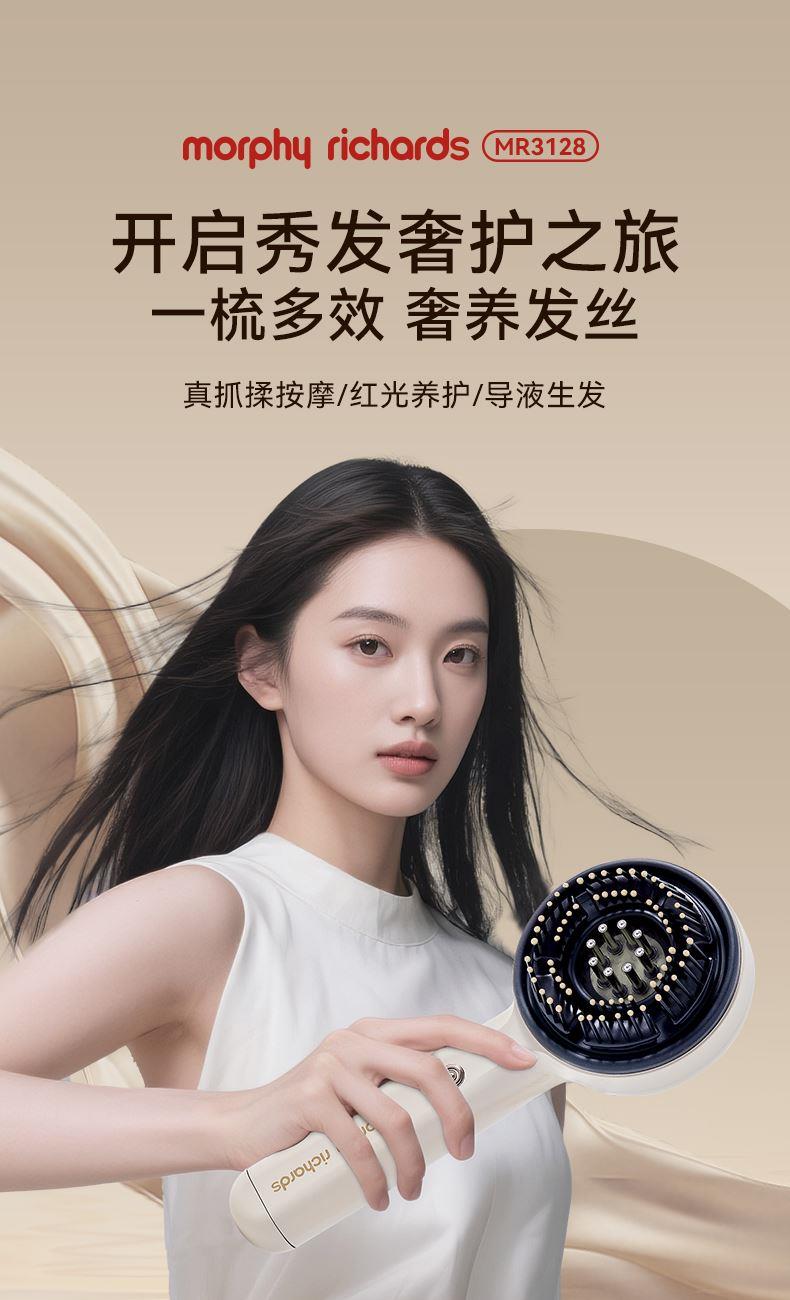 69码 6975660321281 型号 MR3128 产地 浙江温州 净重 250g 毛重 480g 包装尺寸 24X11.7X6.3cm(彩盒) 大箱尺寸 51.5×40×52.5cm 续航:约10天(每天使用2次) 充电时间:3小时±0.5小时 充电电压:5V/1A 工作功率:10W 充电接口:Type-C 电池容量:1400毫安 配件:主机,充电线,收纳袋,说明书 执行标准:GB4706.1-2005/GB4706.10-2008 卖点: “真抓揉”开穴舒筋,解压助眠 红光光波理疗,呵护头皮 圆润梳齿,按摩不伤头皮,蓬松顺发 边梳边导液,营养直达头皮,高效吸收 大容量长续航,可使用约10天 流线型握把,轻巧易握,小巧收纳