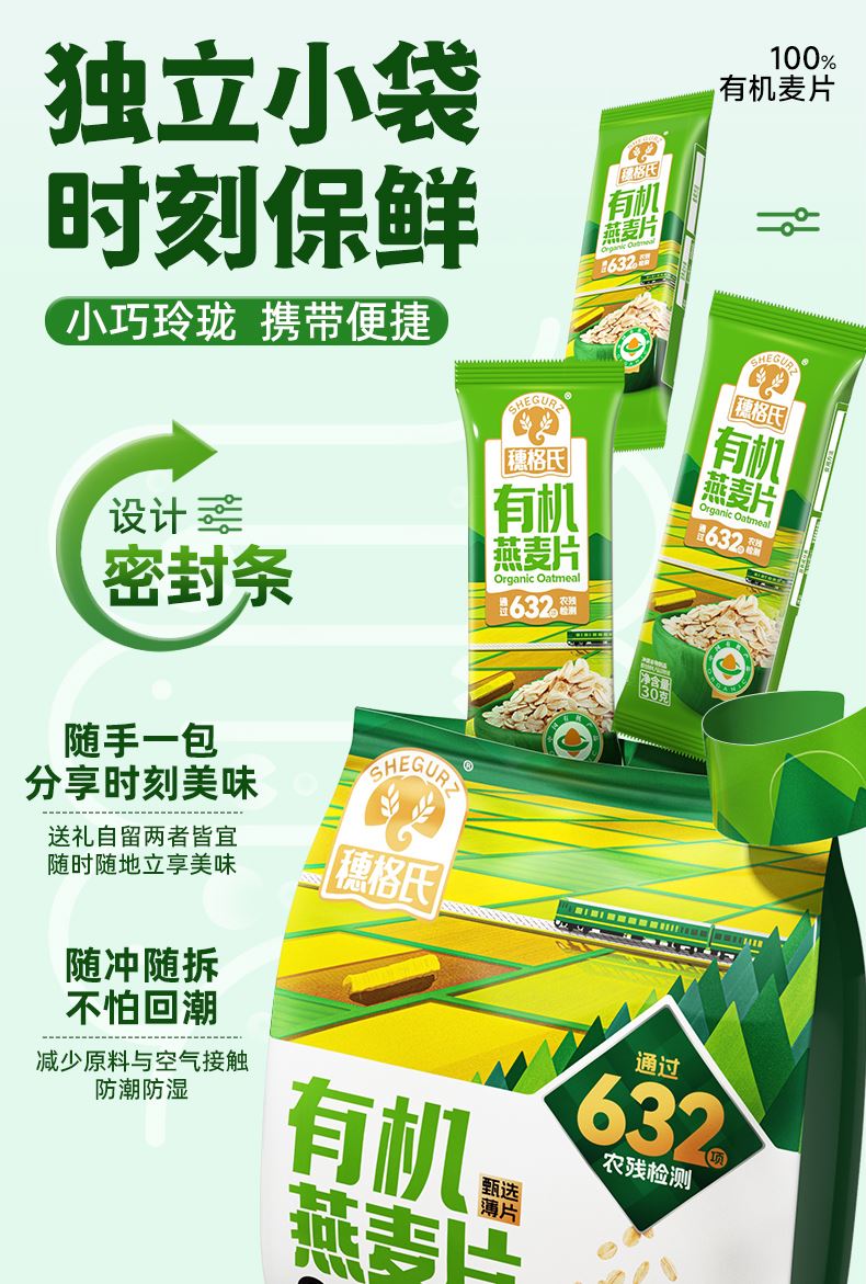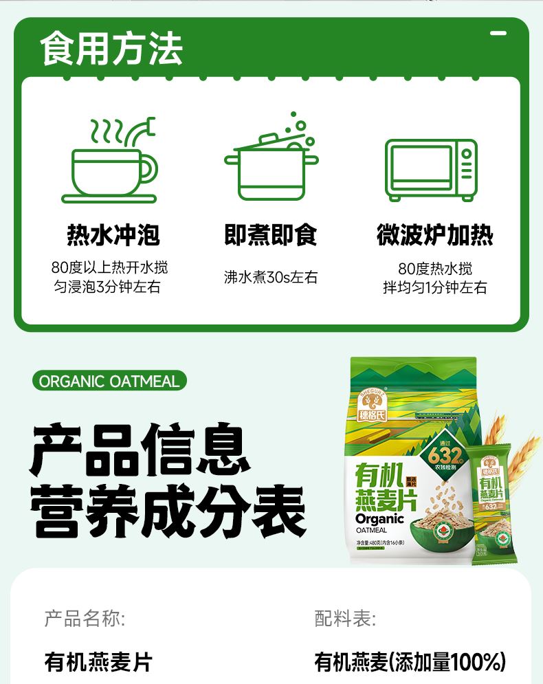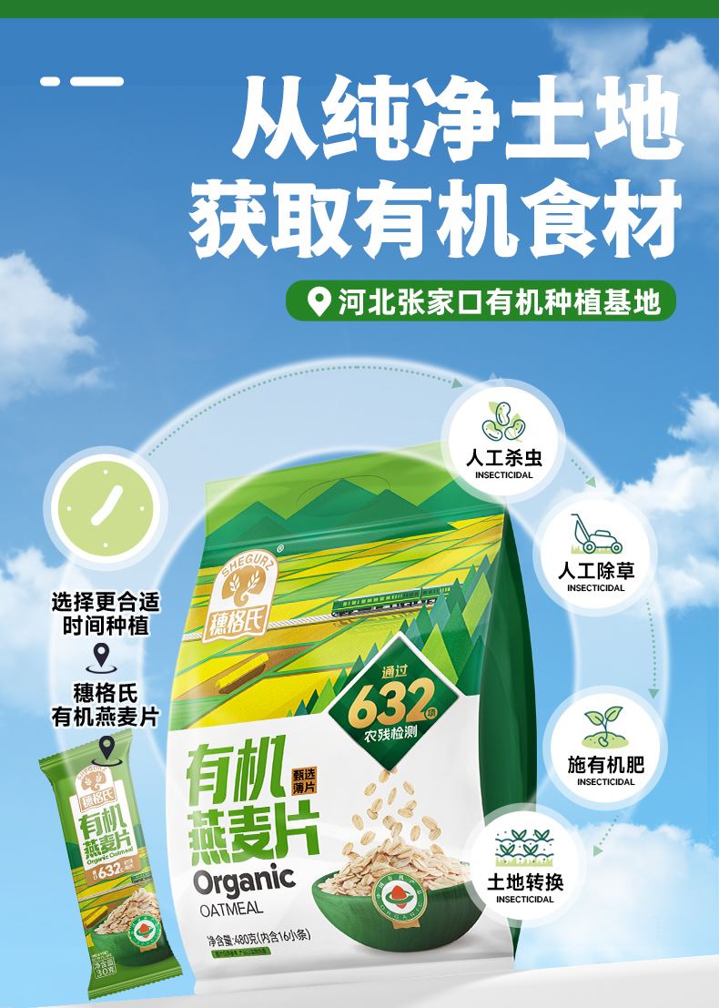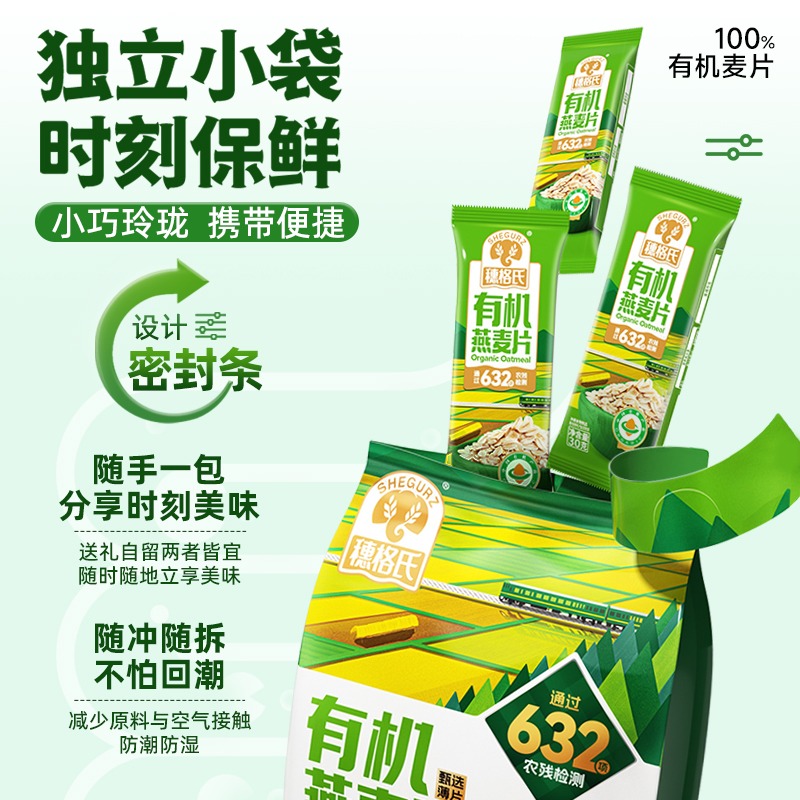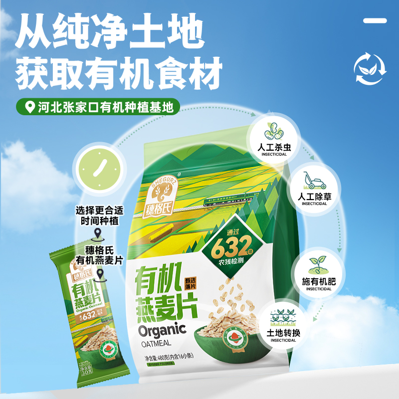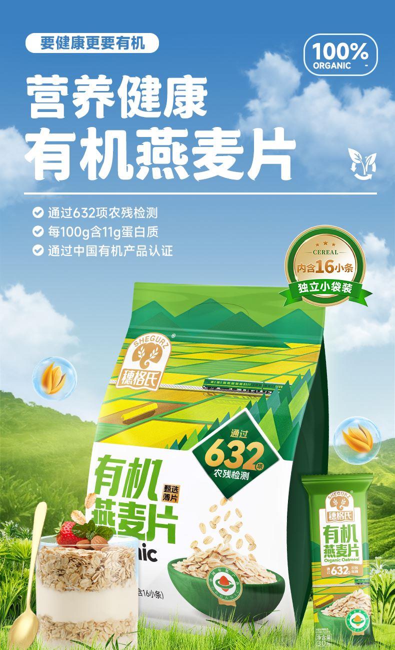 穗格氏有机燕麦礼盒480g(30g*16条) 配料表:有机燕麦片 产品卖点: 1,一罐一码 全程有机可追溯; 2,穗格氏专属有机种植基地,张家口市农业科学院育成品种“坝莜一号”; 3,高膳食纤维,含有蛋白质,无添加蔗糖,含维生素B1; 4,通过632项农残检测; 5,适合青少年,上班族,宝妈,中老年人的有机新生活。 6,小袋装,一顿一袋。