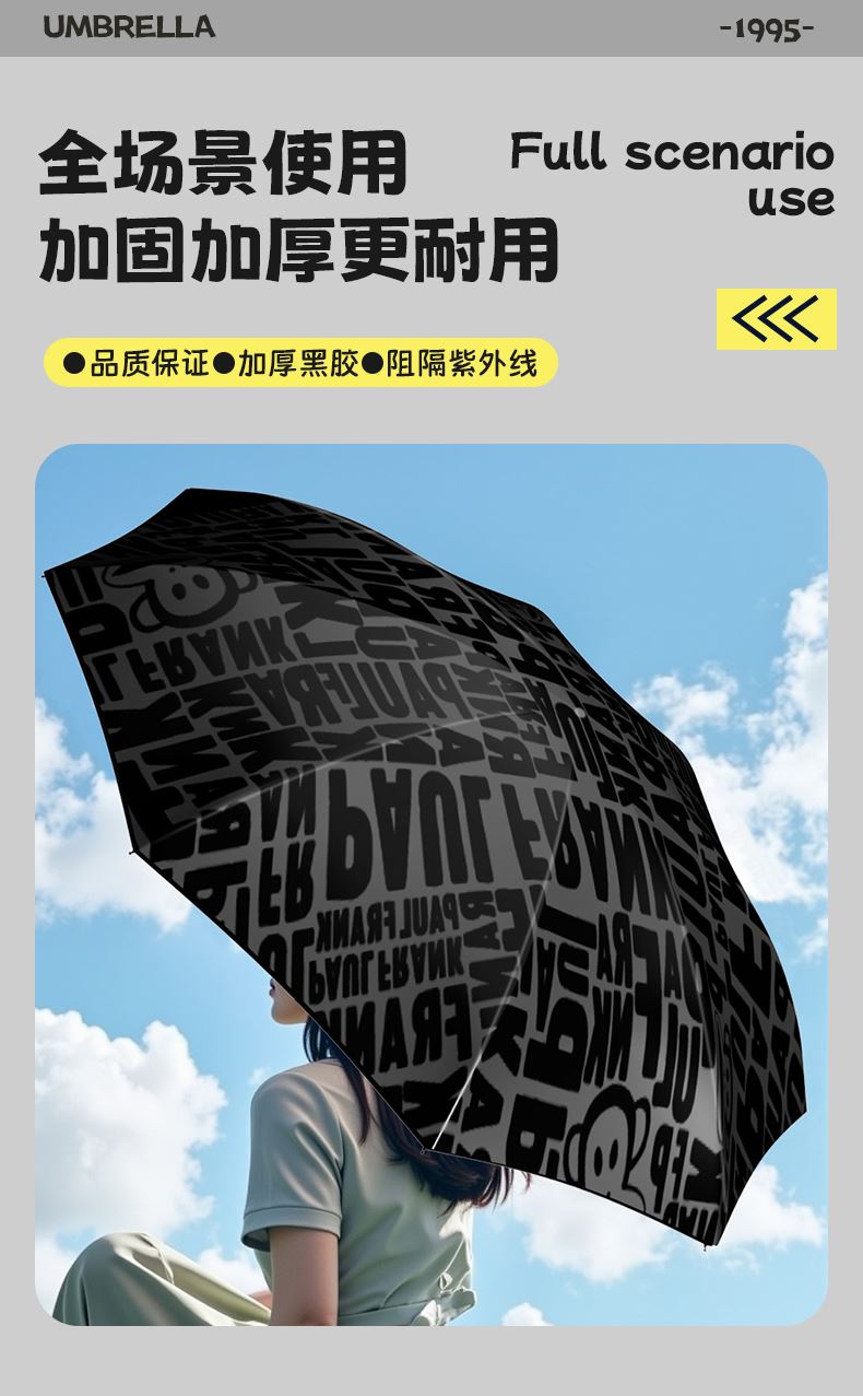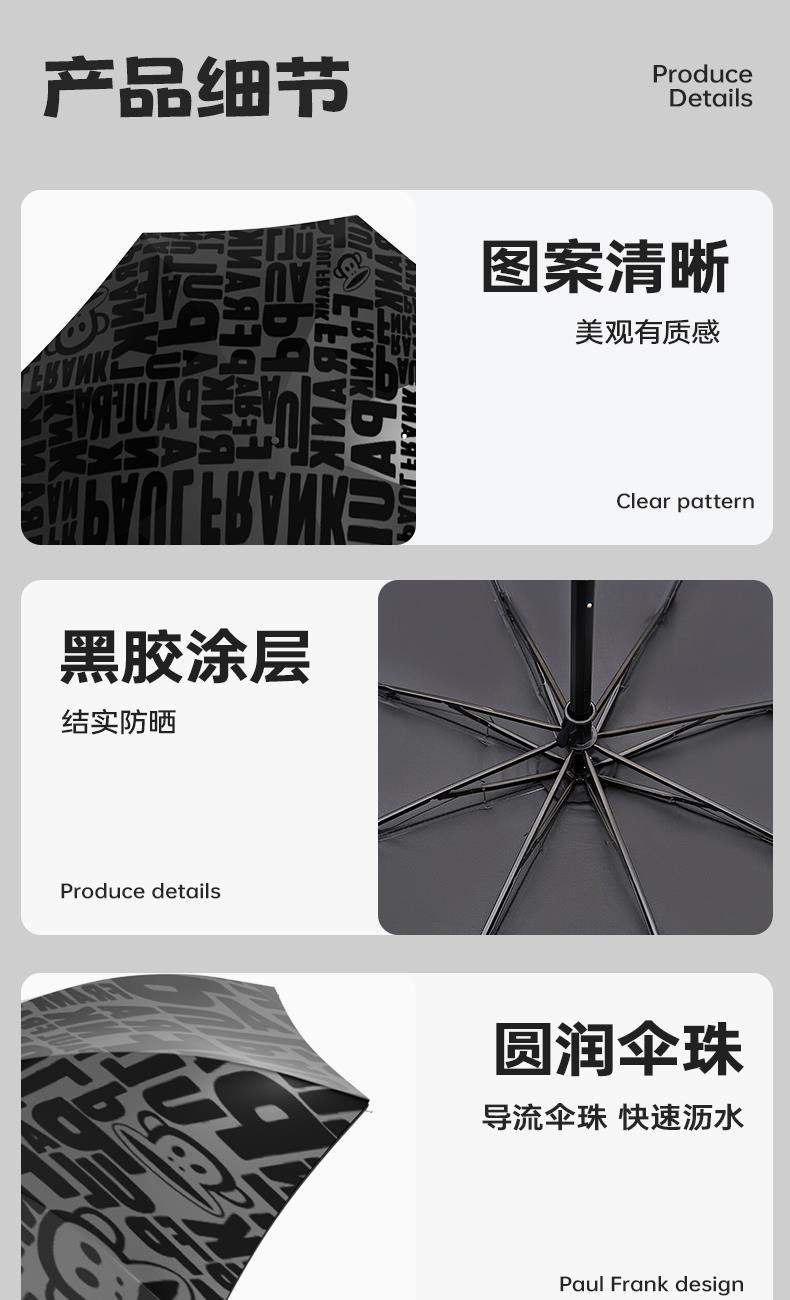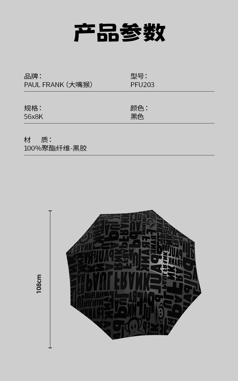 产品型号:PFU203 产品容量:56cm*8K 颜 色:黑色 产品材质:铁/半遮光黑胶 产品配置: 伞*1