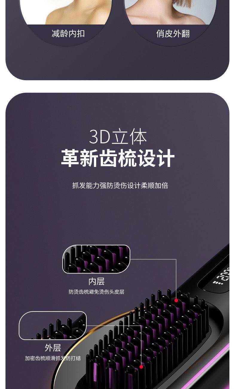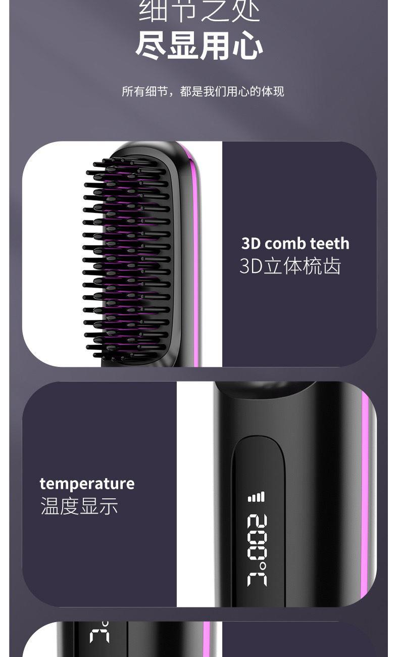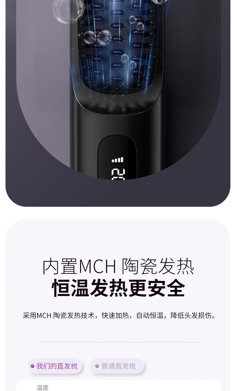 1、无线护发直发梳,不受线控,轻松造型 2、采用MCH陶瓷发热技术,20秒快速加热,自动恒温,降低头发损伤 3、三档温度调节,照顾不同发质,显示更直观,温度多少,一目了然 4、3D立体革新齿梳设计,抓发能力强,防烫伤设计柔顺加倍 5、小身材,放入包包,携带方便