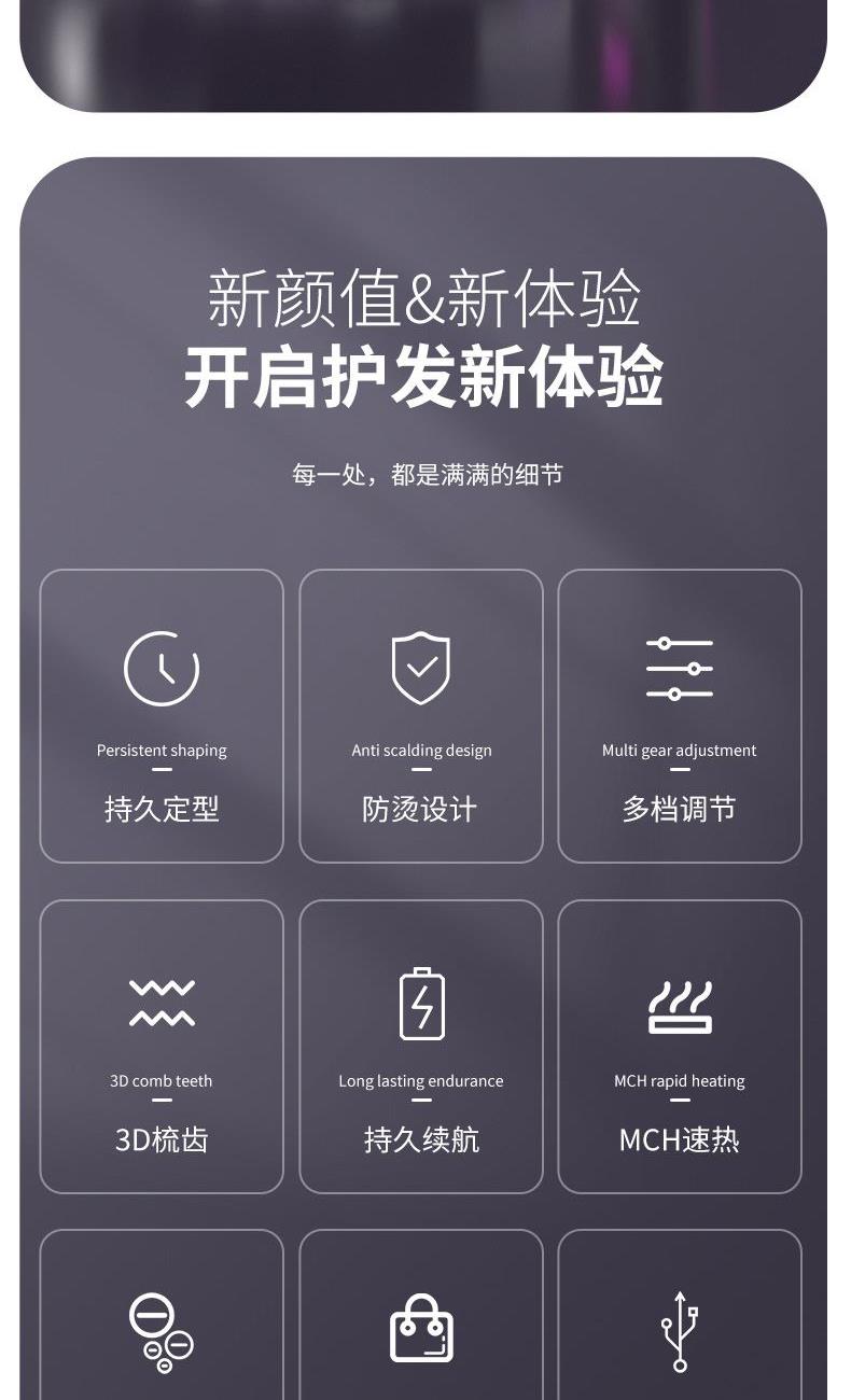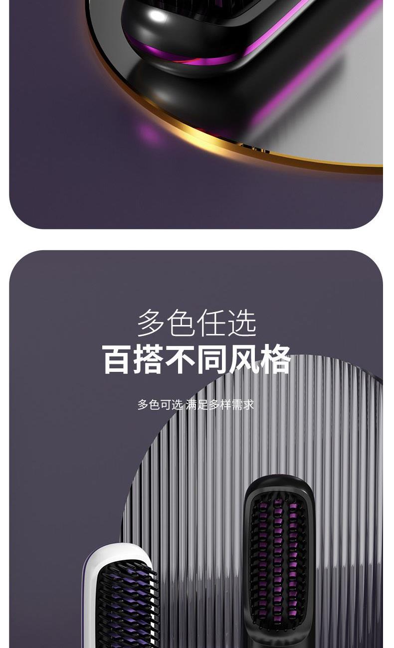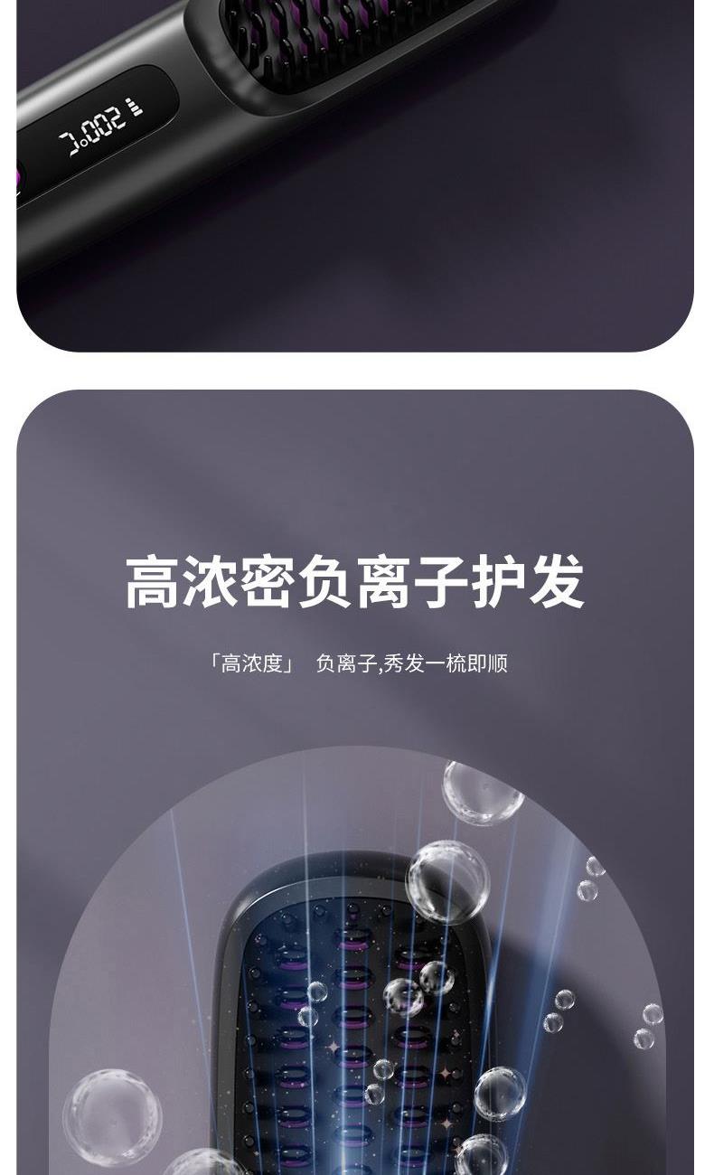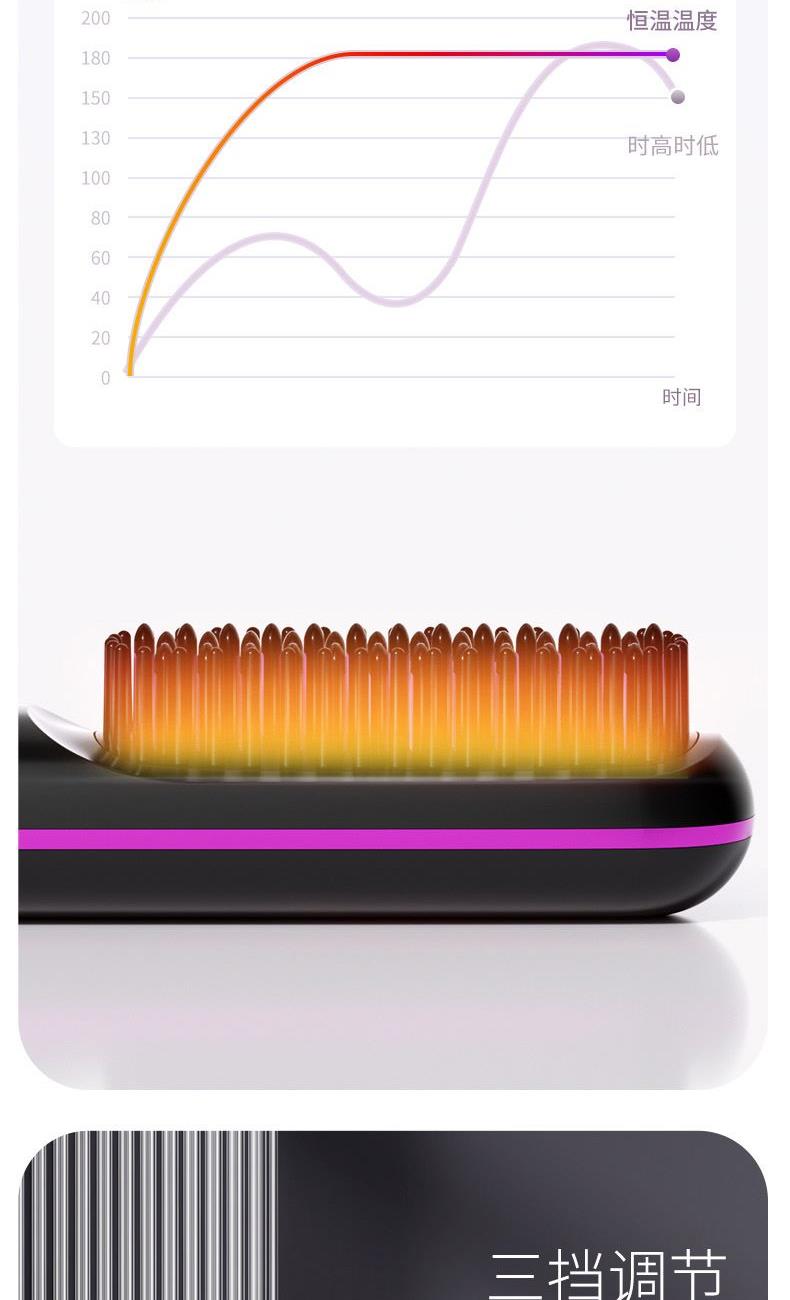 1、无线护发直发梳,不受线控,轻松造型 2、采用MCH陶瓷发热技术,20秒快速加热,自动恒温,降低头发损伤 3、三档温度调节,照顾不同发质,显示更直观,温度多少,一目了然 4、3D立体革新齿梳设计,抓发能力强,防烫伤设计柔顺加倍 5、小身材,放入包包,携带方便