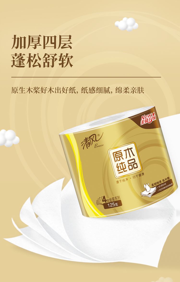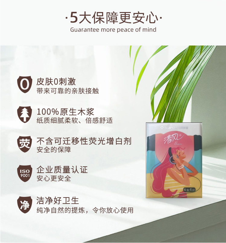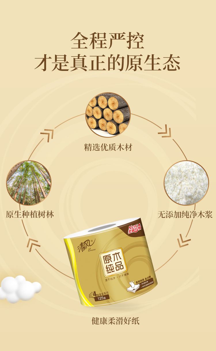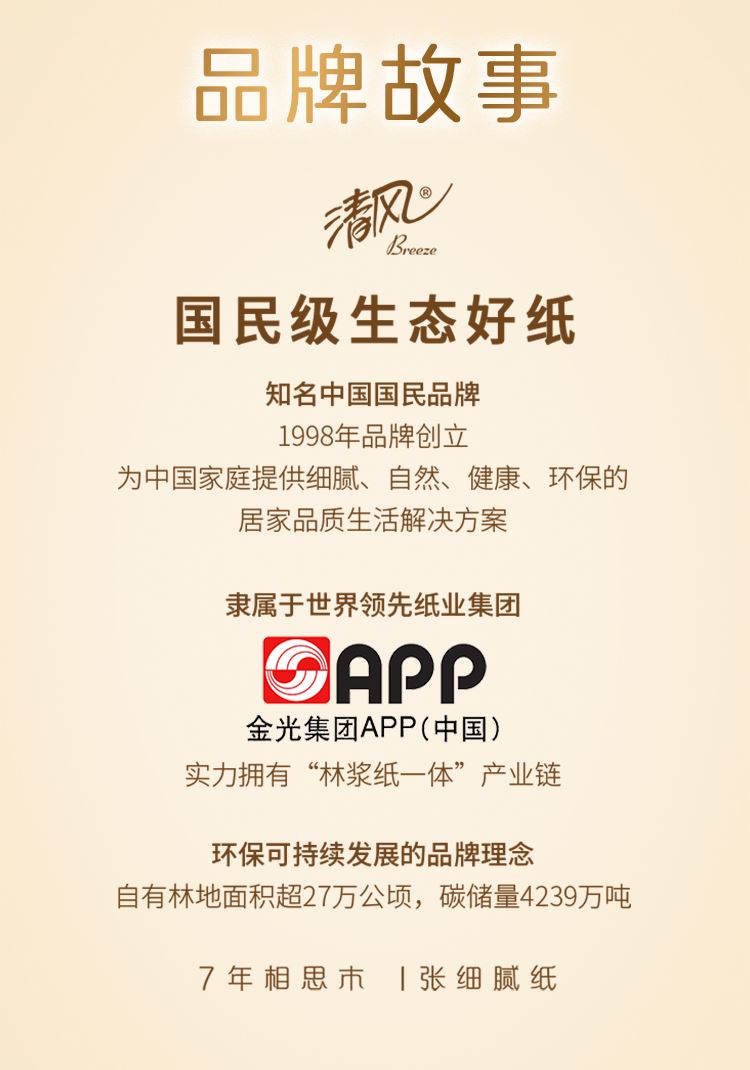 香型:无香  主要原料:原生木浆 保质期:3年  细腻好纸,7年相思木,1张细腻纸。 1.原生木浆 使用原生种植林原木生产的木浆,从源头保证绿色健康品项。全程严控更放心,不添加可迁移性荧光增白剂。 2.三层厚实,蓬松舒软 原生木浆好木出好纸,纸感细腻,棉柔亲肤。 3.湿水依旧强韧 湿水不易破,吸水力UP,多场景安心使用。 4.纤维交织紧密 长短纤维交织工艺,黄金配比,成就柔韧细腻,不掉屑、不分层,自然亲肤,品质呵护。 清风 隶属于金光集团APP,实力拥有“林浆纸一体”产业链,“种6棵,用1棵”,在国内自有林场地面积超过27万公顷,碳储量4239万吨。
