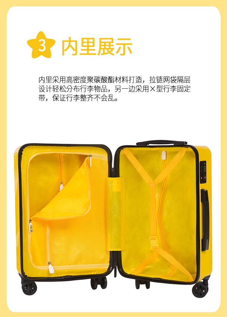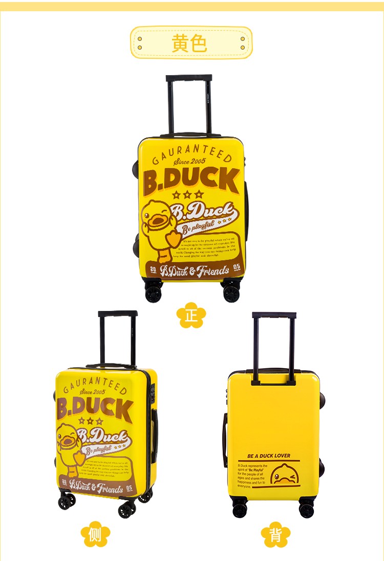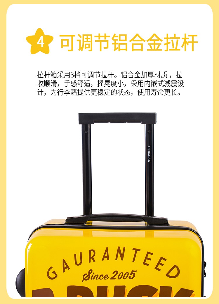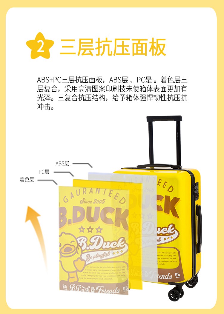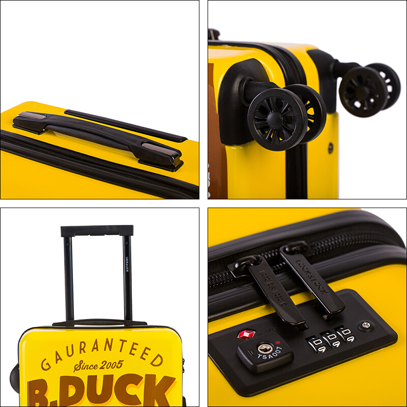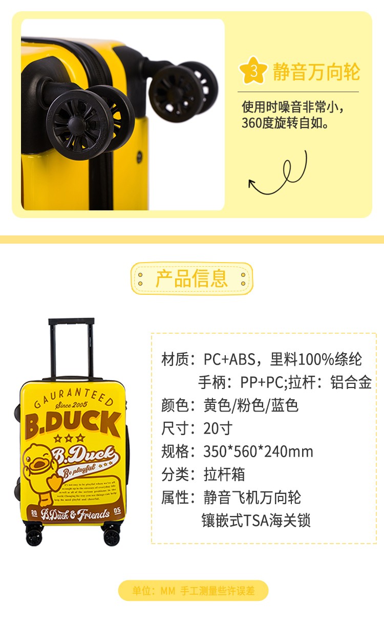 材质:PC+ABS 里料-绦纶 产品颜色:黄 产品尺寸:20寸 小黄鸭正版授权,时尚靓丽 镶嵌式TSA海关密码锁,出行无忧 静音飞机万向轮,轻盈便利 三层抗压面板,箱体更光泽 铝合金可调节拉杆,稳定耐用 高弹面料,卡通拉链,丰富有趣