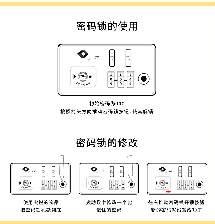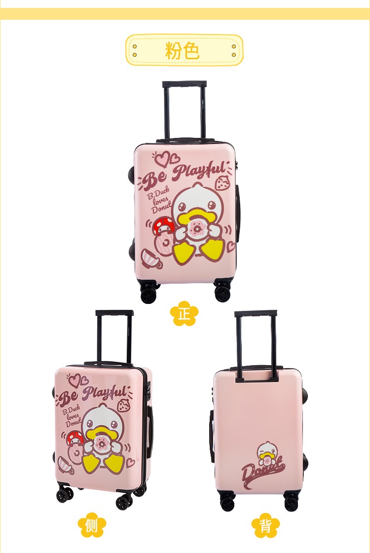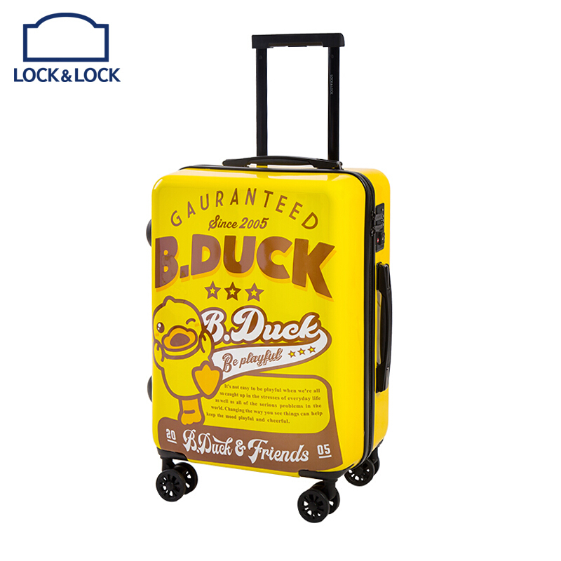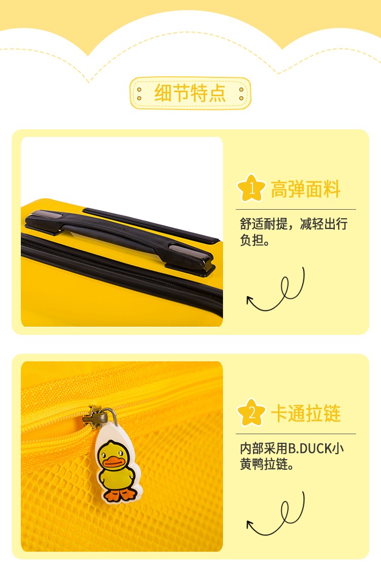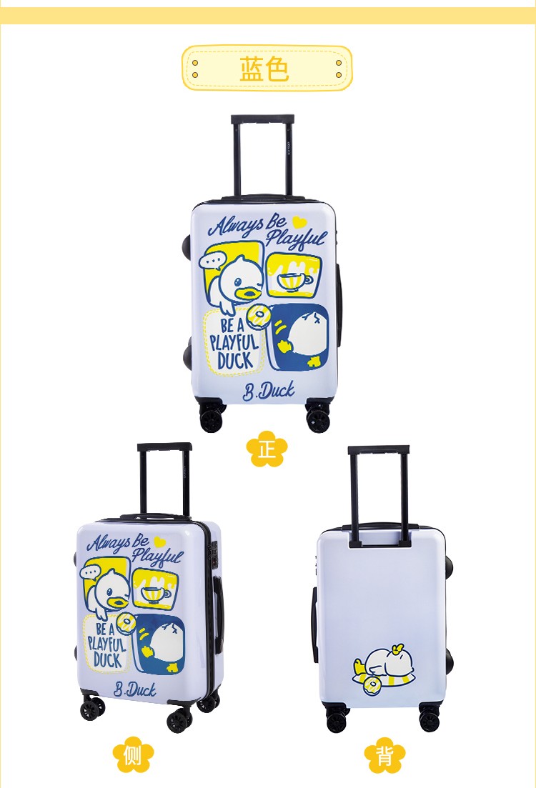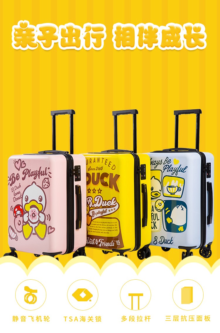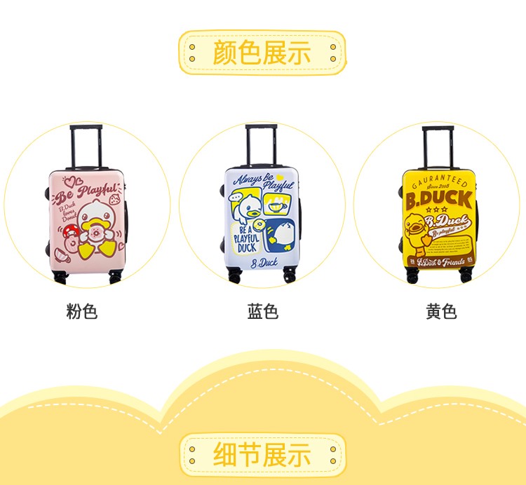 材质:PC+ABS 里料-绦纶 产品颜色:黄 产品尺寸:20寸 小黄鸭正版授权,时尚靓丽 镶嵌式TSA海关密码锁,出行无忧 静音飞机万向轮,轻盈便利 三层抗压面板,箱体更光泽 铝合金可调节拉杆,稳定耐用 高弹面料,卡通拉链,丰富有趣