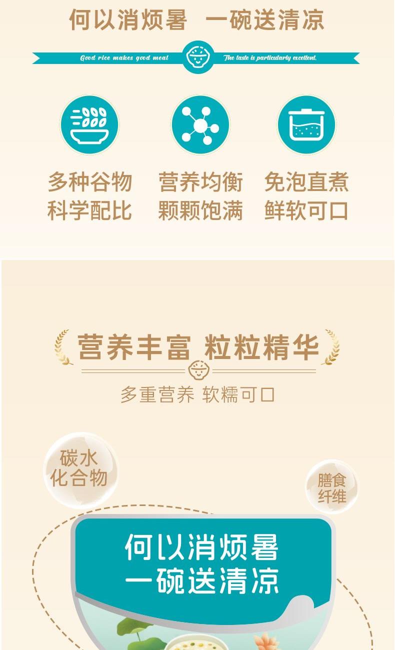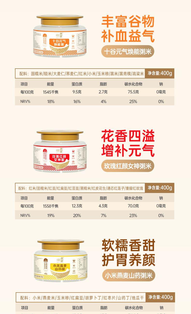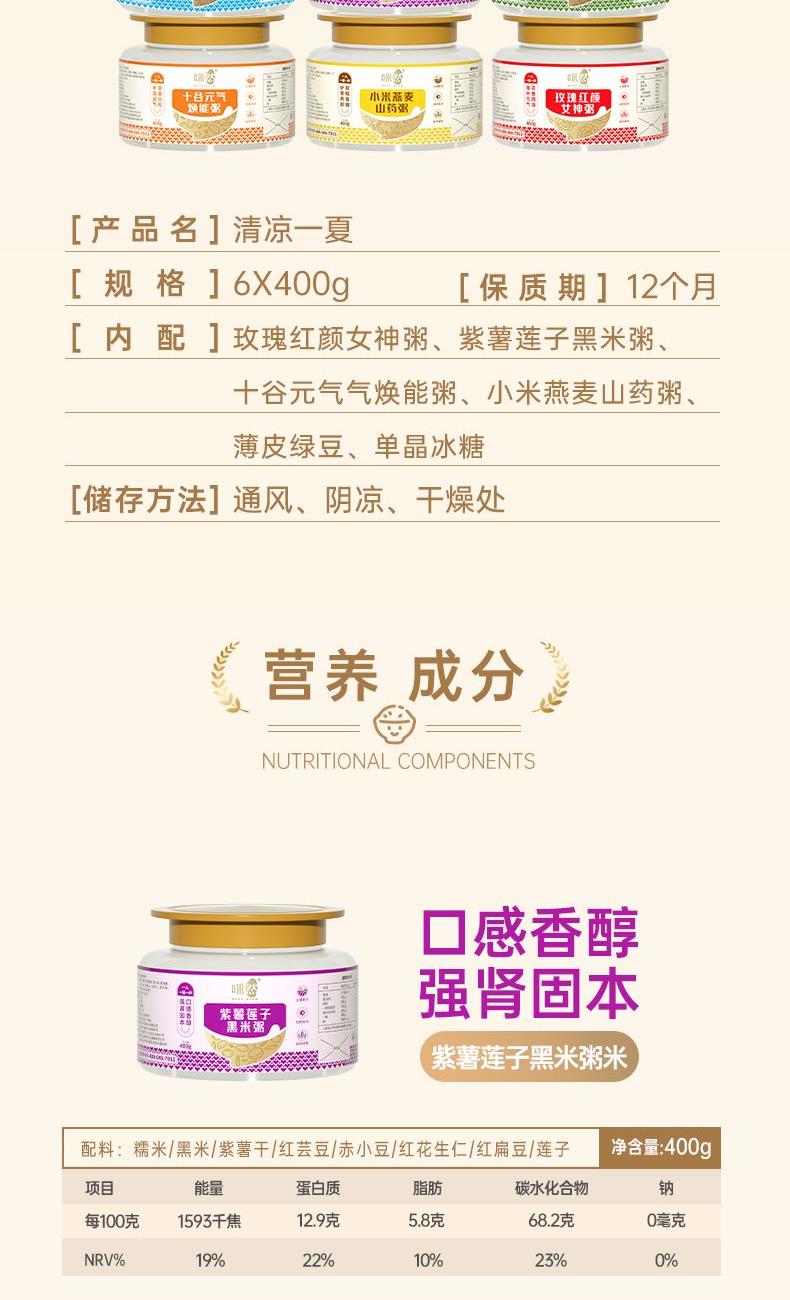 质量等级 :一级 保 质 期 :12个月 产 地 :辽宁锦州 箱 规 :400g*6 内配 : 十谷元气焕能粥米 小米燕麦山药粥米 玫瑰红颜女神粥米 紫薯莲子黑米粥米 绿 豆 冰 糖
