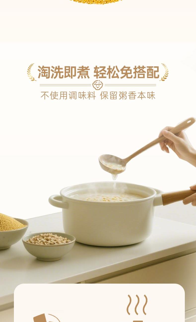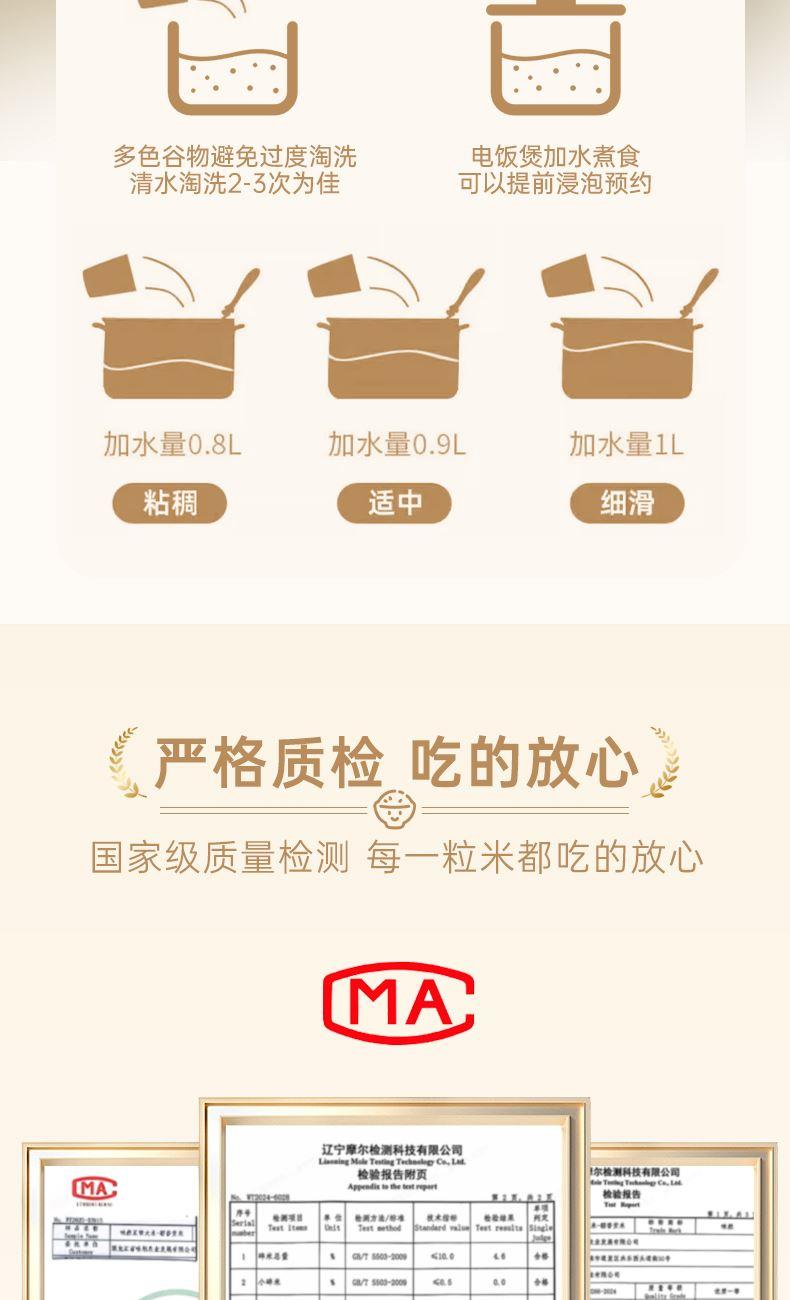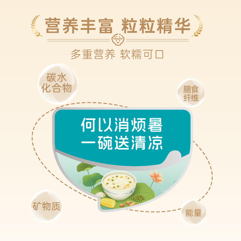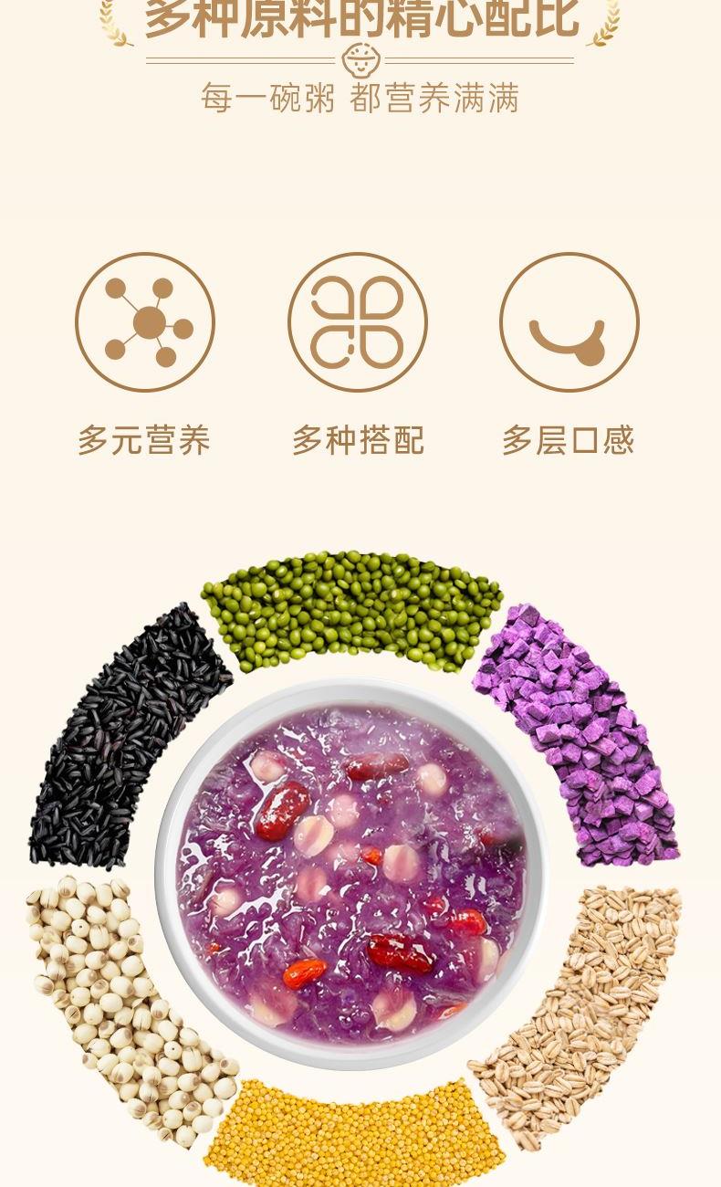 质量等级 :一级 保 质 期 :12个月 产 地 :辽宁锦州 箱 规 :400g*6 内配 : 十谷元气焕能粥米 小米燕麦山药粥米 玫瑰红颜女神粥米 紫薯莲子黑米粥米 绿 豆 冰 糖