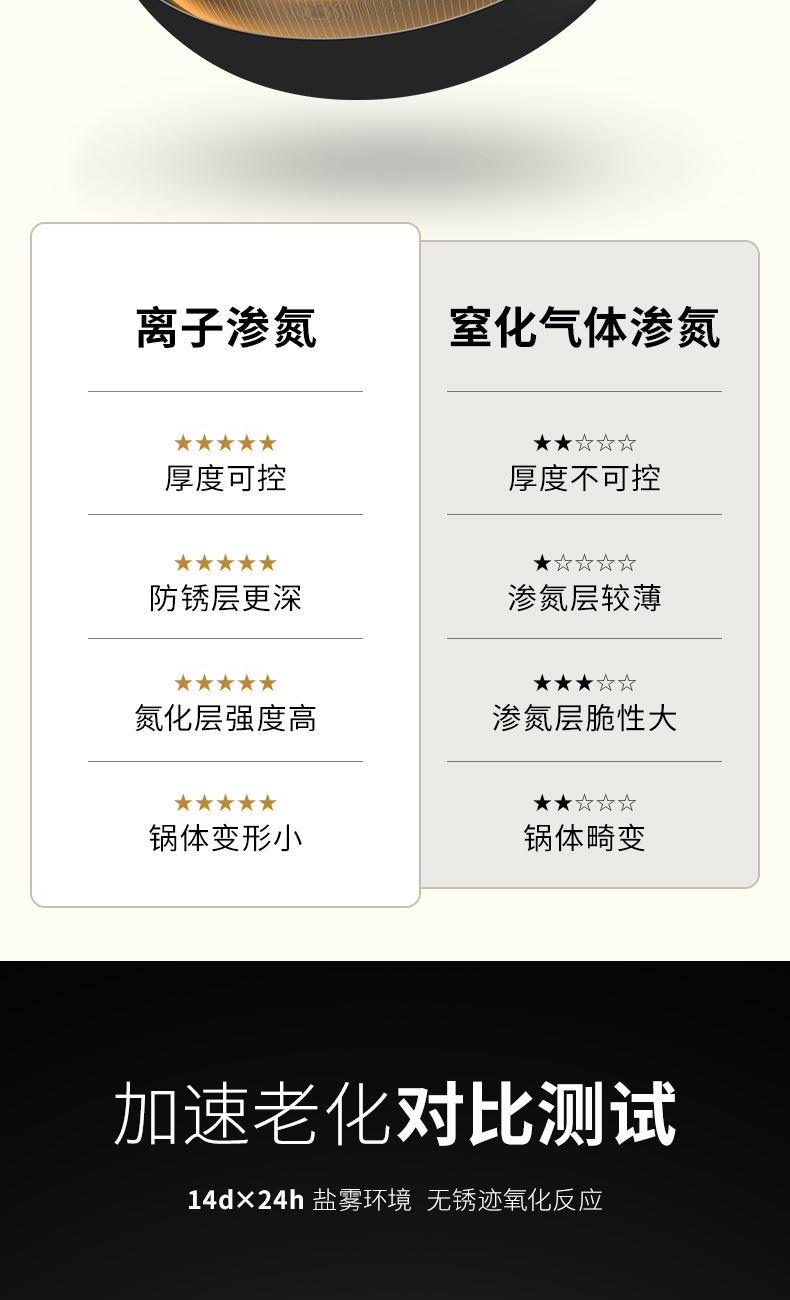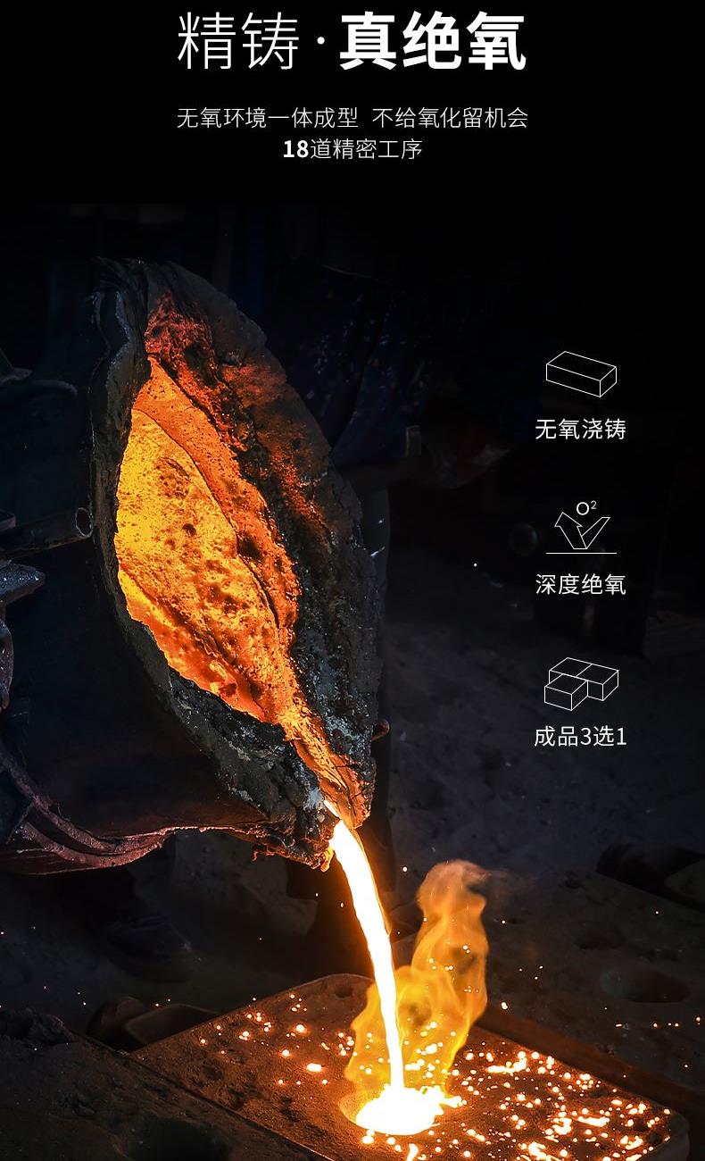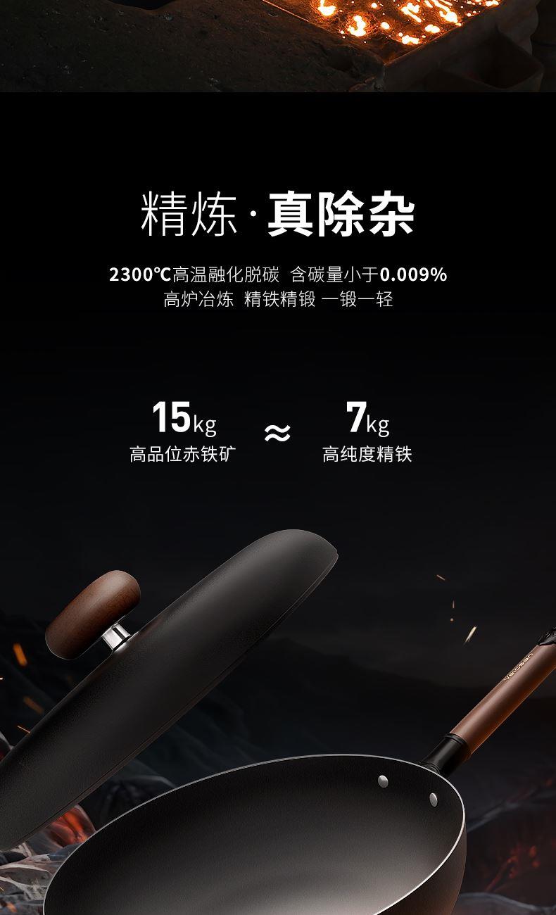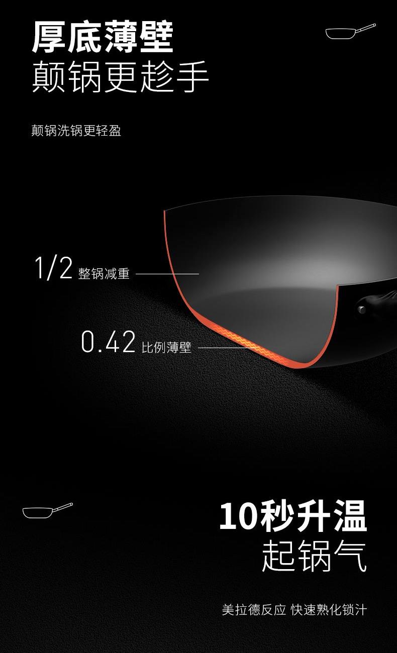 【材质】精铁 【规格】32cm 【净重】2.2kg 【毛重】3.2kg 【包装方式】彩盒+邮购箱 【外箱尺寸】395*125*395mm 【颜色】黑色 产品特点: 1.真精铁,Sa3级防锈; 2.深层渗氮,少油不粘; 3.厚底薄壁,颠锅更趁手; 4.平底设计,全灶适用。