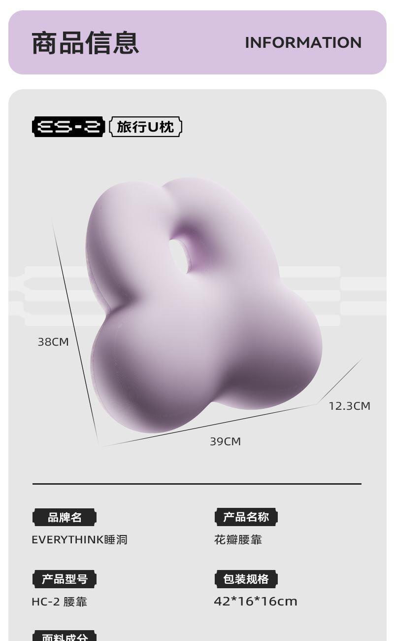 YS3趴枕 规格参数: 填充物 ■聚氨酯(记忆绵) 外侧面料■75%涤纶+25%氨纶 内侧面料92%涤纶+8%氨纶 规格:趴枕*1 单台包装尺寸:195*190*205;单台重量:700g(含彩盒) 规格:12台 HC2 花花腰靠 规格参数: 正面面料:锦纶87%,氨纶13% 背面面料:聚酯纤维90%,氨纶10% 规格:腰靠*1 单台包装尺寸:420*160*160;单台重量:800g(含彩盒) 规格:10台 可选颜色:紫色、灰色、浅蓝 VS2 降噪眼罩 规格参数: 面料:尼龙75%+氨纶25% 耳塞:硅胶,水性聚氨酯 规格:眼罩*1 单台包装尺寸:180*70*18;单台重量:22g(含彩盒) 可选颜色:幽雅黑