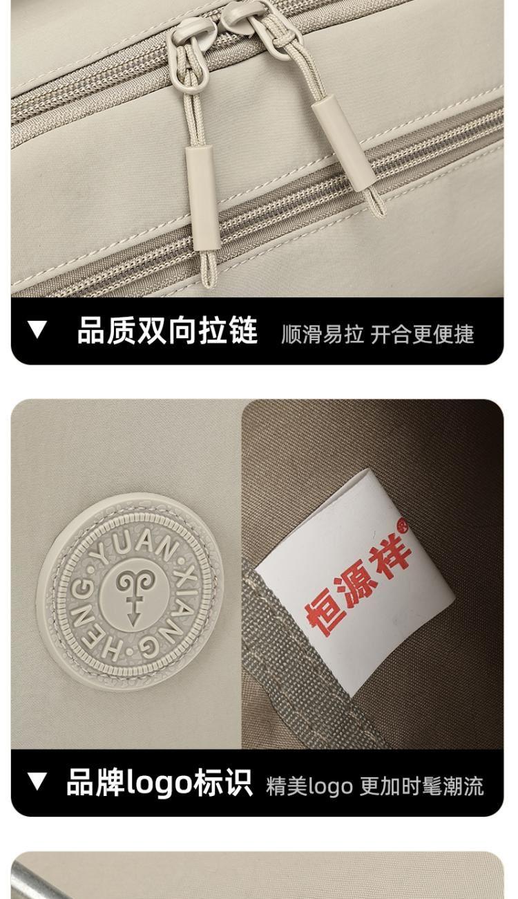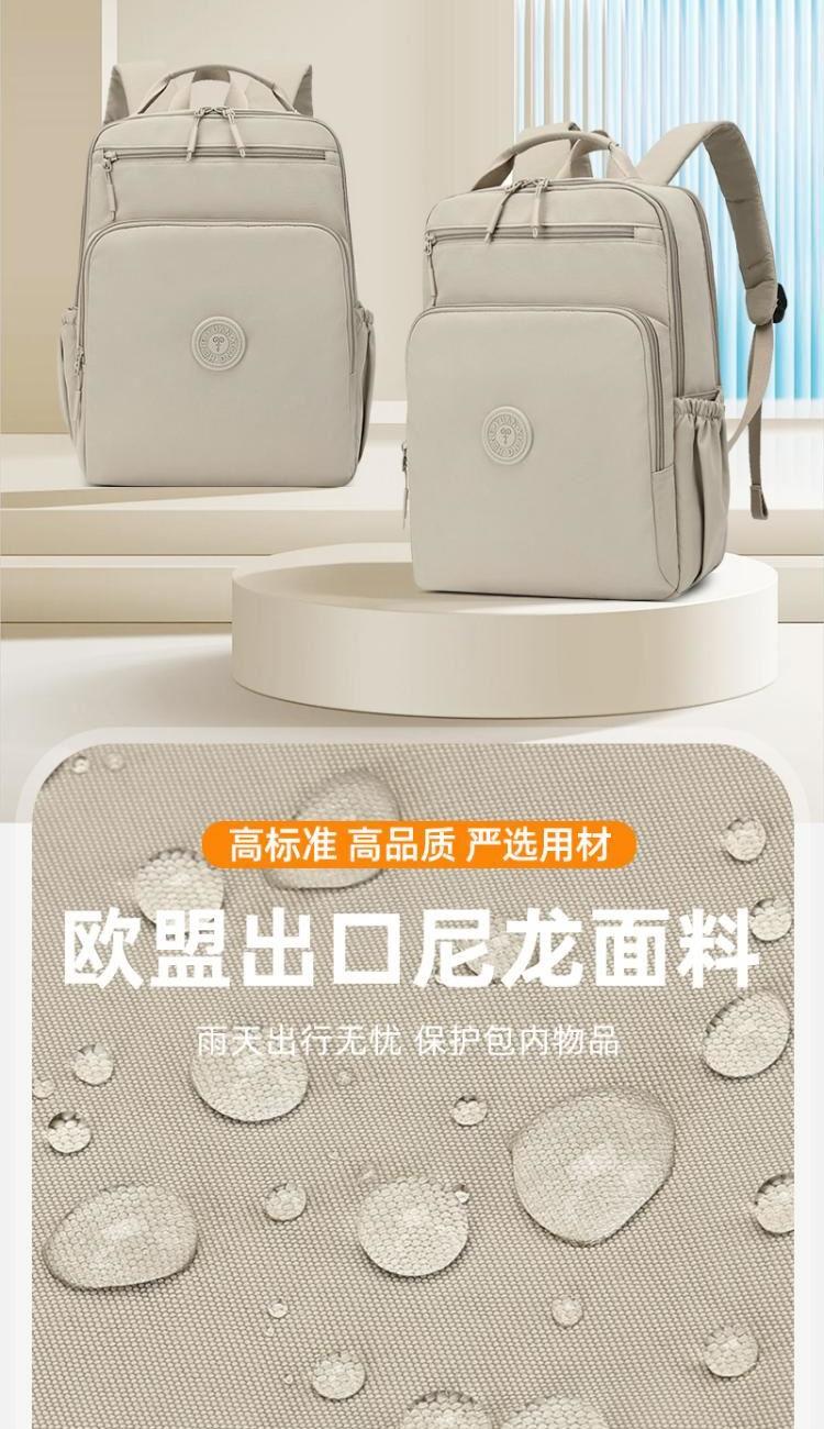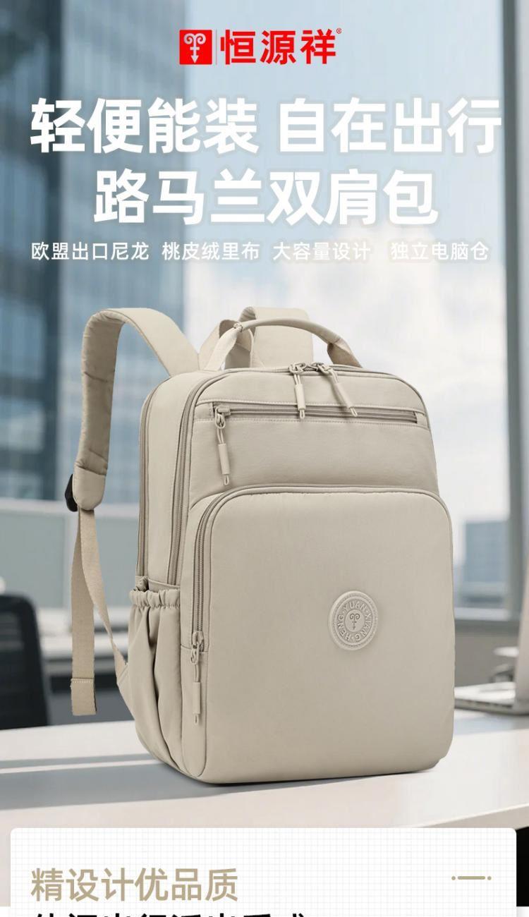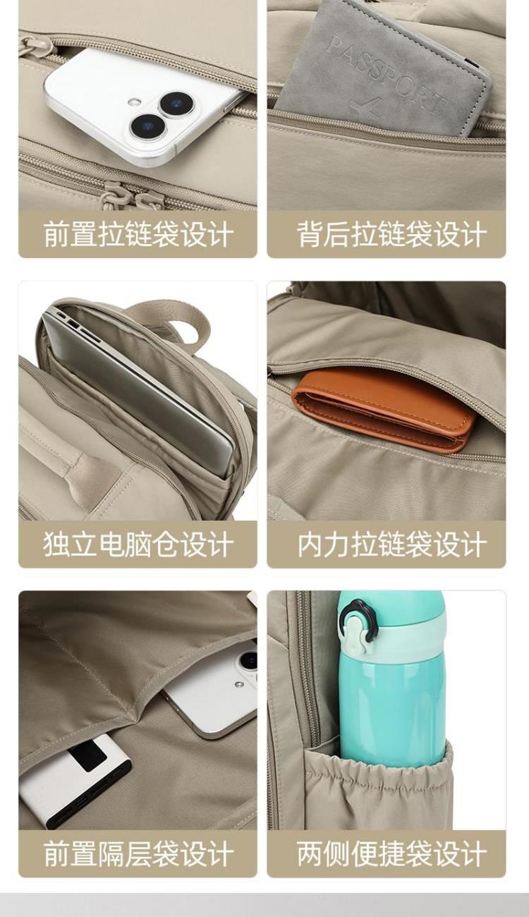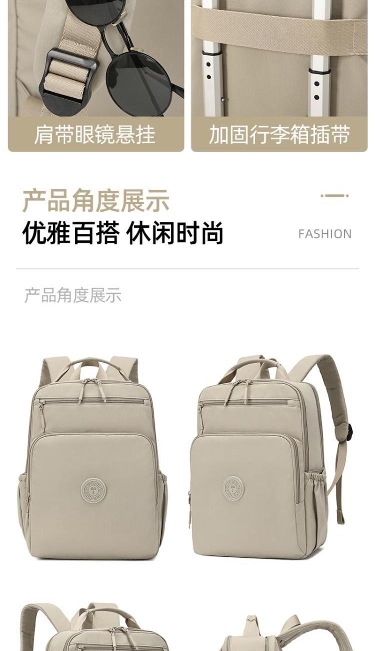 产品型号:HYX9009 产品重量:0.58kg 产品规格:37*33*14cm 产品颜色:卡其色 产品卖点:优选欧美出口畅销防水尼龙材质,时尚、结实; 全配色设计,美观大方; 桃皮绒里布材质 ,柔软,细腻; 五层收纳空间,内置拉链暗袋+手机插袋,功能齐全; 尼龙织带,手感细腻,结实耐用; 背部拉杆织带,两侧水杯雨伞袋,出行更便捷。
