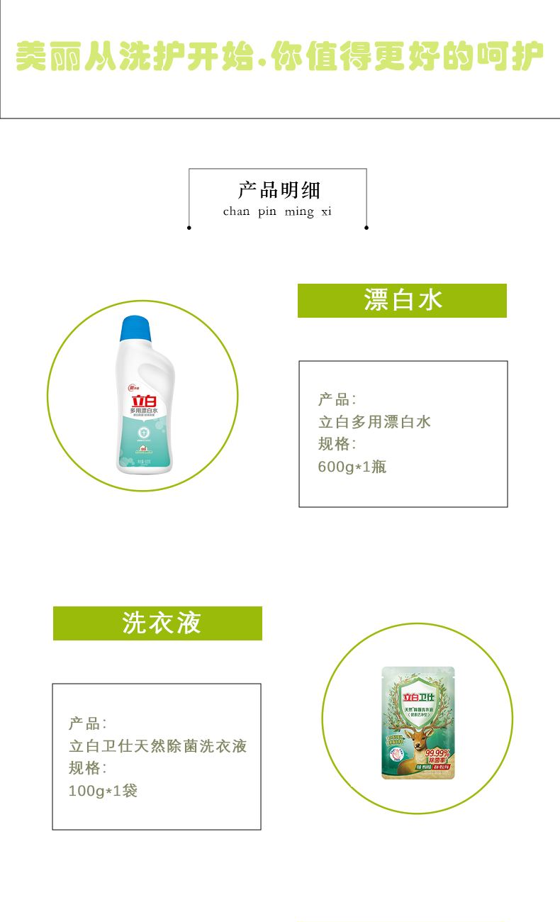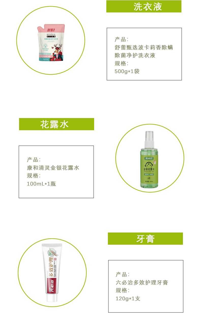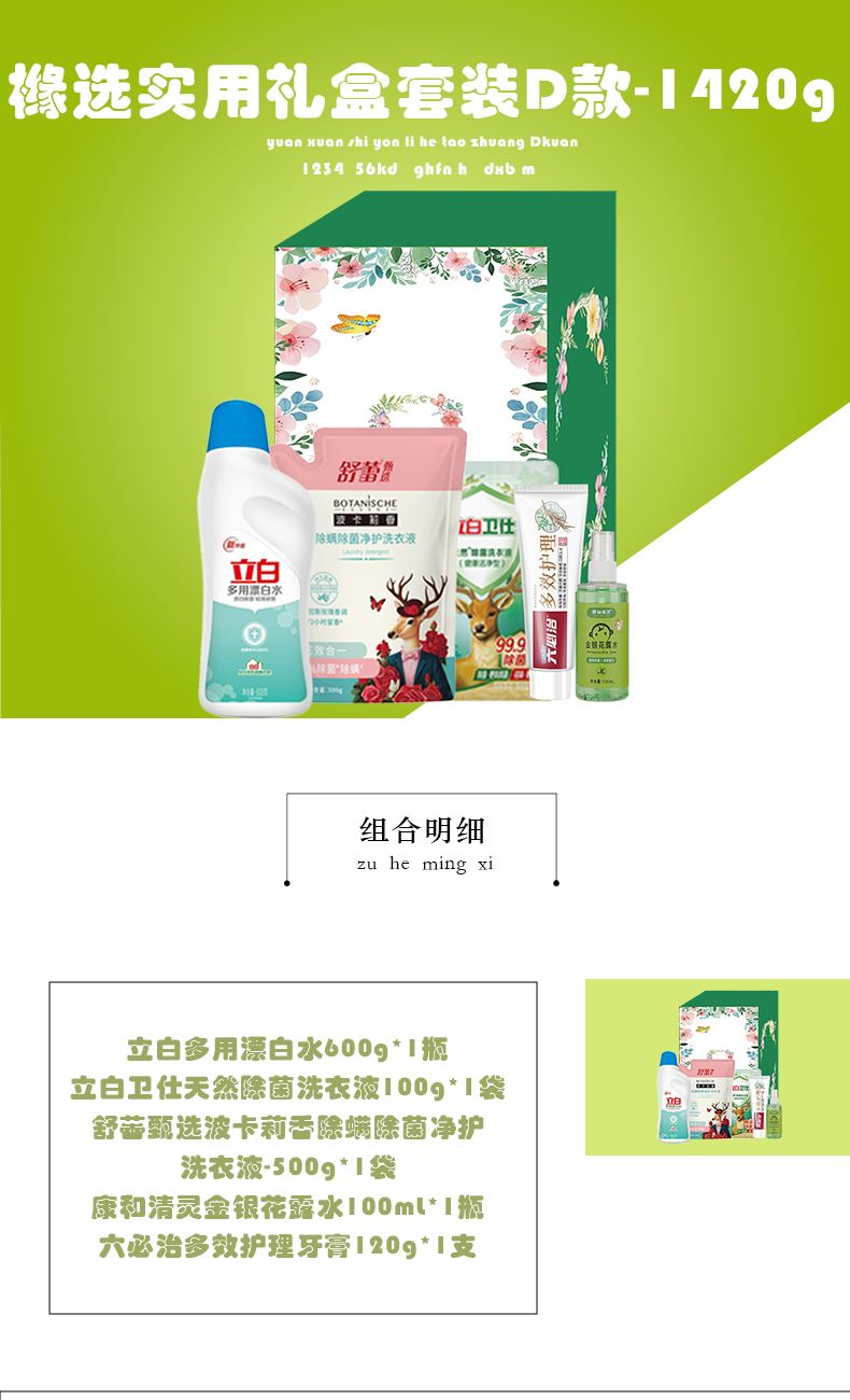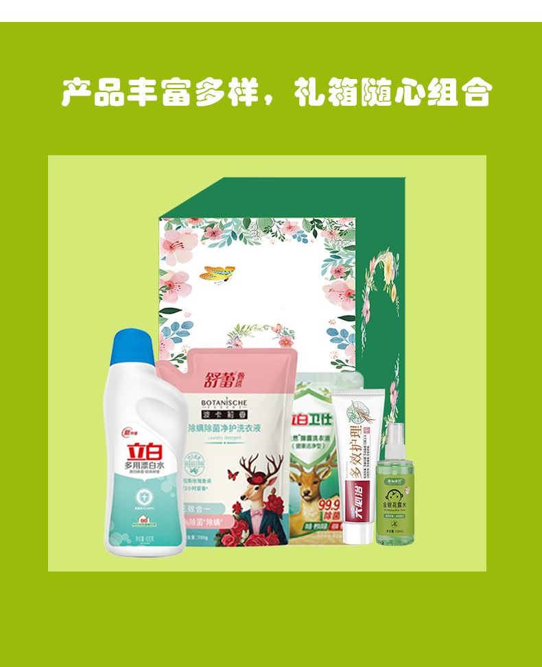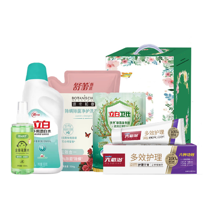 配置: 立白多用漂白水600g*1瓶 立白卫仕天然洗衣液100g*1袋 舒蕾甄选波卡莉香除螨净护洗衣液-500g*1袋 康和清灵金银花露水100mL*1瓶 六必治多效护理牙膏120g*1支 卖点: 可选产品丰富多样,礼箱随心组合,多种价位因需而定,充分满足各种送礼需求,是商务送礼、单位福利的用心之选。
