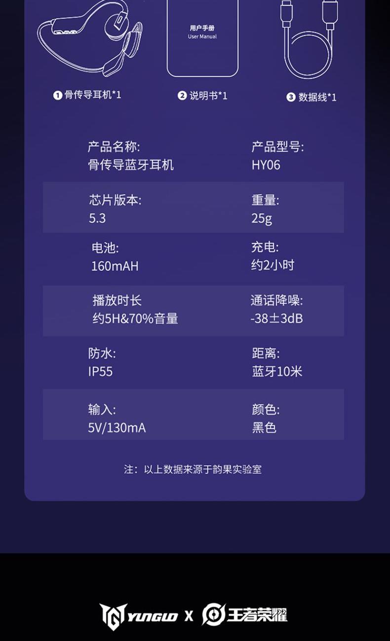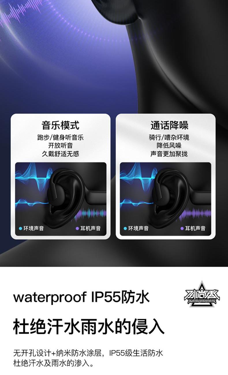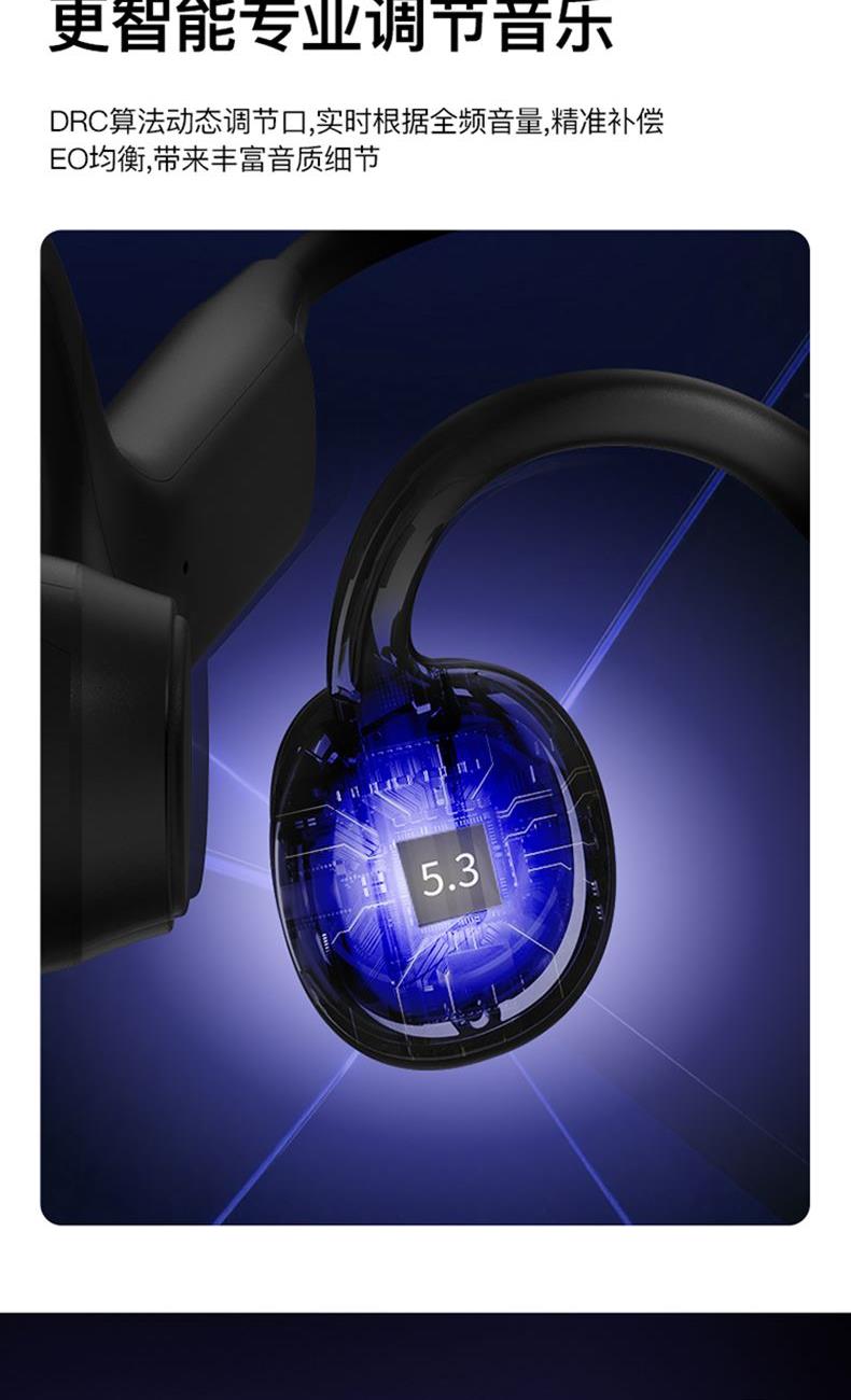 蓝牙版本:5.3 耳机重量:25g 电池:160mAh 充电:约2小时 播放:约5H&70%音量 通话降噪:-38±3dB 防水:IP55 距离:蓝牙10米 输入:5V/130mA 1.蓝牙5.3,传输速度更快更低的功耗,更好的连接稳定性 2.真骨传导开放聆听,全新震动单元清晰有力,带来更非凡的声场表现 3.新一代低音增强技术,搭配全新震动单元,低频下潜更深,环绕音效 4.舒适硅胶后挂,人体工程学贴耳设计,奔跑不脱落,不移位