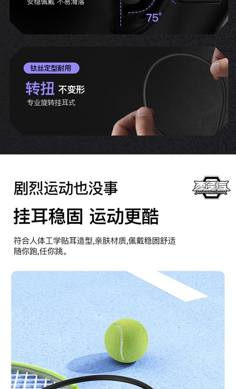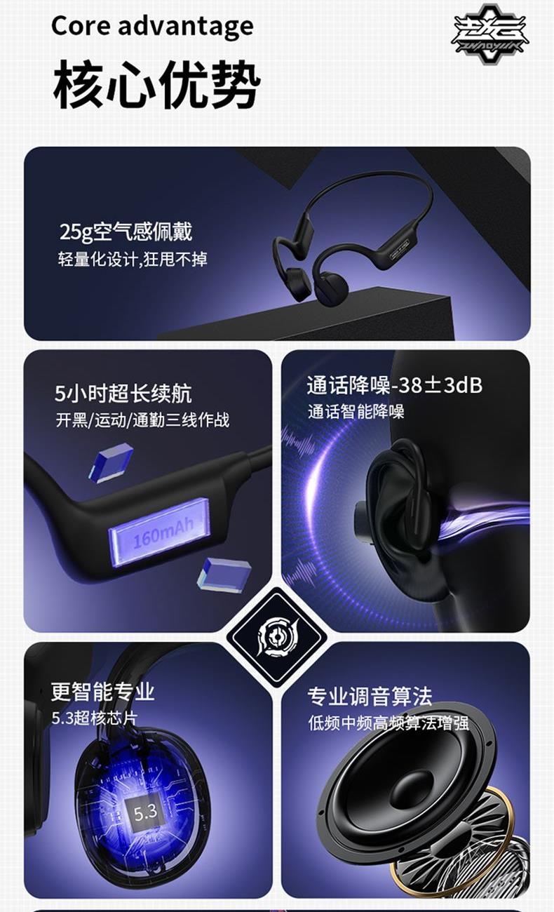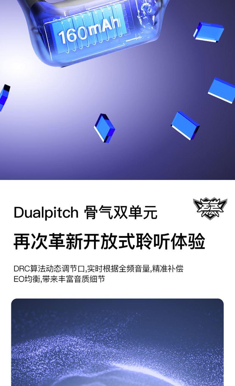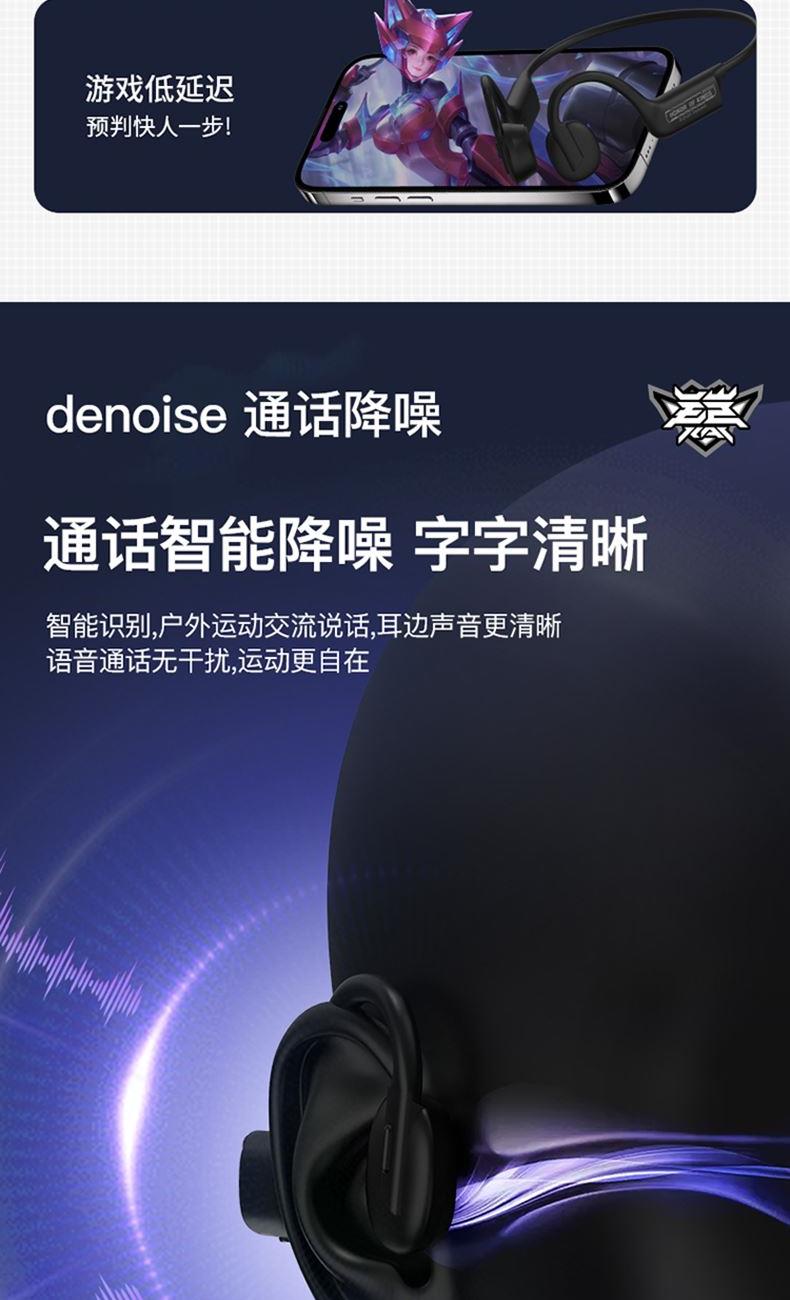 蓝牙版本:5.3 耳机重量:25g 电池:160mAh 充电:约2小时 播放:约5H&70%音量 通话降噪:-38±3dB 防水:IP55 距离:蓝牙10米 输入:5V/130mA 1.蓝牙5.3,传输速度更快更低的功耗,更好的连接稳定性 2.真骨传导开放聆听,全新震动单元清晰有力,带来更非凡的声场表现 3.新一代低音增强技术,搭配全新震动单元,低频下潜更深,环绕音效 4.舒适硅胶后挂,人体工程学贴耳设计,奔跑不脱落,不移位