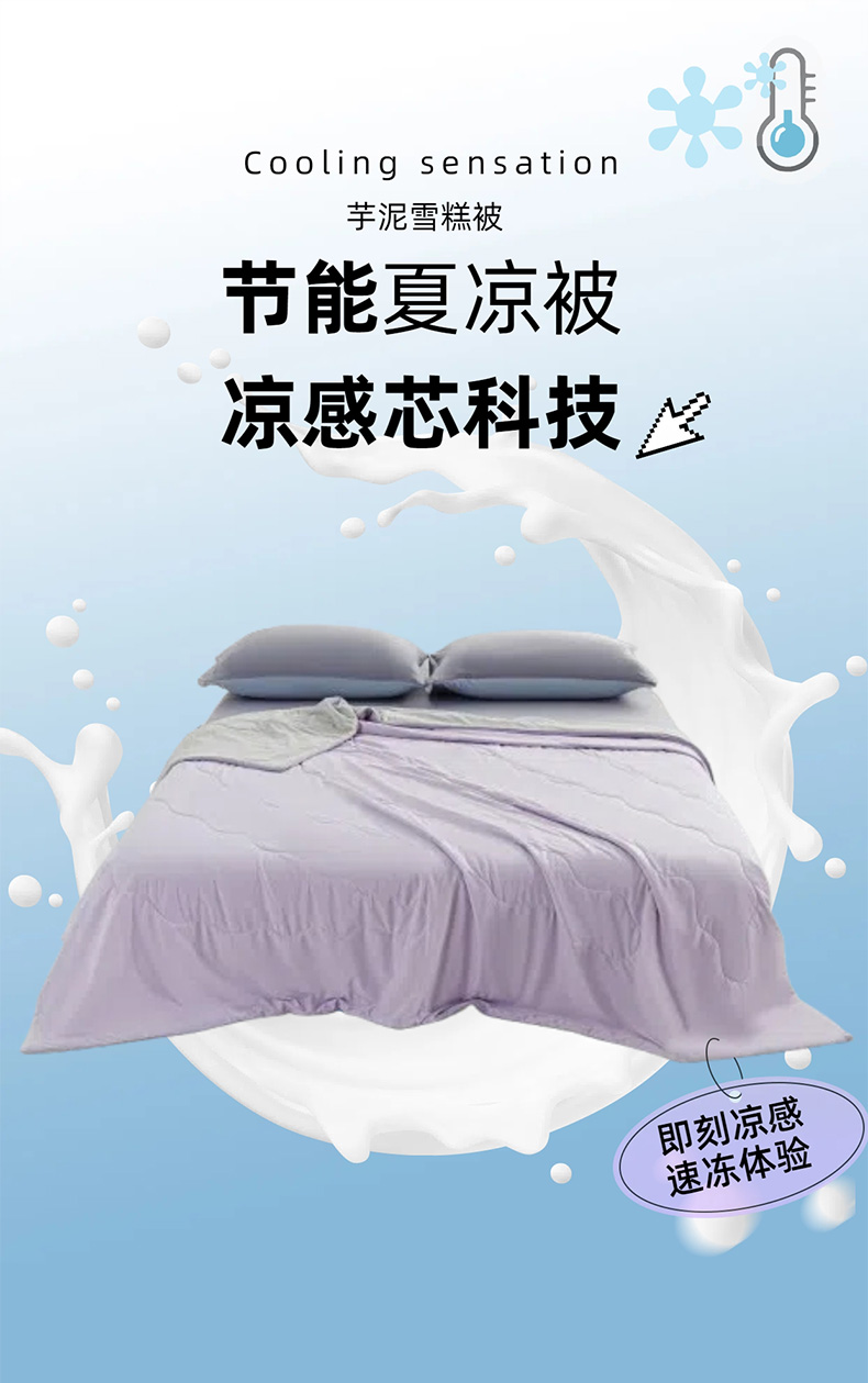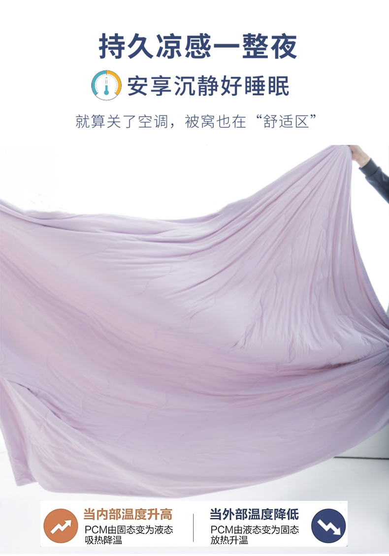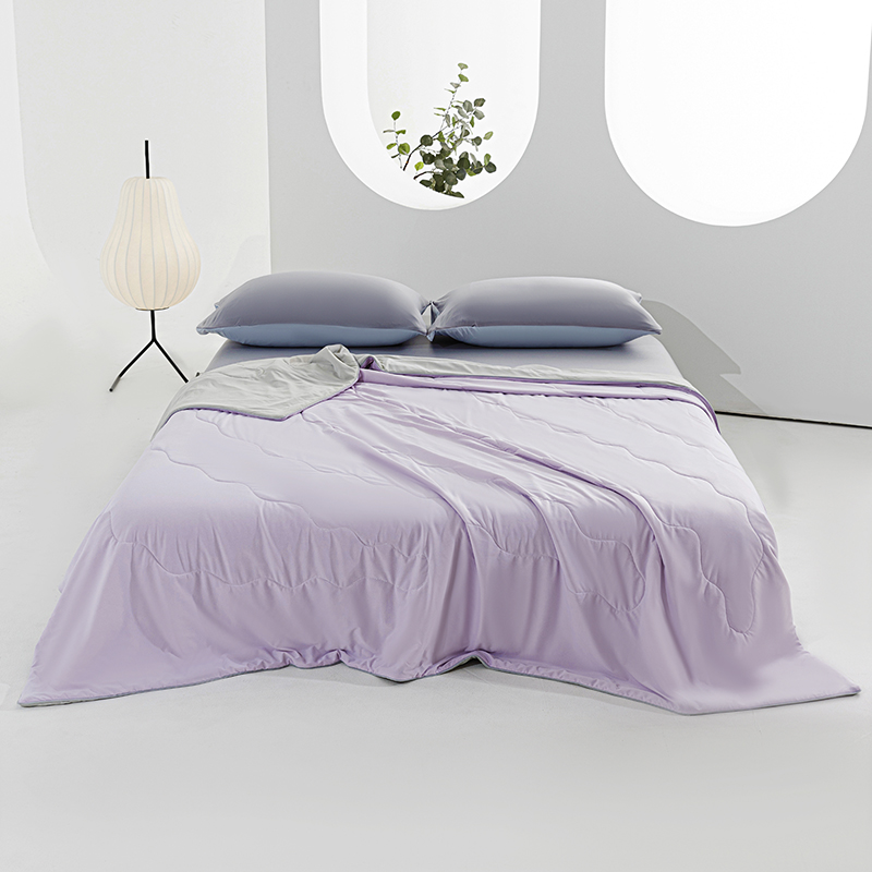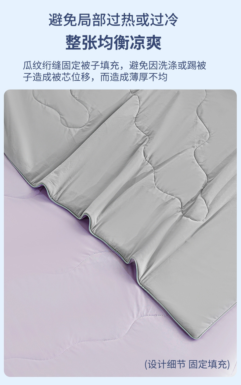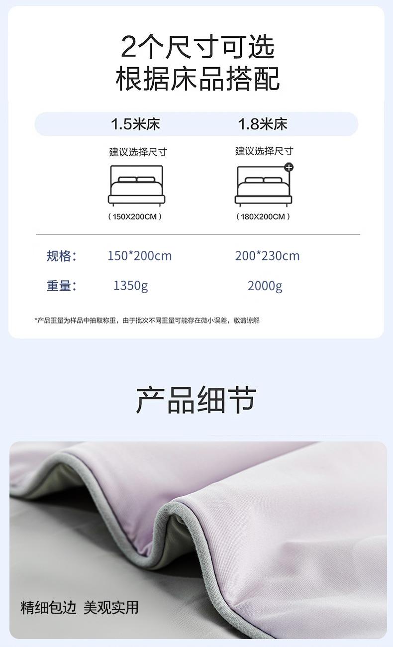 规 格:150*200cm 花 型:紫灰 面 料: 180克88%锦纶+12%氨纶凉感丝 填充物:聚酷纤维 工 艺: 定位绗缝 高定版即刻凉感黑科技,A类品质,一触即凉,躺下就凉快了Q-MAX值0.31刷新你对凉感的定义,瑜珈服般的质地非常柔软顺滑,适合所有人群,真正的科学配比聚酯纤维,优质填充 蓬松透气;时尚AB双面设计,活性印染色牢度高不易褪色,好洗易干,机洗手机均可,并经测试多次水洗 凉感值不变!波浪形绗缝,固定不结团 不移位。真正的西瓜凉,陪你度过炎炎夏日~