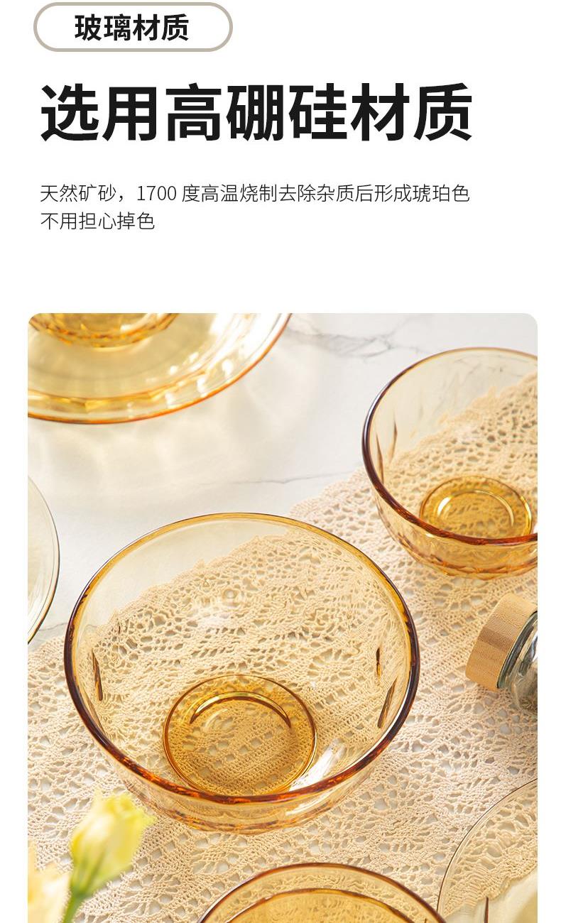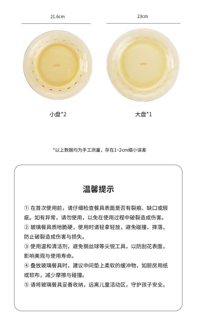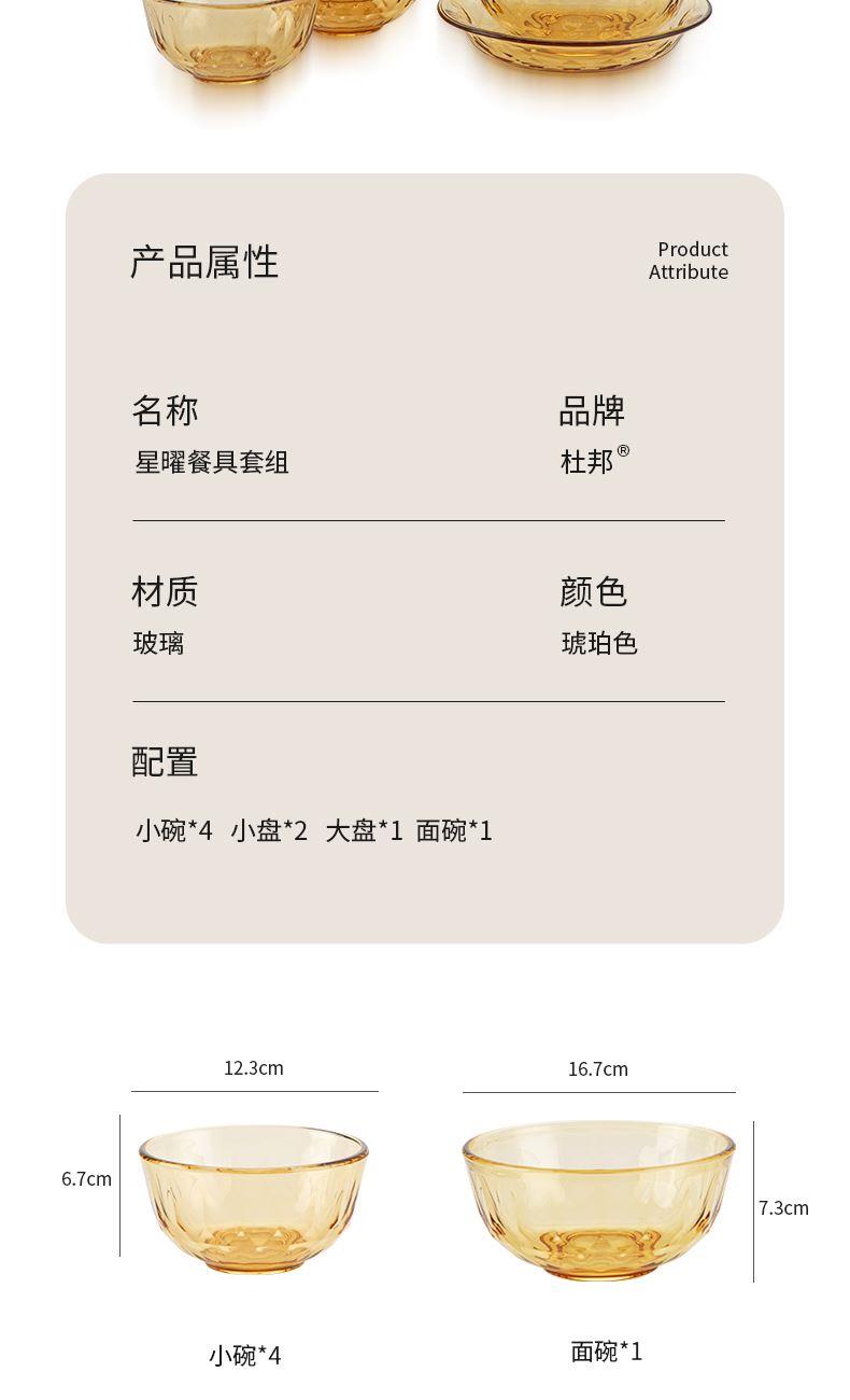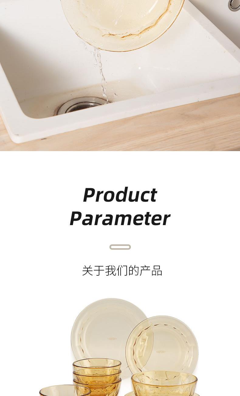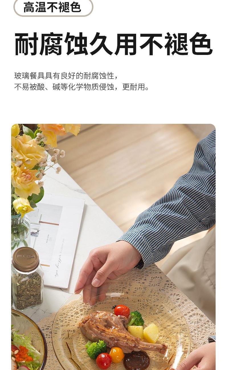 配 置:小碗*4 小盘*2 大盘*1 面碗*1 参 数:小碗12.3x12.3x6.7cm,容量450ml 大碗16.7x16.7x7.3cm,容量1000ml 小盘19.7x19.7x3.3cm 大盘23x23x3cm 颜 色:琥珀色 材 质:玻璃 1:可在微波炉,烤箱中置物使用,耐温差-2~400℃; 2:玻璃表面,容易清洗,不易藏污纳垢,不需要用钢丝球类清洁用品清洗产品; 3:高硼硅材质,天然矿砂 1700 度高温烧制去除杂质后形成琥珀色,不用担心掉色,食品安全无忧。 4:玻璃餐具的耐用性较强,正常使用情况下,其使用寿命相对较长。与一些一次性餐具或容易损坏的餐具相比,玻璃餐具能够减少因频繁更换餐具而产生的资源浪费和垃圾产生,是一种更加环保、经济的选择。
